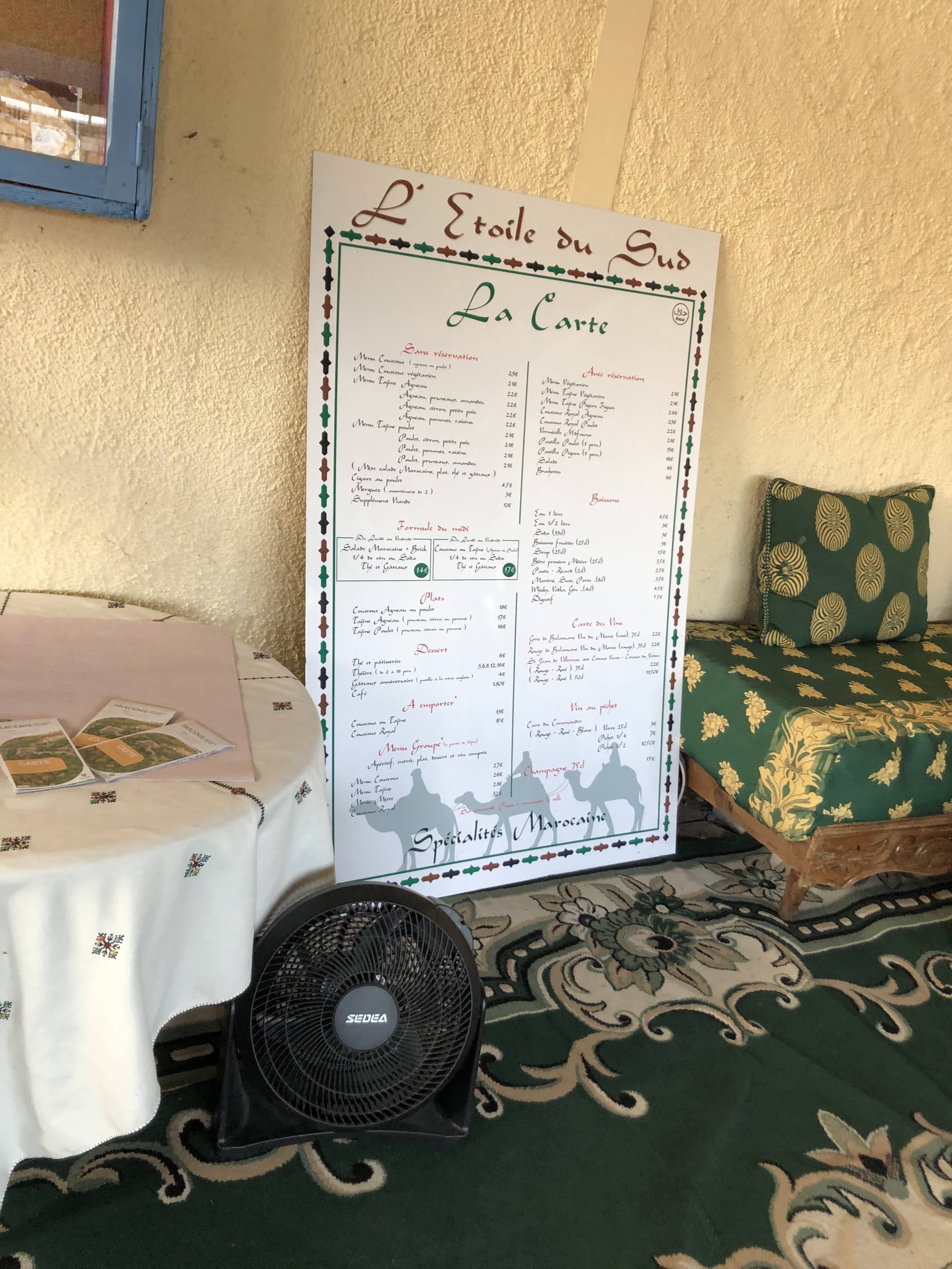 Fuillez!!! Restaurant sous une tente un peu limite, le tout pas vraiment bien agencé. Couscous sans goût, pas ressenti les épices d'un couscous, semoule trop grosse, vraiment pas top. Prix différents avec ou sans réservation, jamais vu ça ailleurs. Accueil moyen.