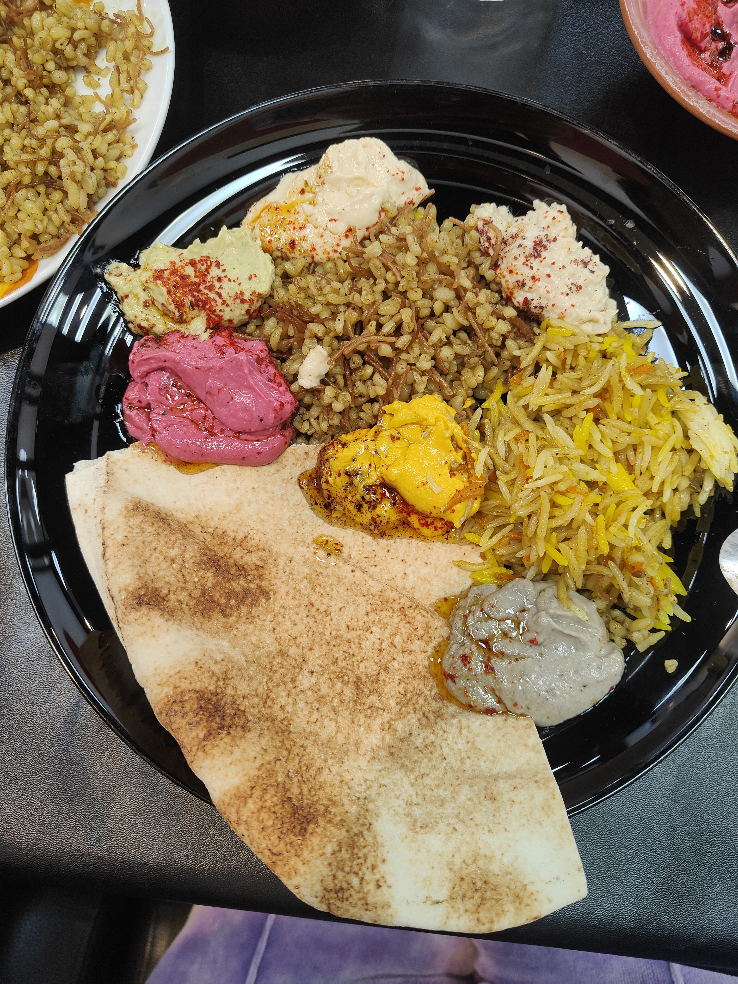 Découverte de la cuisine syrienne et vraiment pas déçue ! Ici on ne propose pas de carte c'est un plat unique avec des produits frais, une farandole de houmous avec différentes saveurs (betterave/patate douce, fenouil, caviar d'aubergine, carotte, olives noires, avocat) accompagné de leurs délicieuses Galettes de pain, de riz/blé, de taboulé, de salade et de viandes 🤤 un vrai régal je vous le conseille ! Et serveuse au top du top très gentille très serviable !