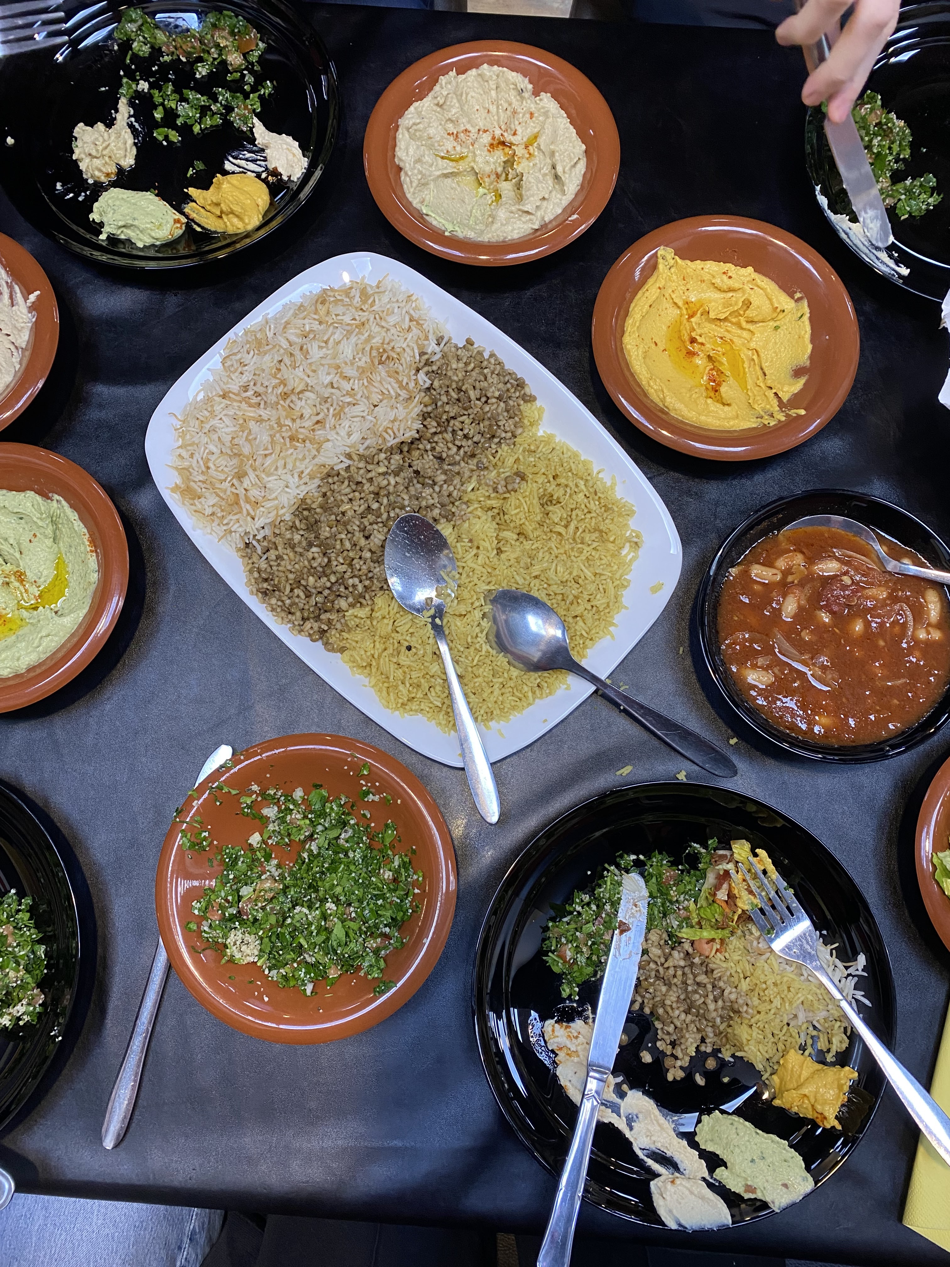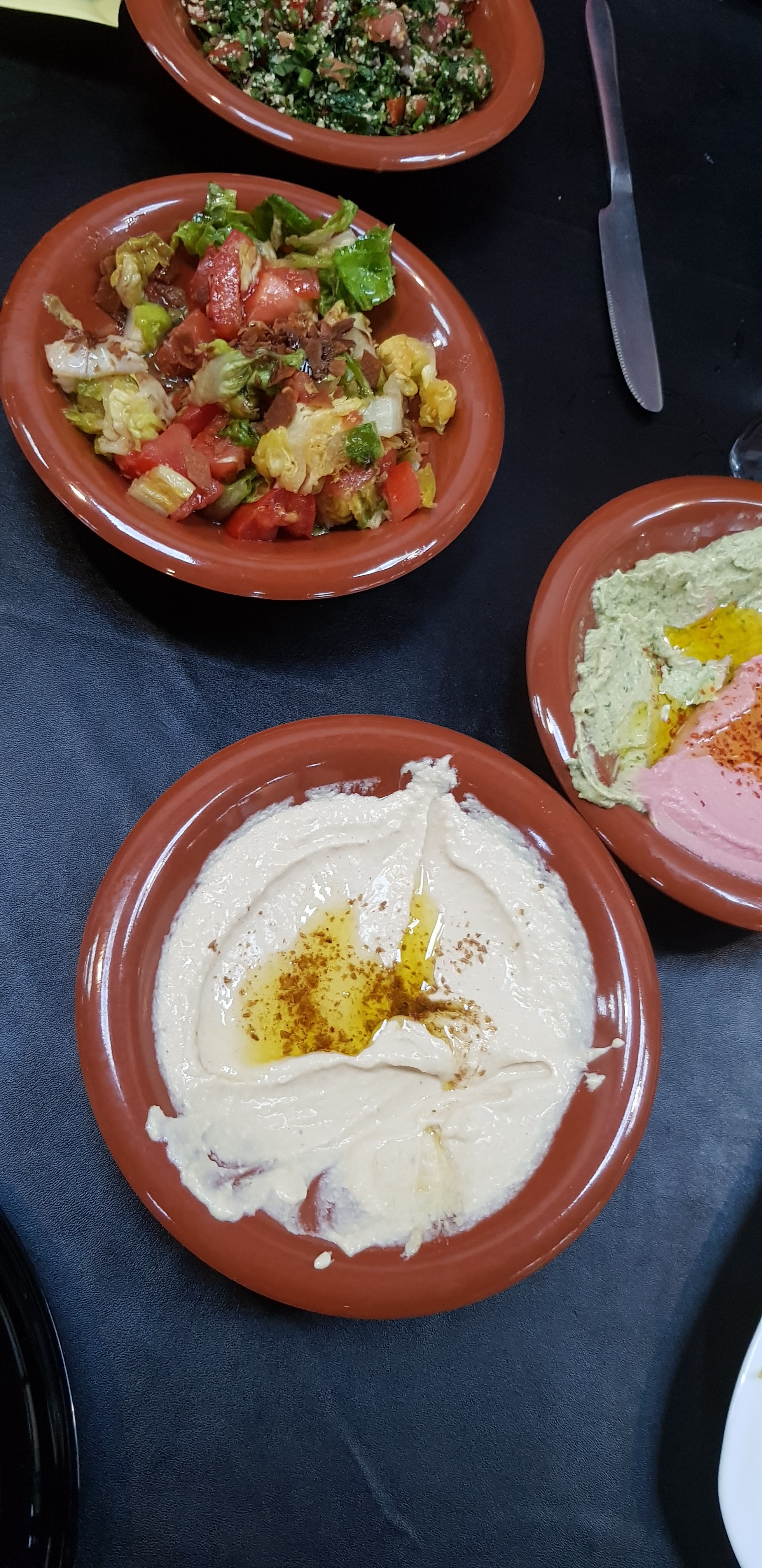 Moment très agréable passé autour du plat découverte. Taboulais et salade libanais. Poulet mariné et kefta. Grande variété d'accompagnements typiques: houmous, carottes-gingembre, betterave, caviar d'aubergines, crème aillée.