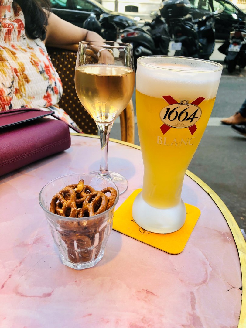 Nous étions sur le chemin de la Tour Eiffel depuis l'Arc De Triomphe et avons vu cela. C’est ça la beauté de Paris, les petits bistrots-cafés en bord de route. Vous pouvez vous asseoir, prendre quelques verres, vous détendre et continuer. Nous n'étions ici que pour quelques verres (et bien sûr pour utiliser les toilettes). Nous avons commandé de la bière pression locale 1664 Blank, du vin rosé. Il est venu avec des bretzels. Ma bière était vraiment bonne. De plus, ils servent en taille cl. Donc 50 cl = 500 ml Je pense qu'ils facturent également des frais de couverture. Je ne sais pas pourquoi. C'était le soir et nous avons apprécié notre verre, nous sommes rafraîchis et avons recommencé à voir la tour emblématique.