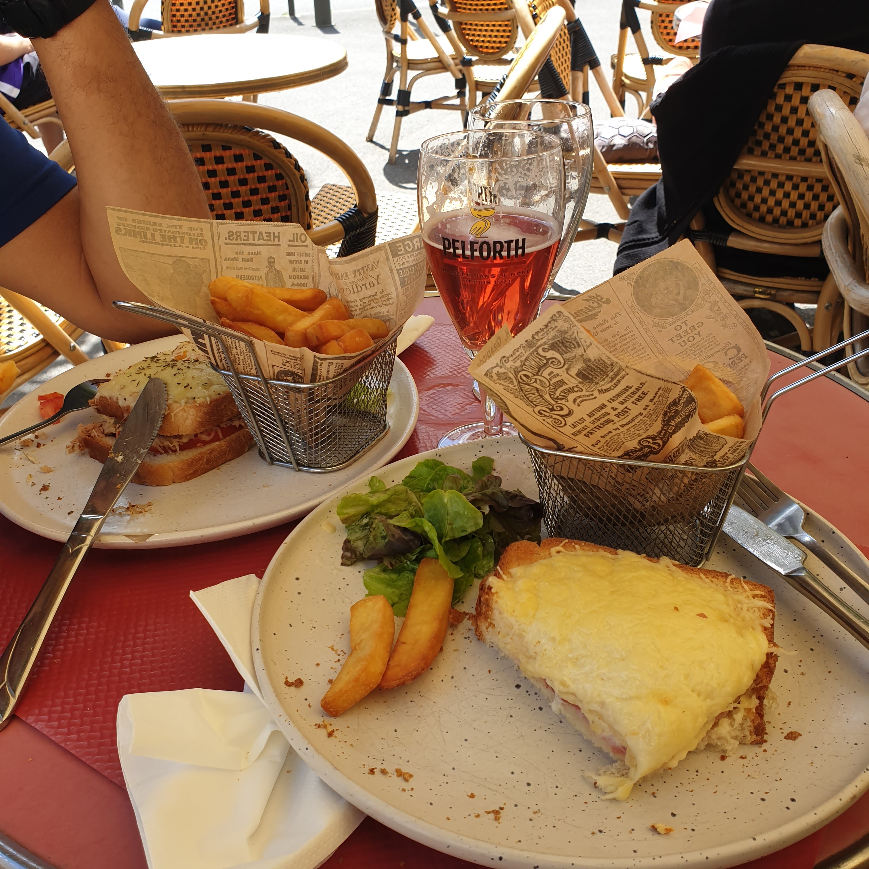 Serveur efficace et souriant. Le plat principal semble être le croque monsieur servi avec de belles frites et de la salade pour 8,50€. Malheureusement nous avons pris un steak. Énorme attente !!! Quand le plat est arrivé déception ! Frites recuites sèches et rien d’autres. Le steak semble être reconstitué de morceaux…mais bon ! Prenez un croque et vous serez rapidement servi.