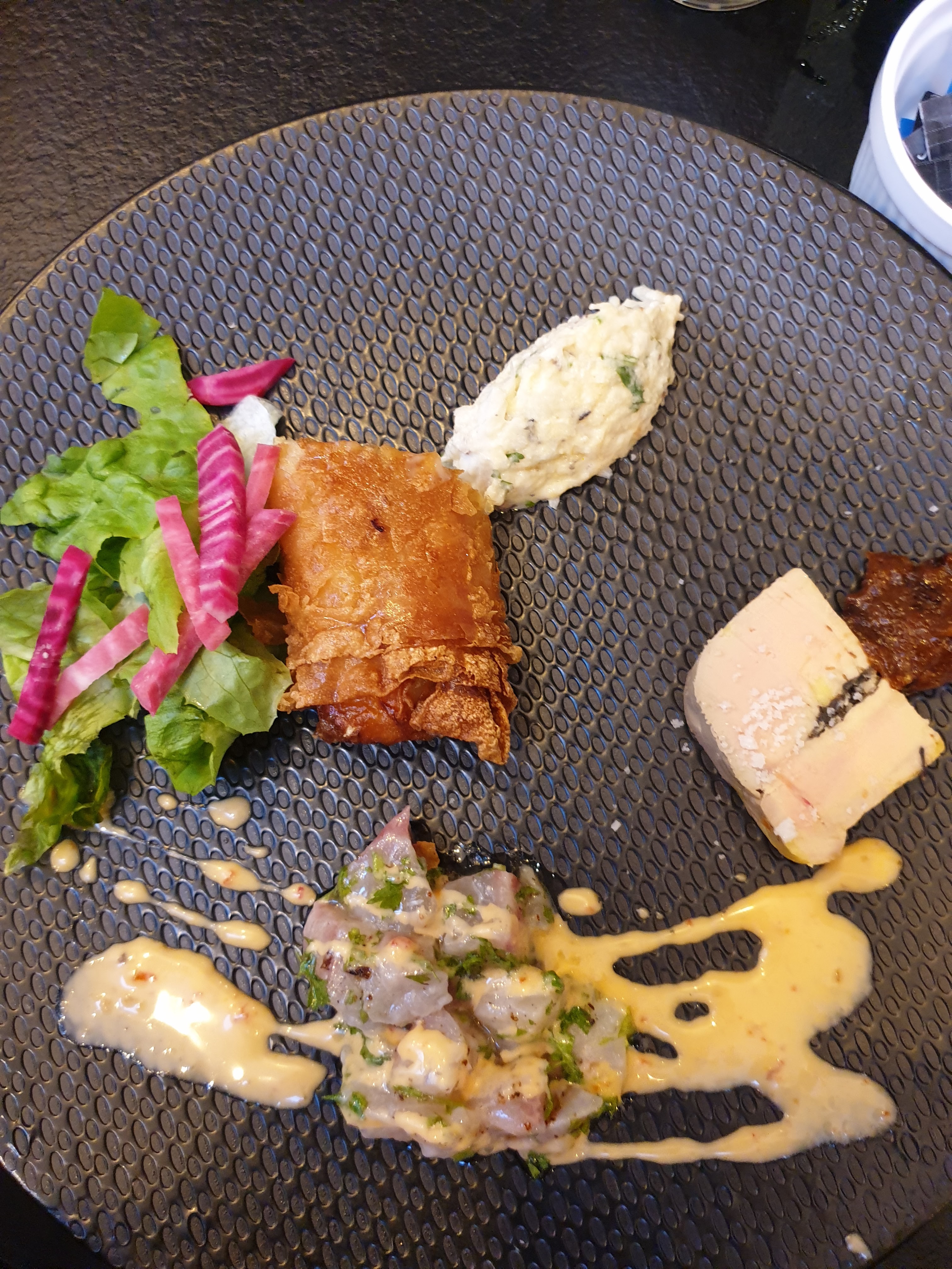 Entrée généreuse et très bonne. Plat très bon, si je dois trouver un défaut ça serait le canard trop cuit, il n'était pas rosé. Viande tendre cependant ! Les légumes qui accompagnent le bar son très bon et très bien cuisinés