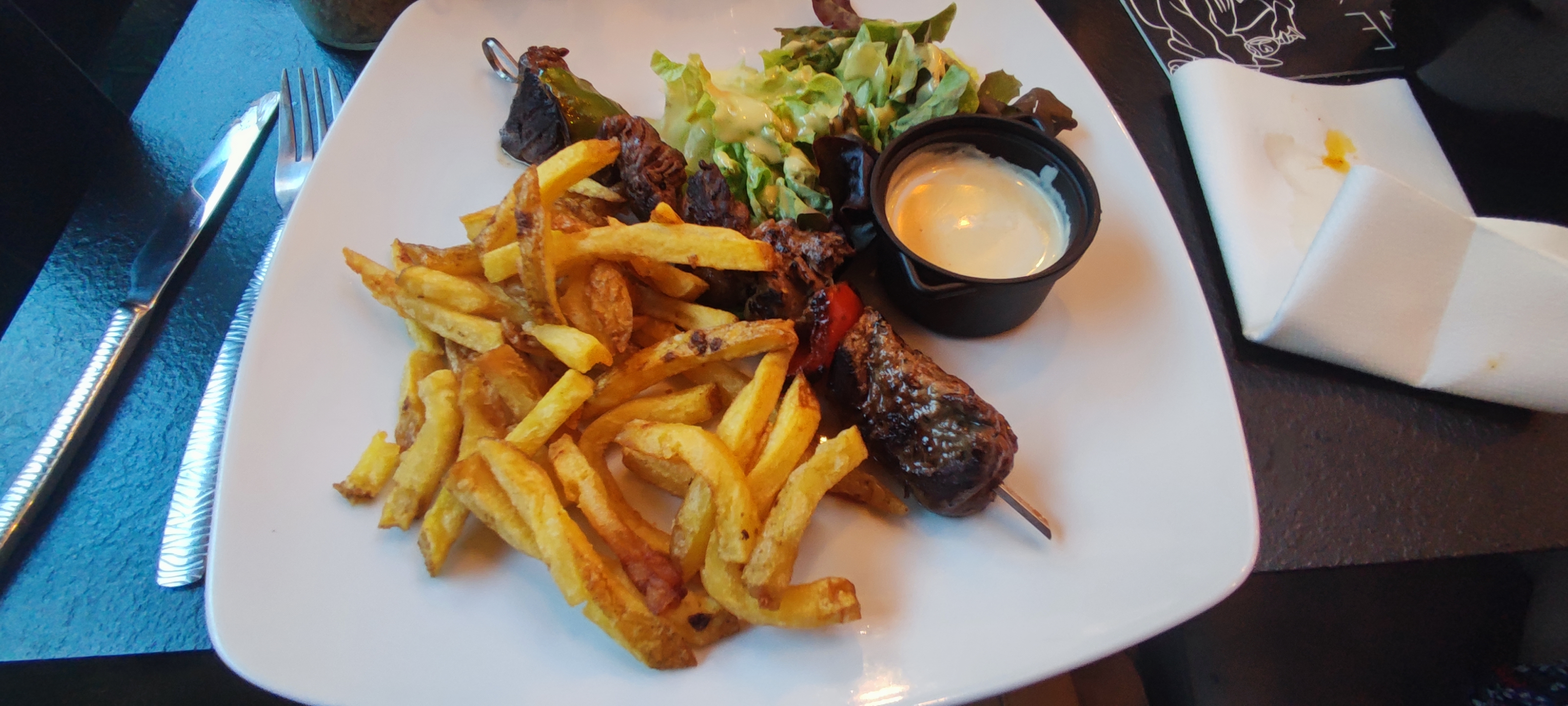 Une première dans ce resto , Suite à de bon commentaires. Cadre sympathique. Nous avions des Menus à 35€ et 28€ L'entrée : carpaccio saumon crabe était bonne, le plat: filet de bœuf frites maison.Brochettes , et tartare Bémol : le cuisinier c'est lâché sur le vinaigre balsamique de pommes 🥴 ⚠️Dommage de mettre un balsamique de pommes acidulé sur l'assiette de viandes de qualité , qui n'apporte rien au plat au contraire...☹️ Signalé à la serveuse ( sympathique) Et le tartare de boeuf un peu trop de gras, et dommage de ne pas le couper au couteau.... Dessert : brioche grillée au caramel et sa boule de glace vanille, je recommande trop bon . 😁