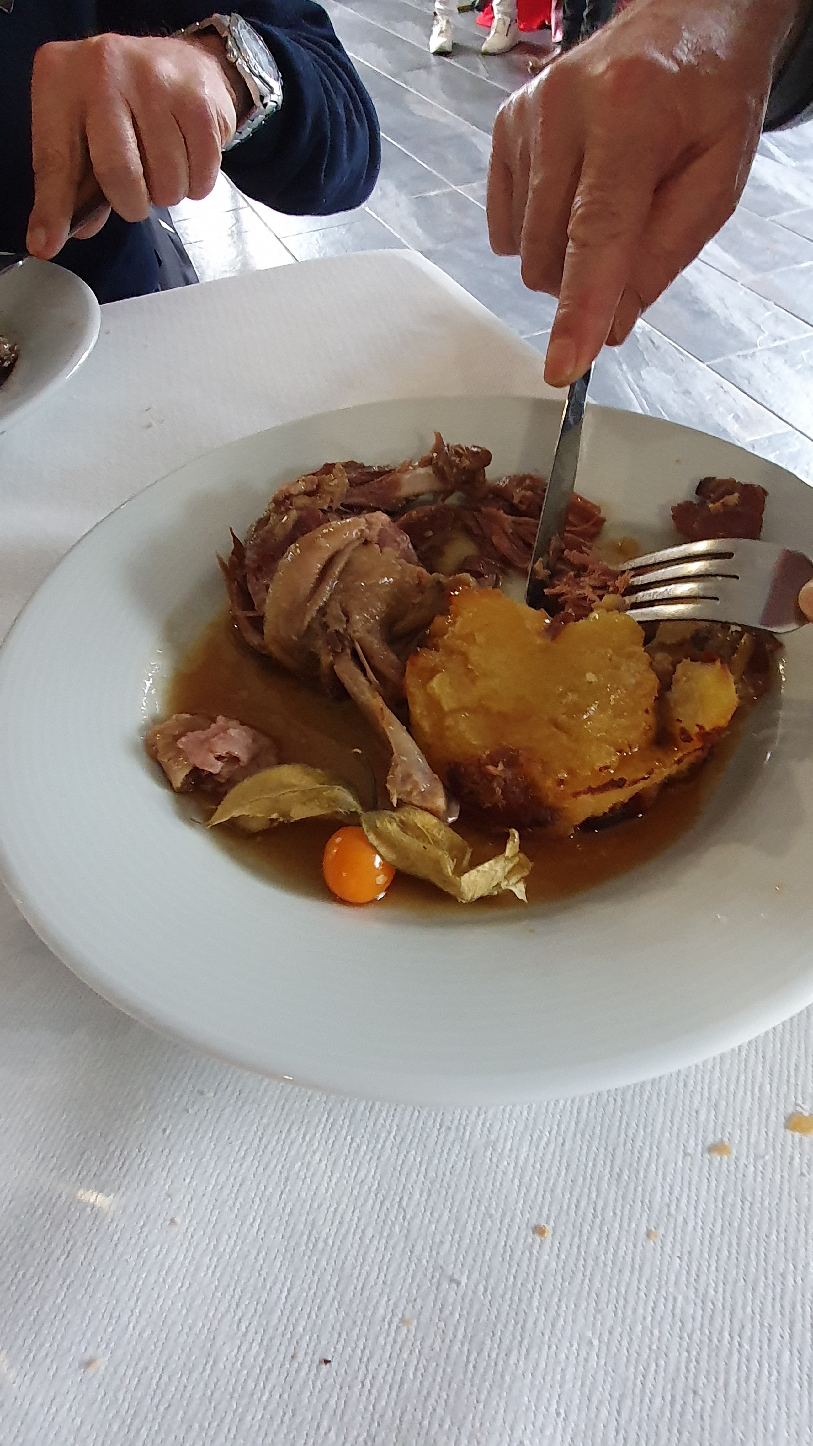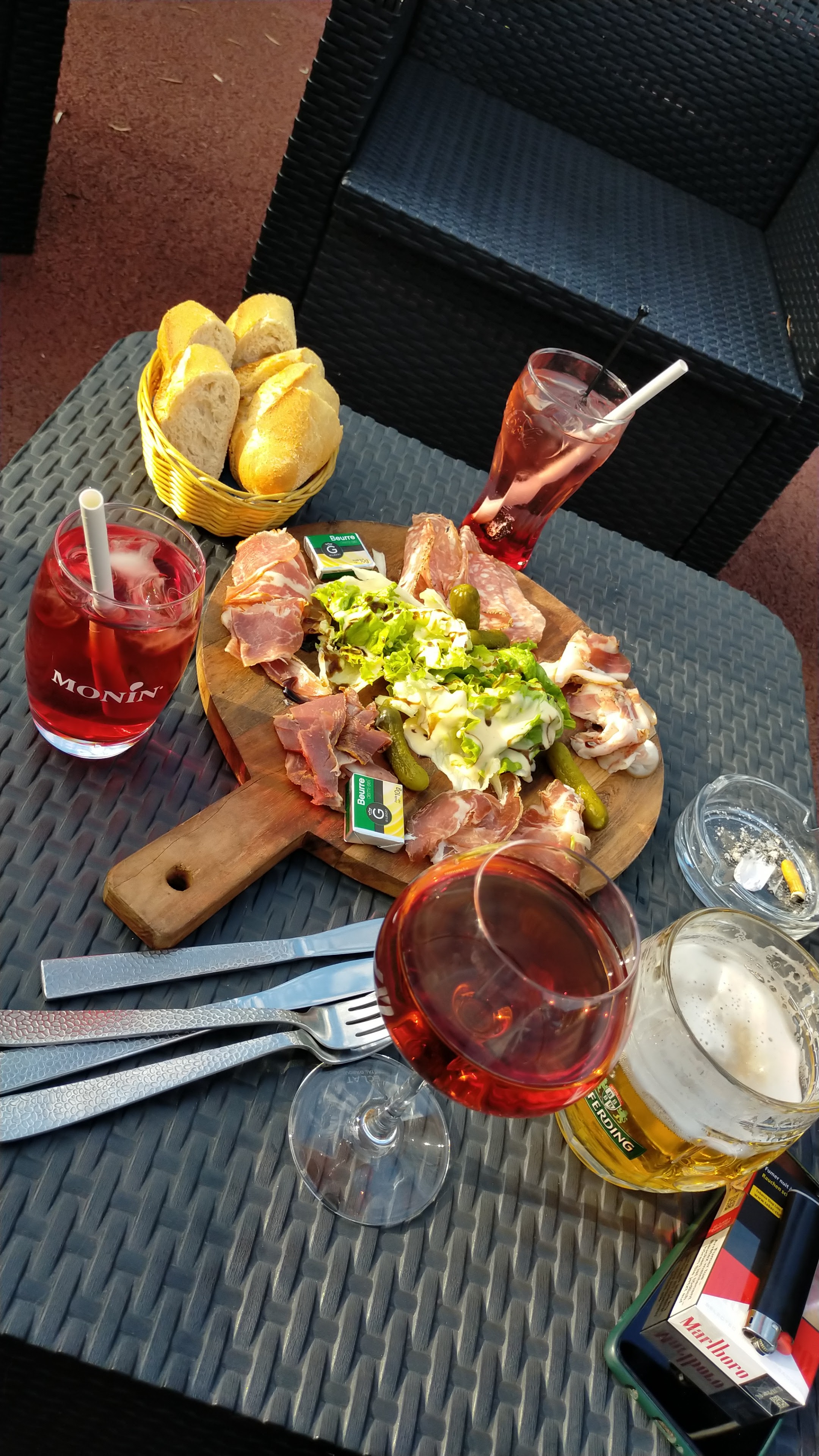 Plats froids. Vin commandé en 1/2 bouteille et servit en carafe, à quel prix ?? car pas sur la carte et peut être le reste des tables... Viande a couper avec un couteau à beurre... Heureusement la serveuse de sympathique.