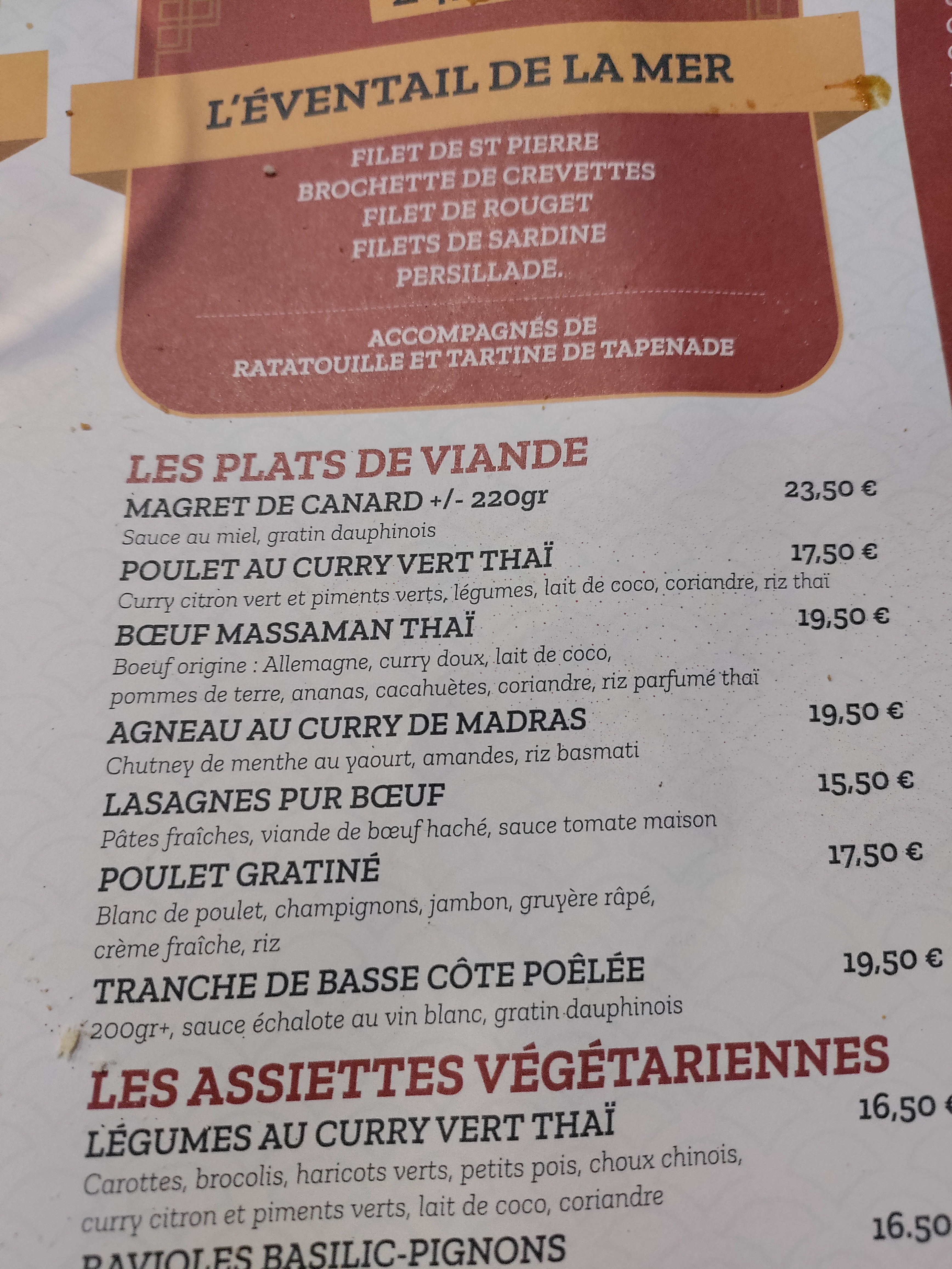 Accueil sympathique et souriant, établissement propre. Nous avons commandé du curry vert, il manquait un peu de poulet à mon goût, beaucoup de jus et des légumes congelés mais le goût du curry vert ainsi que le piquant était la. Les lasagnes nous les avons trouvés grasses et les pâtes aux fruits de mer... Proche de la mer il est dommage que cela manque de fraîcheur. Le fondant au chocolat est fait maison. Amateur de chocolat bievenu accompagné de crème anglaise ! Je vous le conseil. Dommage que le service soit un peu long mais les plats arrivent en même temps et chaud ! Ça change de certains restaurants. Recommandation : si l'équipe pouvait mettre son masque en apportant les plats ça serait le top !