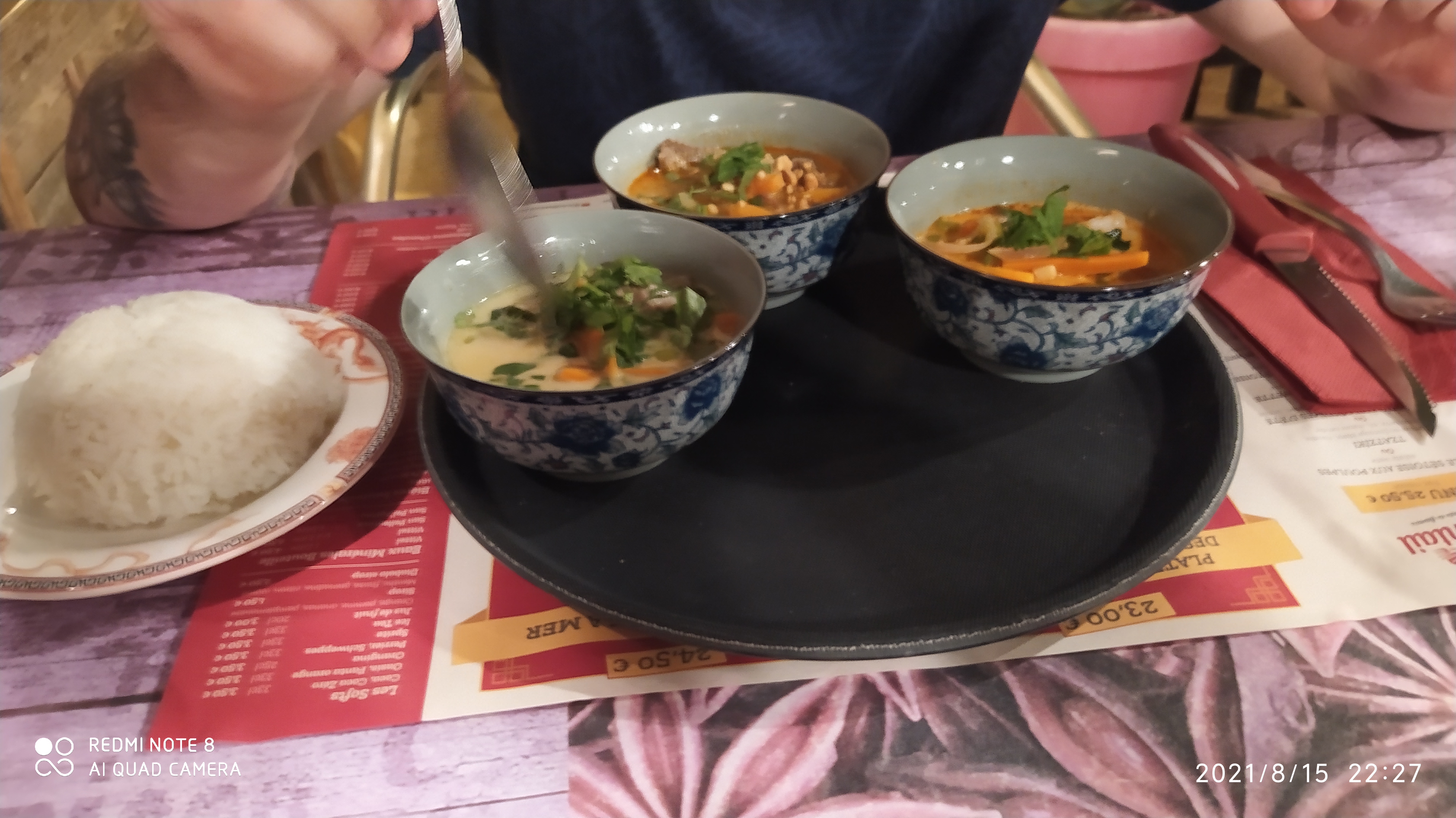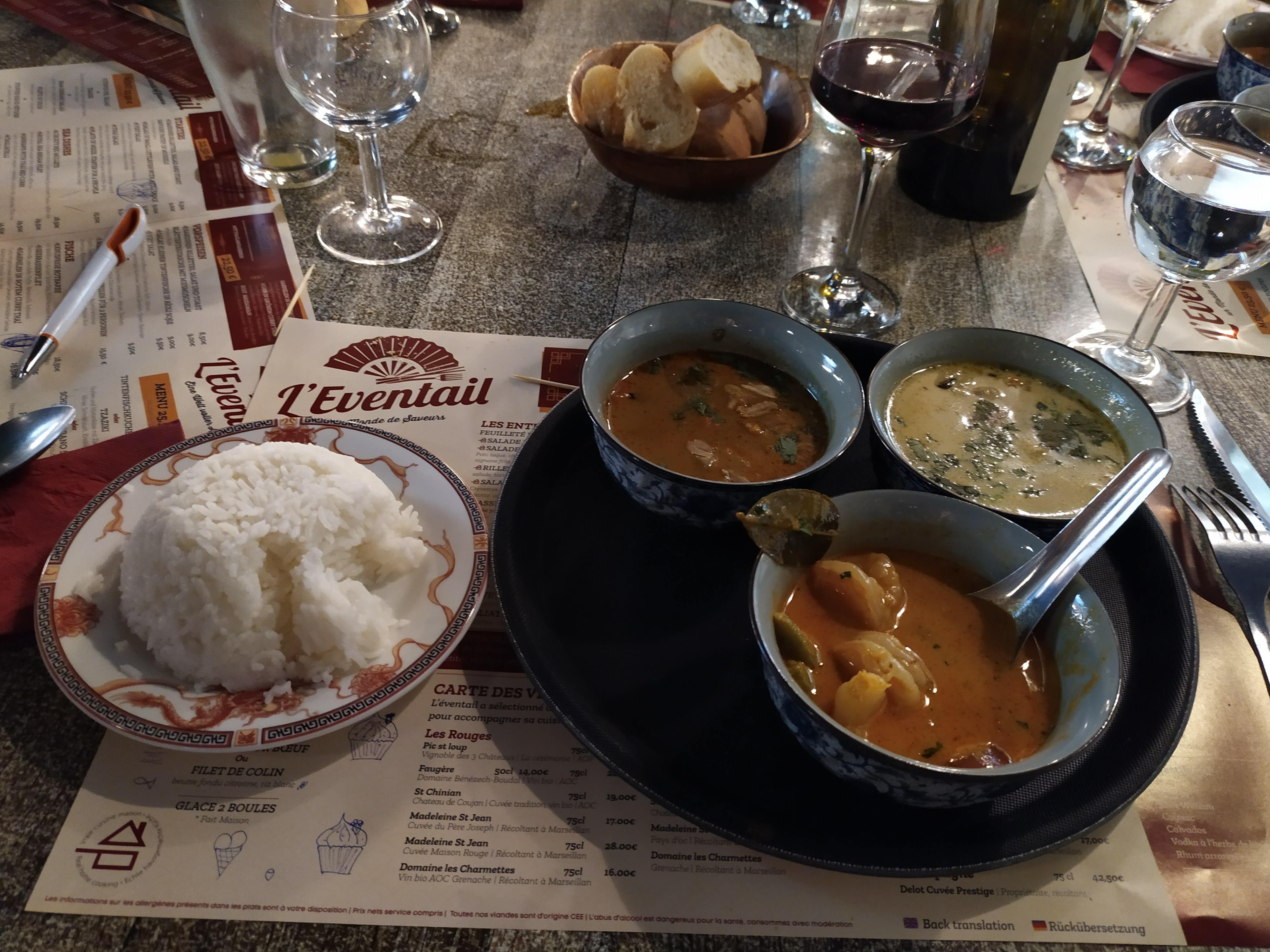 Même si j'ai pas réussi à tout finir j'ai goûter une première du curry Curry au poulet curry boeuf et curry crevette très bon Aucun regret merci encore je vous conseille