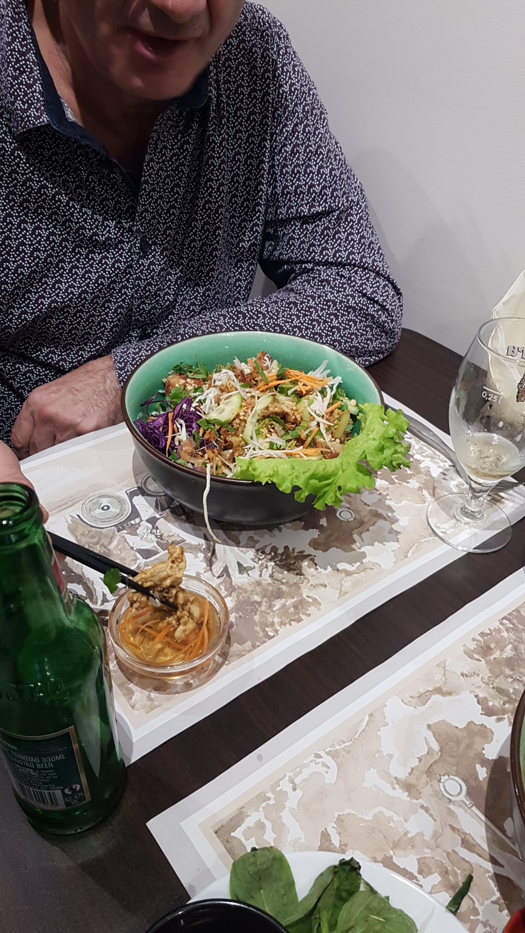 Accueil très sympathique dans ce petit restaurant vietnamien/fusion. Beaucoup de saveurs chantent (un bébé concombre sur une entrée partagée est remarquable), des portions très généreuses (ne commandez pas trop), un piquant et un zeste parfaits pour une chaude nuit d'été. Et enfin un restaurant avec du vin au picher. Merci beaucoup. Moins de 100 € pour 2 avec plateau, plats et boissons à partager. Cela en vaut la peine.