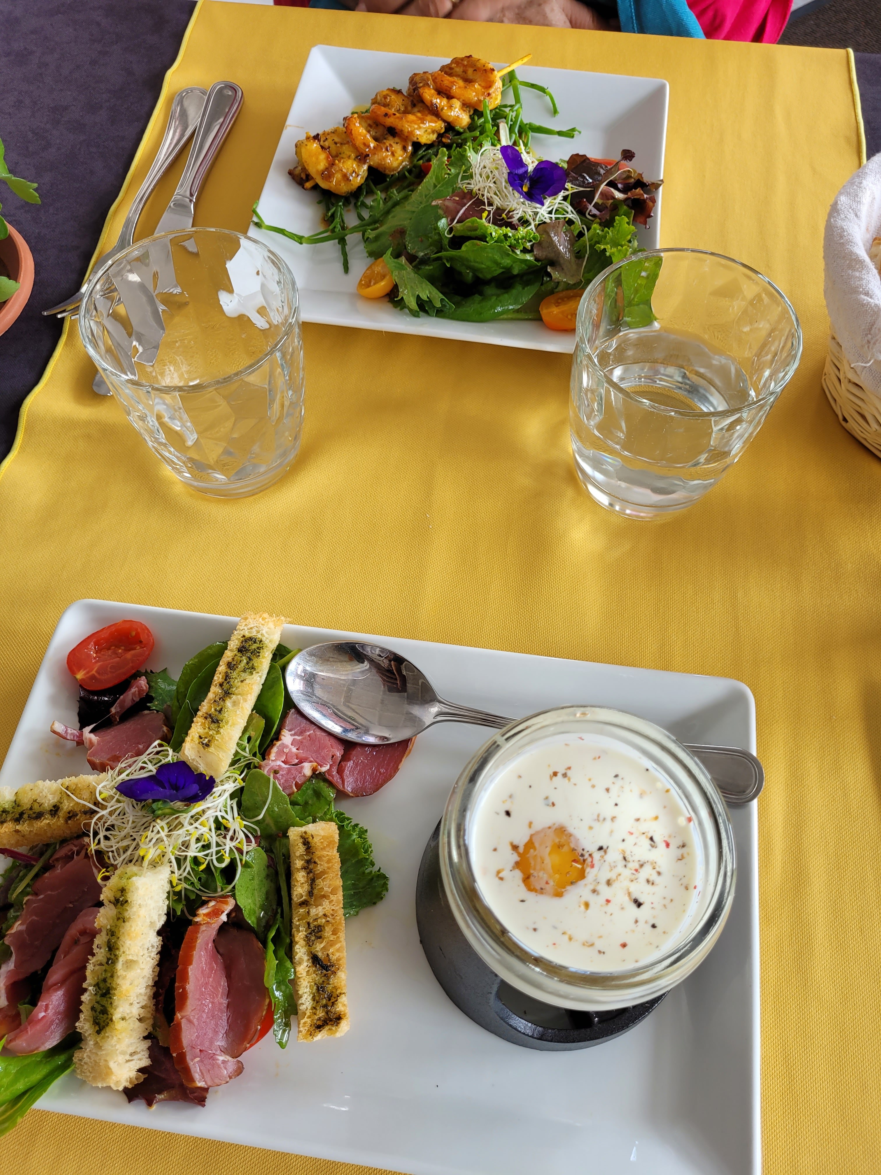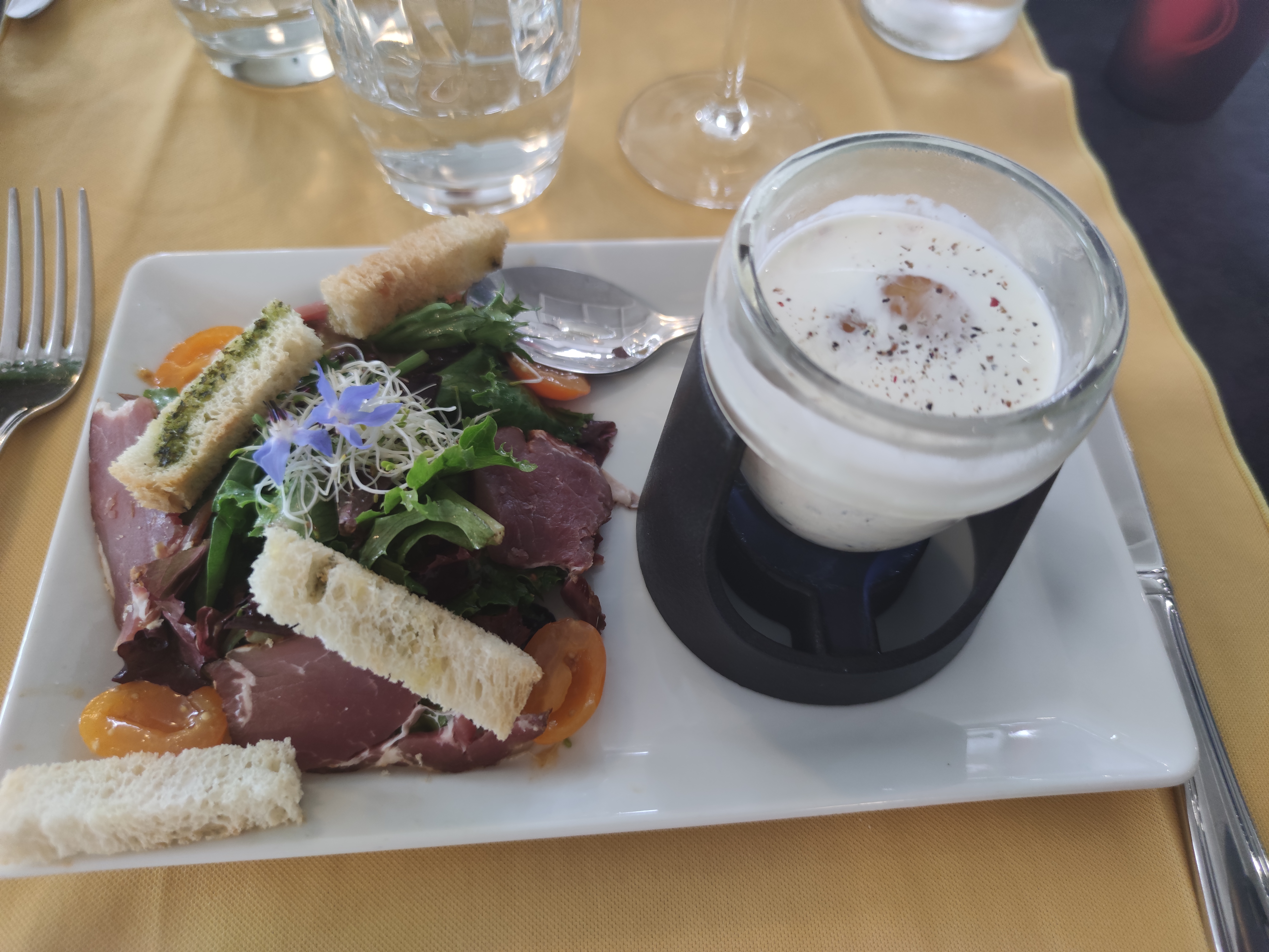 Waouh, quelle belle découverte sur la route du retour... Nos papilles n'en reviennent pas, de l'entrée au dessert c'est un festival de goût et de saveurs. L'entrée un oeuf façon meurette qui cuit tout seul devant nous (si la vidéo fonctionne vous verrez sa cuisson), j'ai oublié de prendre en photo le plat mais croyez-moi c'était un delice, pareil pour le dessert. Nos hôtesses étaient très prévenantes jusqu'à proposer au couple de motards qui était la salle de mettre un coup de nettoyage sur leur visière. Ah oui, allez découvrir le verre mystère... Nous ferons à nouveau le déplacement...
