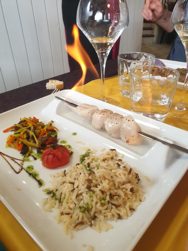 Le hasard nous a conduit à réserver à L’Evidence qui en est vite devenu une! Que dire de cette découverte, à part que c’était juste parfait de l’accueil au dessert. Un accueil agréable et chaleureux dans un décor simple et lumineux, une cuisine présentée simplement mais très raffinée au goût, des produits frais et un service agréable. Nous nous sommes délectés d’une salade au chèvre et magret fumé, d’une assiette de foie gras maison avec l’originalité de l’accompagner entre autre d’une boule de glace au pain d’épices, d’un filet de bar et d’une brochette de Saint-Jacques qui a la particularité d’être présentée cru et, que grâce à un flambage d’huile végétale on la fasse nous-mêmes cuire en la tournant dans les flammes. Et, pour finir deux glaces savoureuses une autour de la fraise et l’autre autour du nougat et du crémant. On notera le prix du menu plus que correct compte tenu de la qualité des mets servis. À faire et refaire sans modérations