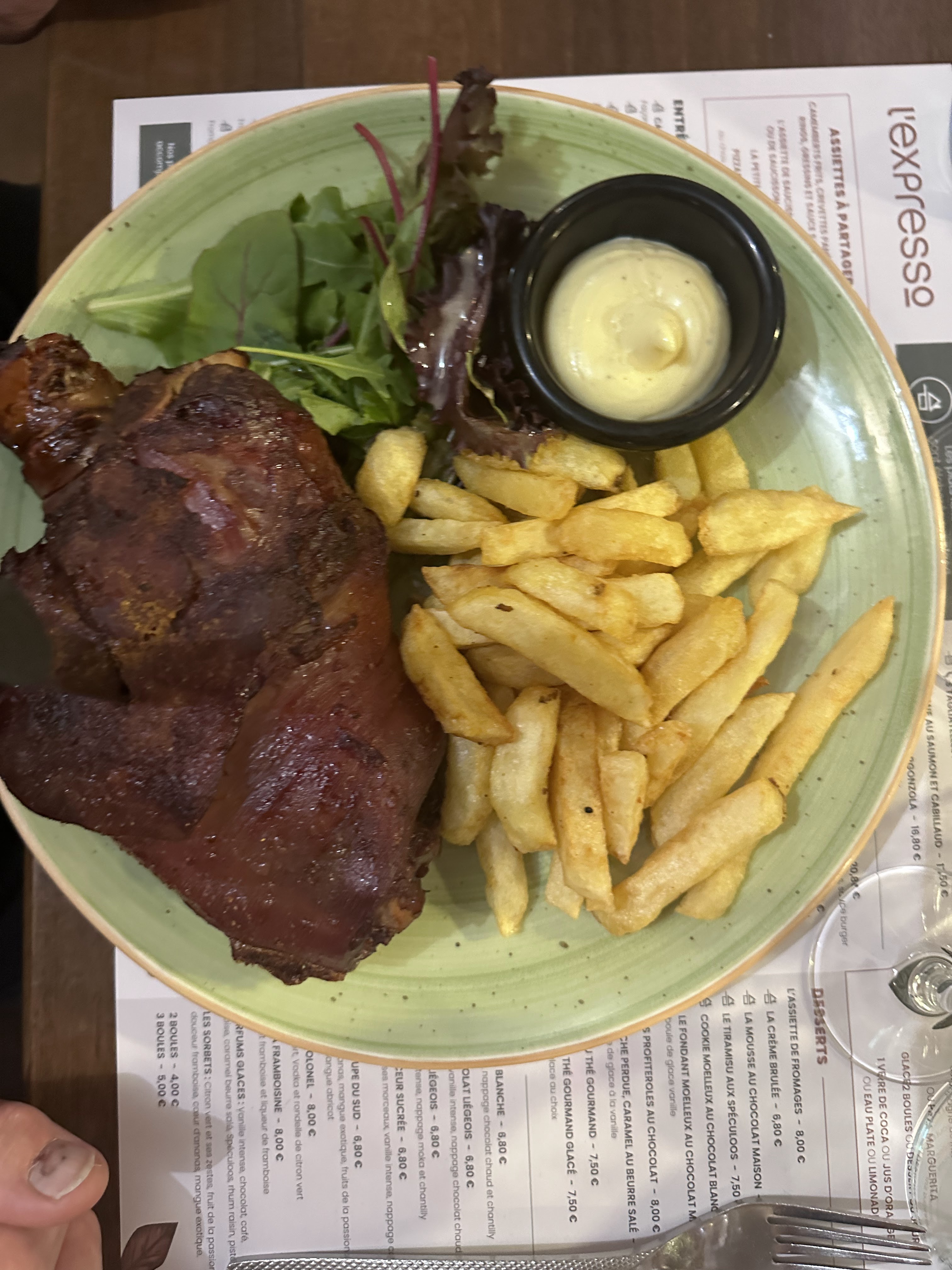 J'ai pris un pavé de cœur de bœuf... avec frites et petites sauces mayo et maroille 😍 Un DELICE, cuisson parfaite selon ma demande, prenez le beurre maître d'hôtel pour l'accompagner et vous ne serez pas déçu. Pour boire un coup, vous aurez même le droit à la Paix Dieu en pression dans cet établissement. Pour moi c'est sur, je reviendrais !