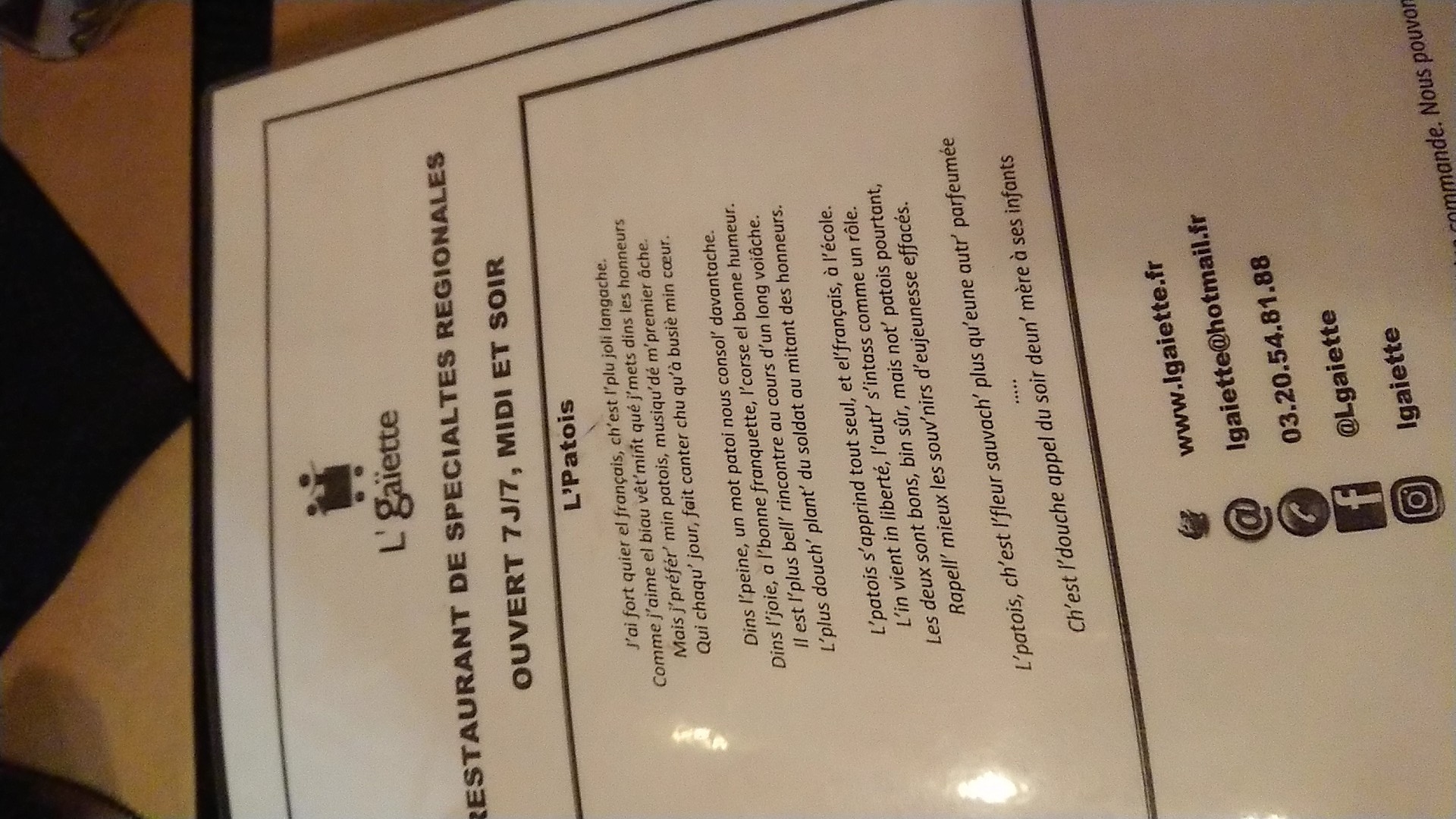 L’Gaiette n’a absolument RIEN à envier aux 4 estimanets phares de Lille (Chez la Vieille, au Vieux de la Vieille,…) : - Restaurant non surchargé : réservation pour 3 amis du soir au soir par internet (en week-end) - Qualité et rapidité des plats parfaites ! - Amabilité et Courtoisie du service d’Arthur incroyables ! - Pas + cher qu’ailleurs Nous reviendrons sans hésiter pour passer à nouveau une super soirée, MERCI 🙏🏼