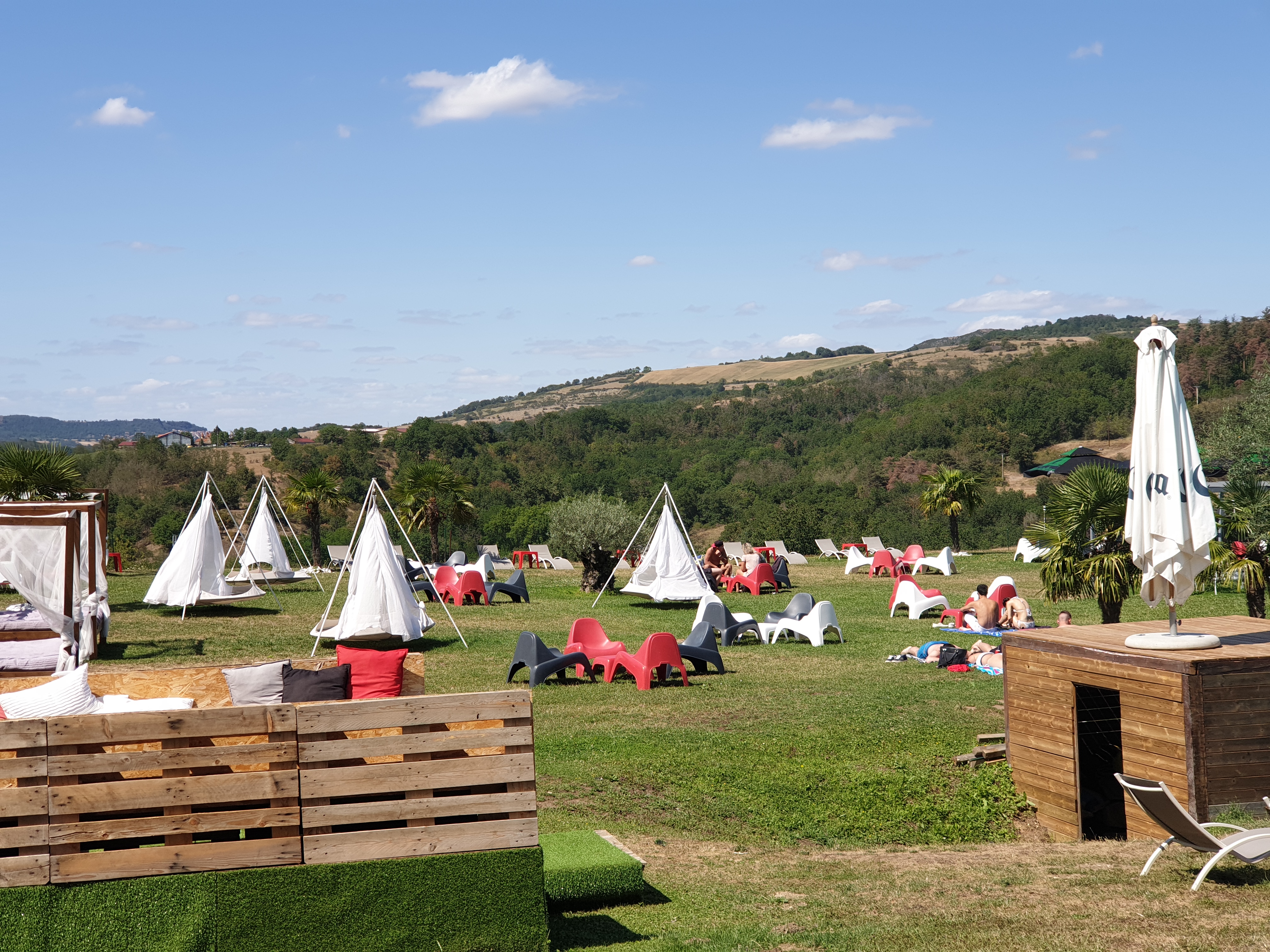 Vous voyez un beach club ? C'est la même sans la mer et le sable. Une piscine encadrée par un jardin cet spacieux, avec lits de plage et bain de soleil, Petites tables pour apéro ou verres entre amis ou encore le restaurant (je n'ai pas eu l'occasion d'y manger). Atypique pour la région 😉