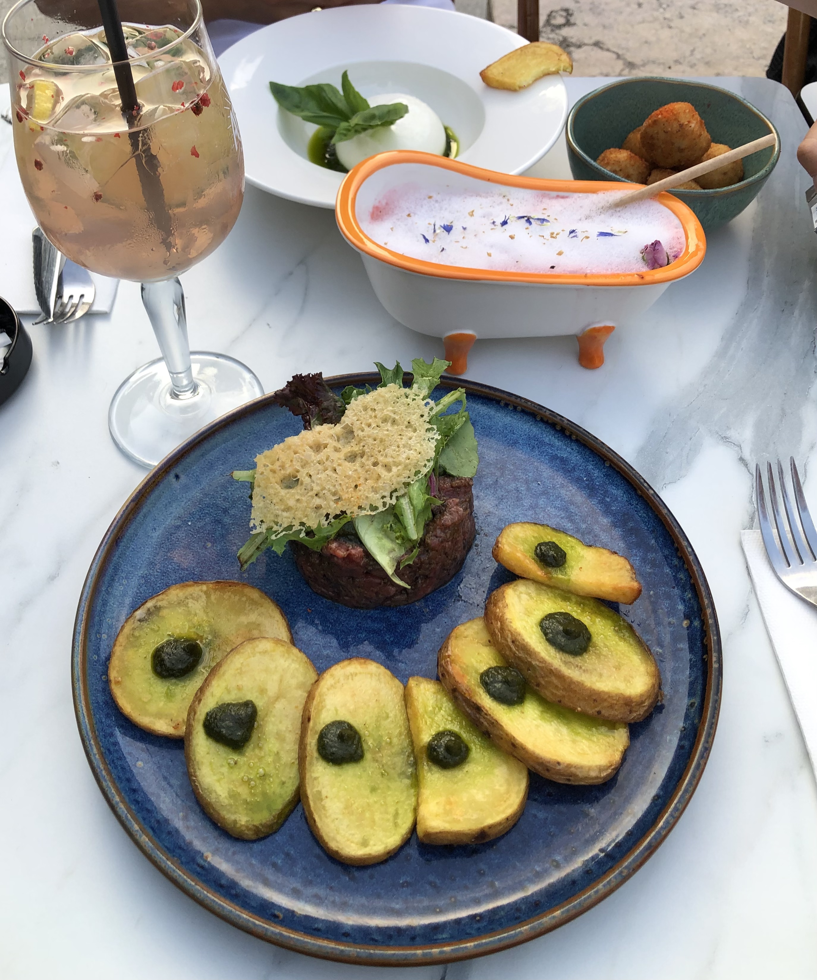 C’est dommage, le tartare n’a aucun goût sauf celui de l’huile de truffe, une burratta qui ressemble à une mozzarella de chez carrefour, une bouteille d’eau pétillante à 7€ et des pigeons qui mangent le pain qui est ensuite servi à table. Il y a de très bonnes tables juste à côté.