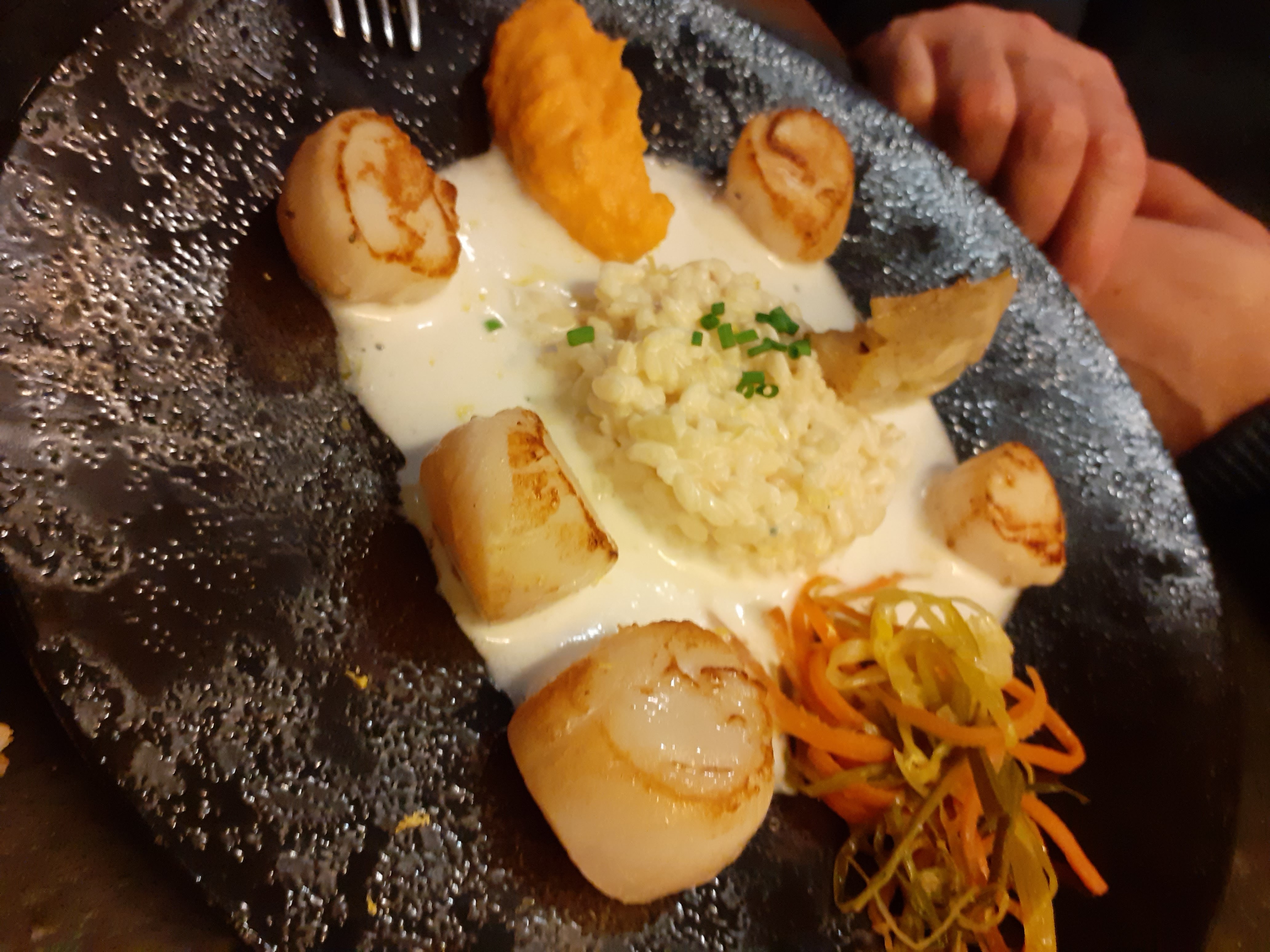 Escargots à la charantaise (révisité, c'est pas une sauce aux lumas), ravioles de ste maure et pommes, rognons, st Jacques avec un service efficient et une belle découverte avec le conseil du vin. Une belle assiette de 4 fromages et un dessert (je ne suis pas très sucré). Nous avons passé un bon moment