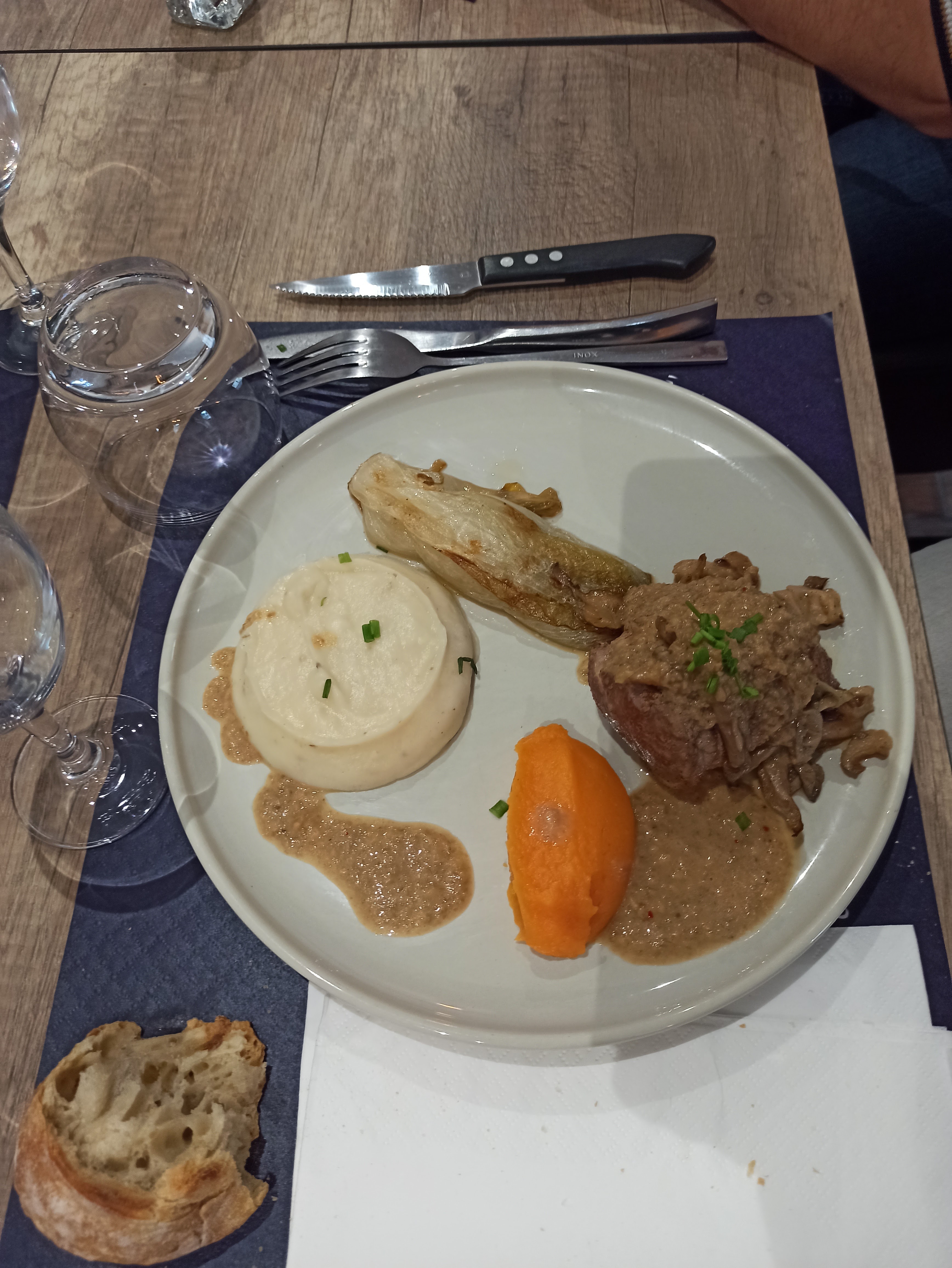 Tout simplement parfait ! Oeuf mollet, foie gras et trompette de la mort pour commencer étaient tout simplement délicieux Grenadin de veau, sauce au chorizo avec purée de patates douces et petits legumes parfait, une viande tendre et bien marquée de chaque côté Enfin le gourmand avec sa crème brûlée, fondant au chocolat et compotée d'abricot a la vanille a parfaitement achevé ce repas. Les quantités sont parfaites pour repartir sans avoir faim et sans se sentir gonflée. Bref un moment encore une fois très agréable, nous reviendrons !