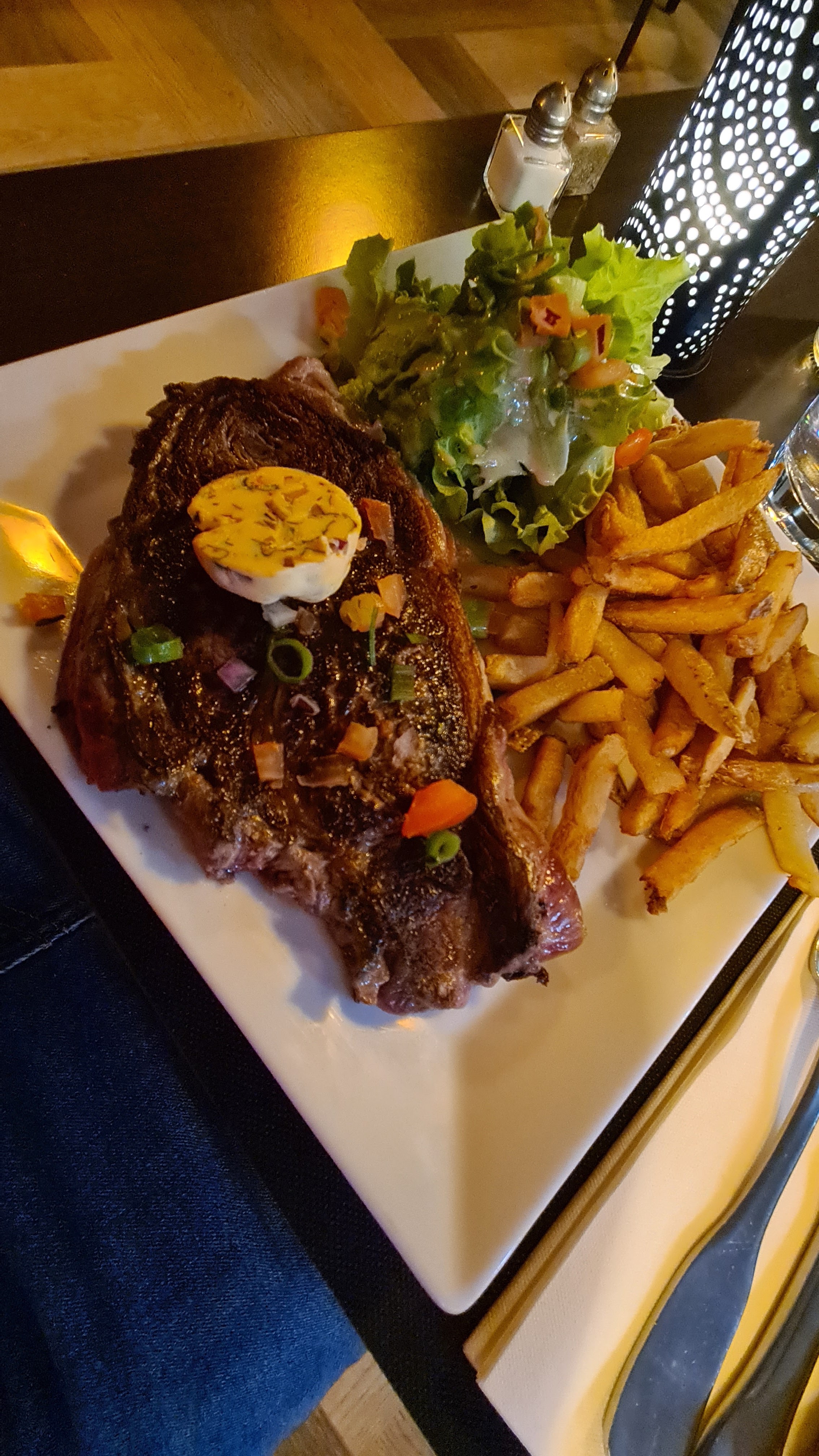 Très bonne entrée de viandes mélangées, certainement assez grande pour deux, le steak était ok. Si vous n'êtes pas français, assurez-vous de commander le steak en conséquence. Moyennement rare est rare pour le reste d’entre nous. Pas de musique de fond ni de bougies donc le lieu n'avait pas d'ambiance ambiante. Pas romantique. Chiens autorisés.