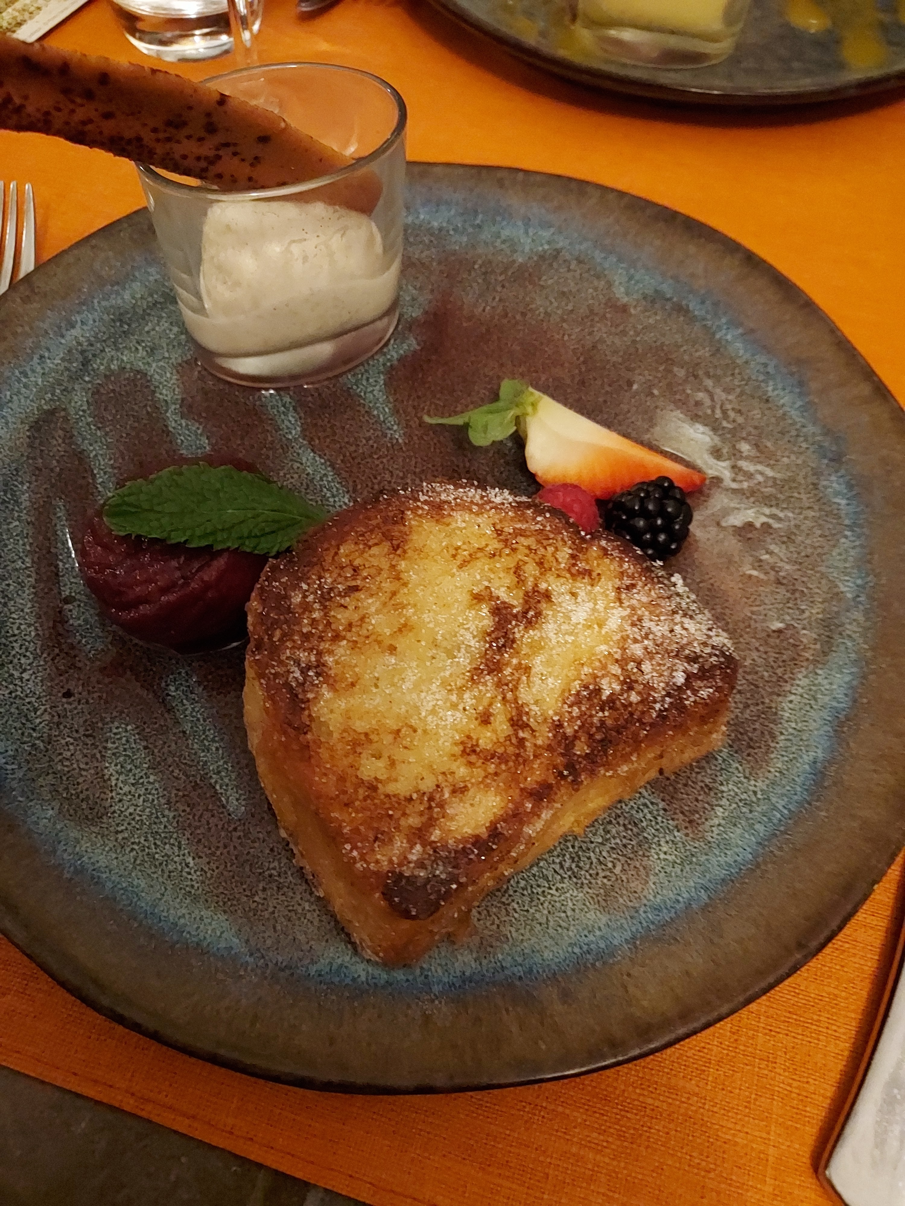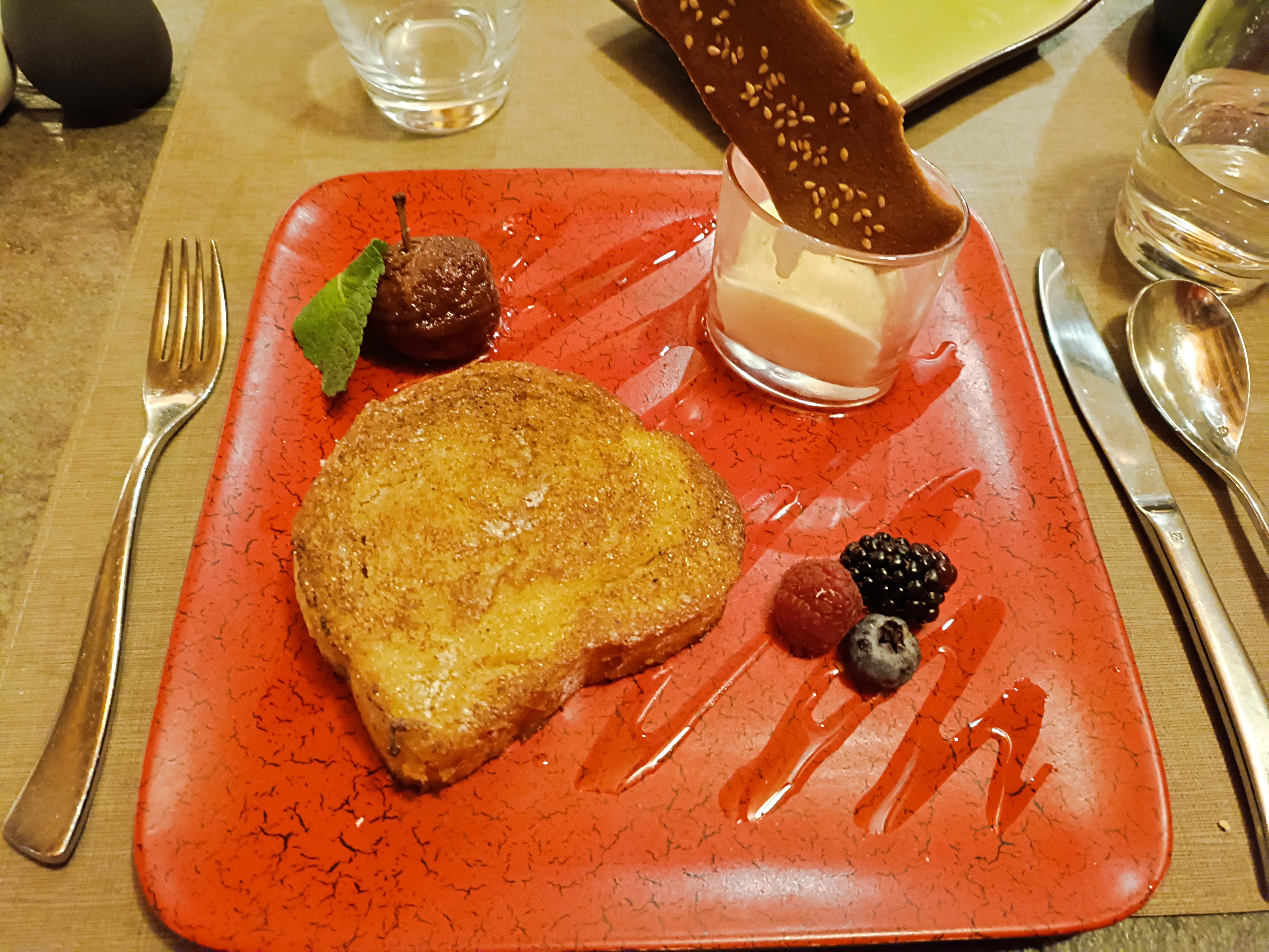 Très bon moment personnel agréable et disponible bien qu il y ait eu de l attente entre les plats. Dessert avec pain perdu excellent ! Bémol sur le plat végétarien où la texture est principalement pâteuse peut être proposer une sauce autre que de l huile et retirer les pommes de terre ? Cadre troglodyte ravissant.