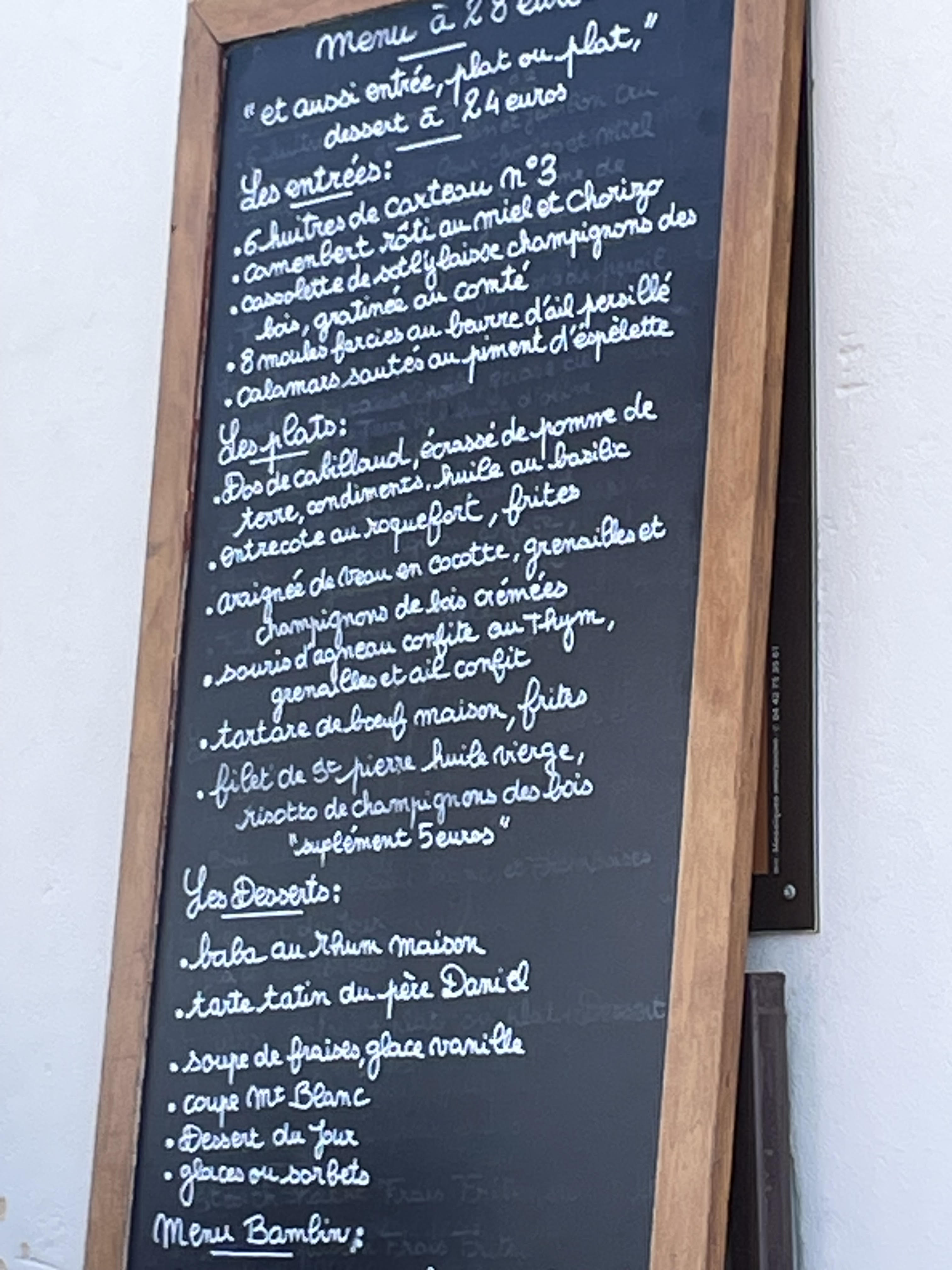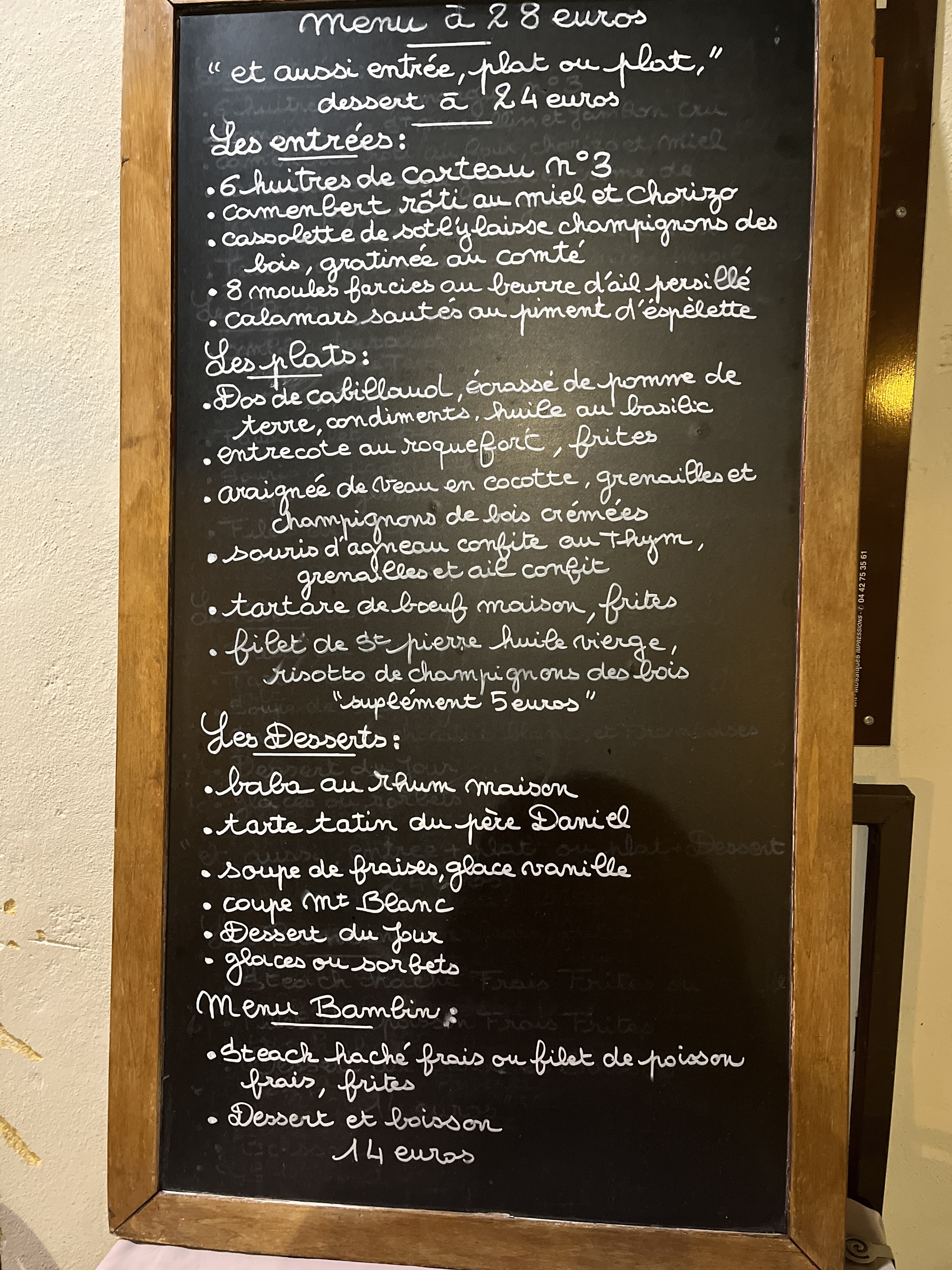 Nous avons pris le menu à 25 euros proposé par le patron, ďéçus car ça ne les valait pas. De plus on a payé 12 euros un demi pichet de rosé ça fait mal..... Beaucoup trop cher...tant pis ! Bye bye..
