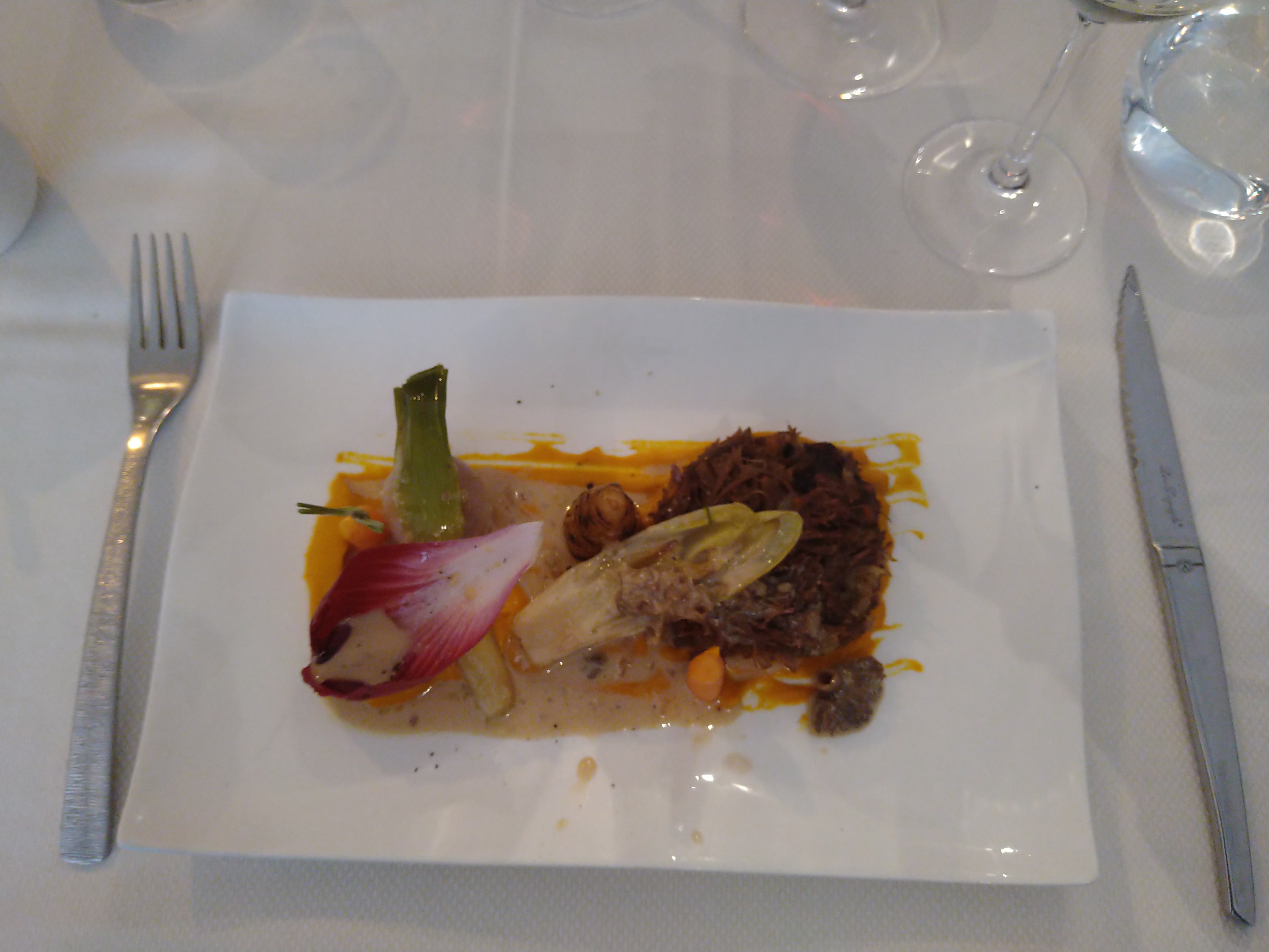 Quelques approximations techniques, temps faible sur un dessert peu inspiré (fraises/chocolat blanc), carte des vins insuffisamment détaillée (à ce niveau, il n'est pas possible de se limiter à la mention de l'appellation). Pour le reste c'est un bon établissement avec une marge de progression intéressante, des produits de qualité et une envie de bien faire louable. Une mention particulière pour le service, efficace et agréable.