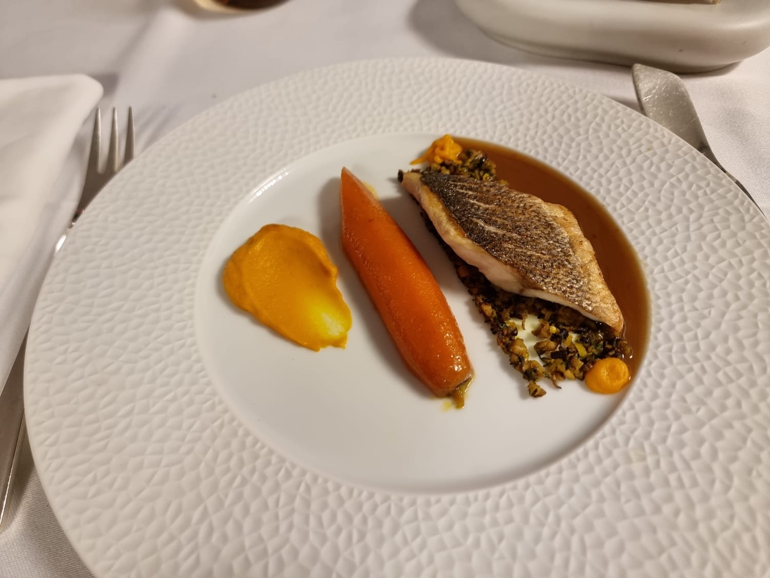 cuisine très fine , en revanche au niveau de l'accueil et du service le serveur a besoin d'être encadré; les couverts à entremets auraient toute leur place pour profiter du coulis; traverser la salle en tenant les bouteilles par le goulot manque de raffinement.