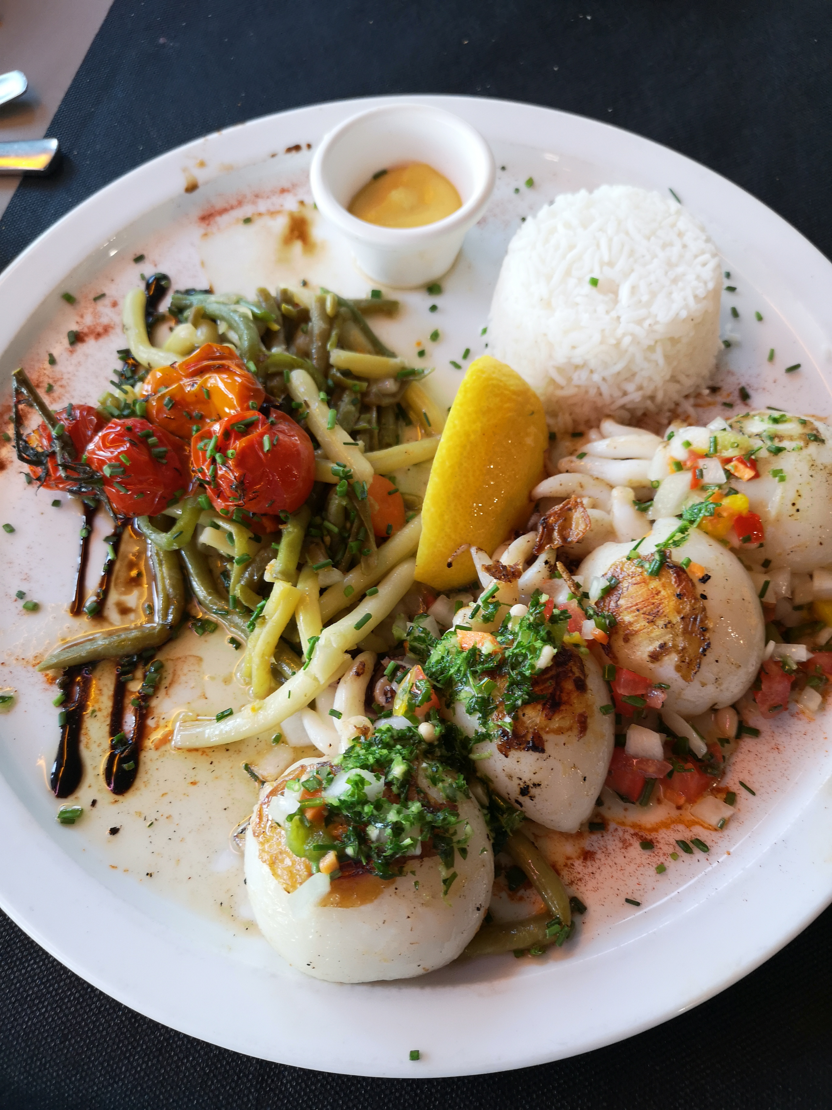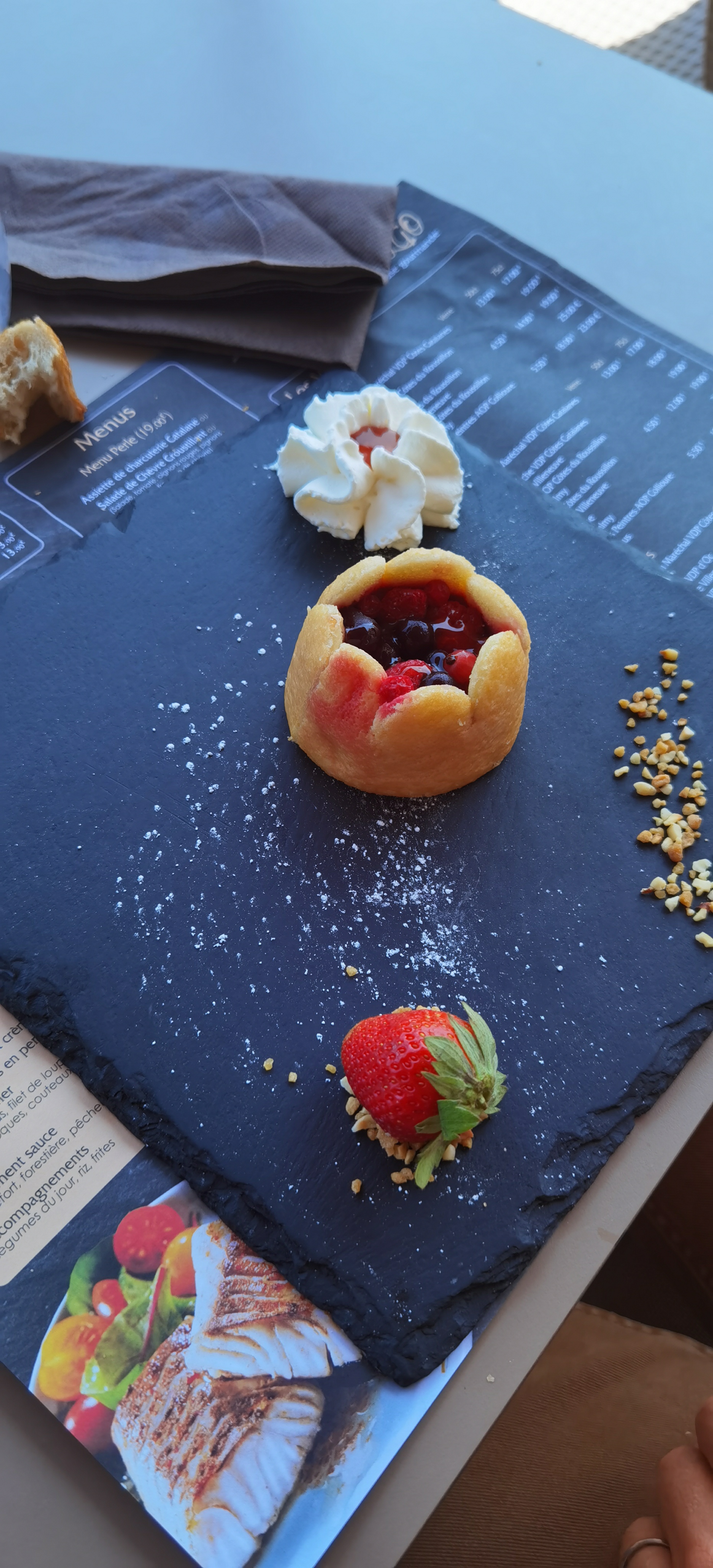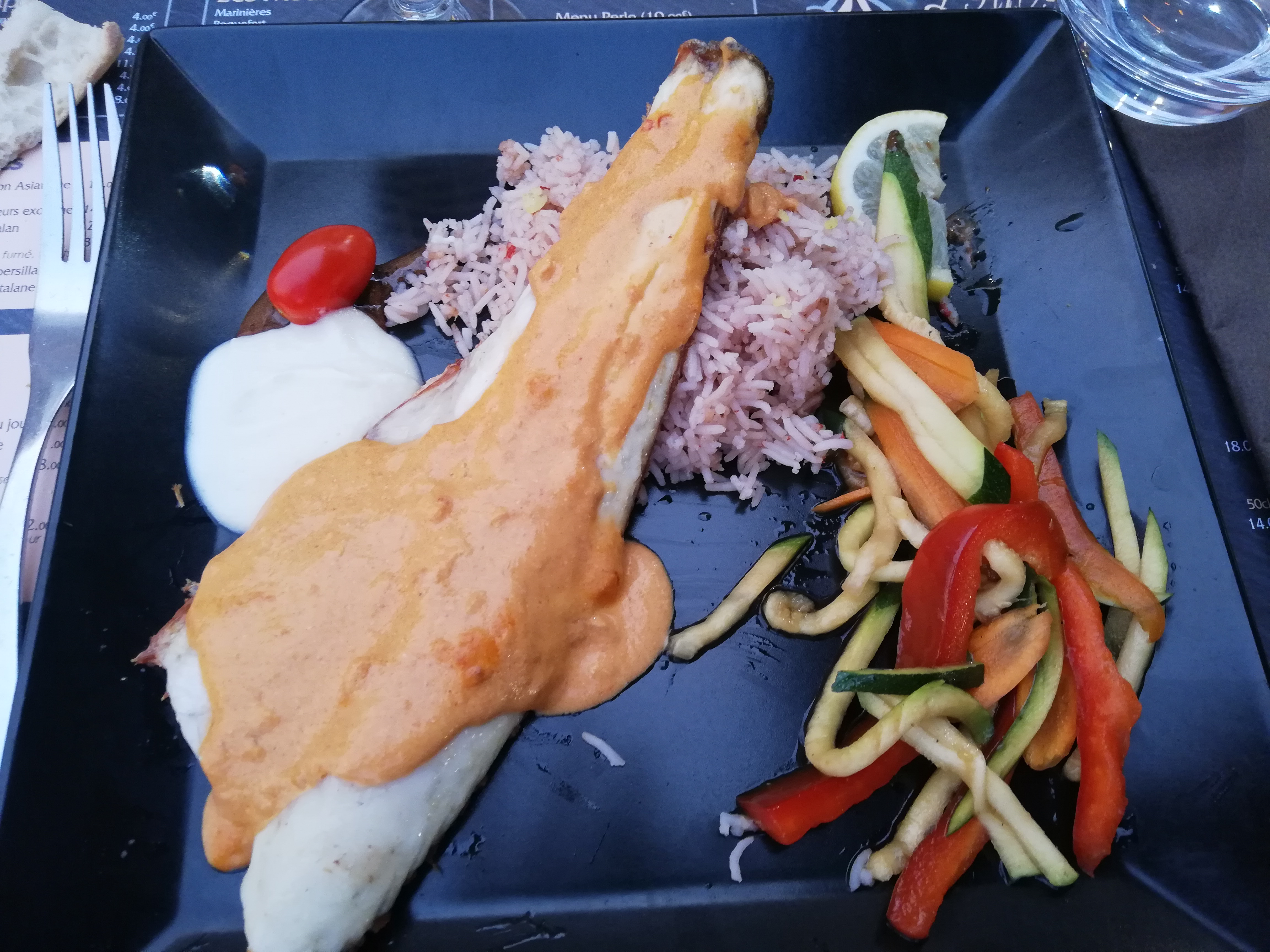 Serveuse adorable et très professionnelle. Cuisine savoureuse avec des détails intéressants. Présentation de l'assiette soutenue et distinguée. Vue sur le port de Saint Cyprien. Que demander de plus ?
