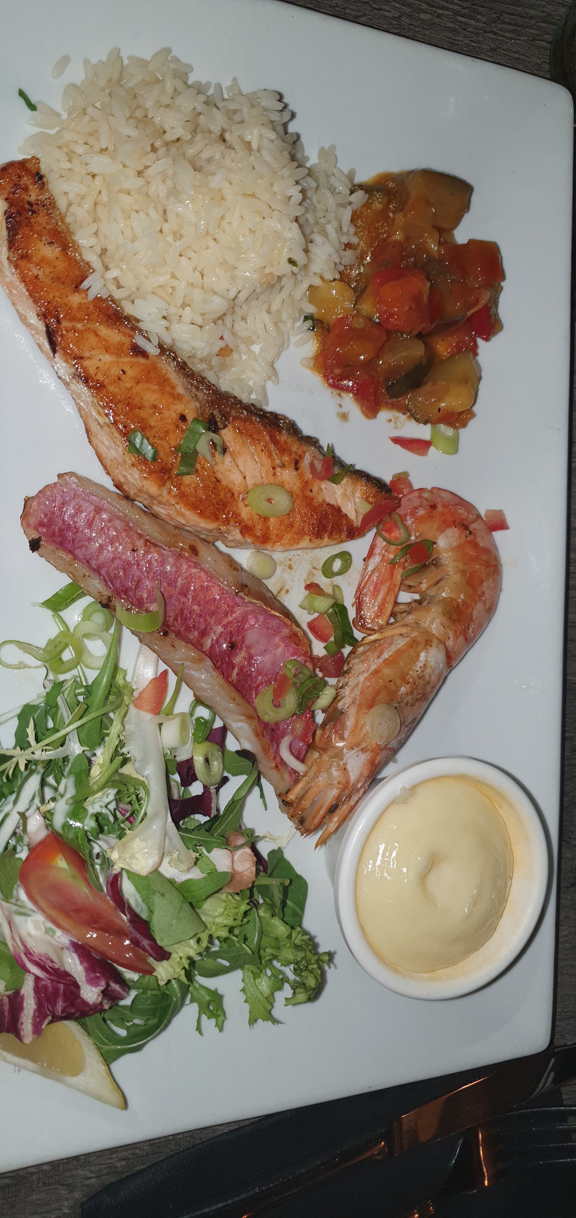 Petite entrée huîtres, crevettes fraîches, mais le plat du jour ( rougets et petits légumes) ainsi que la parillada de la mer manquait de sauce et le riz un peu sec.