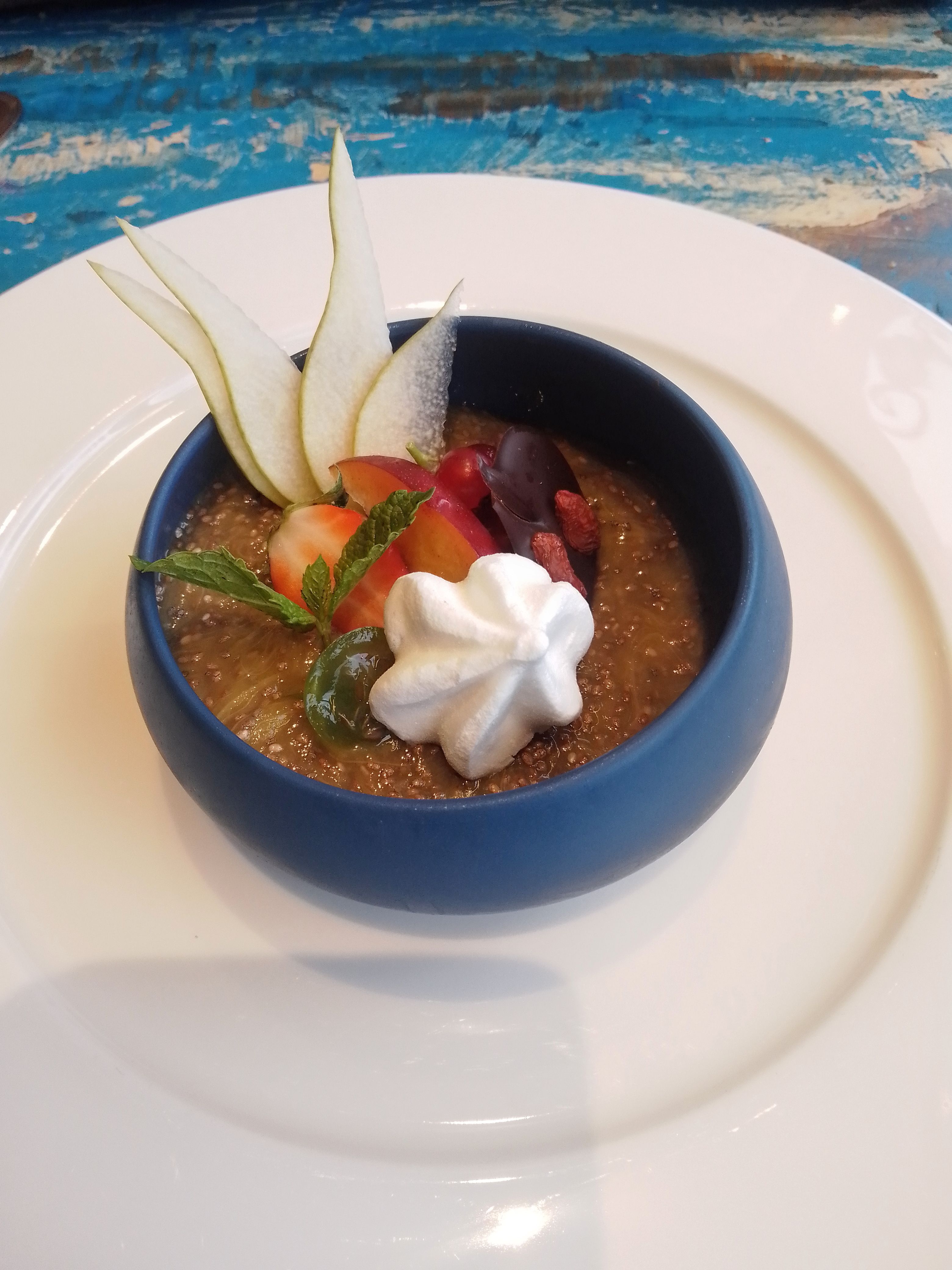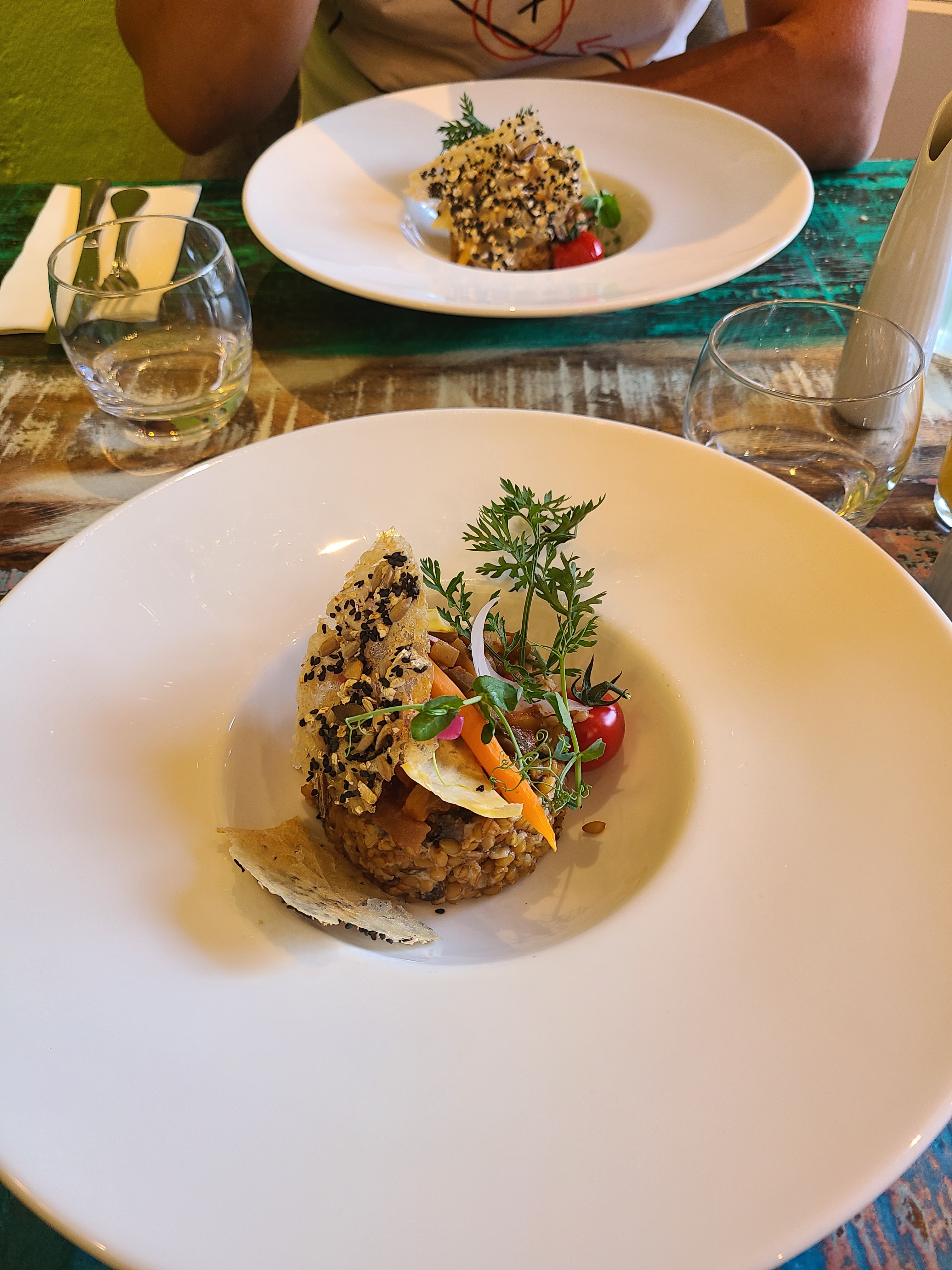 Le restaurant mérite 6 étoiles. Enfin un restaurant, qui plus est en bord de mer, qui propose une carte avec des plats végétaliens ! Ça fait tellement plaisir, du bien. De l'entrée au dessert, il y a des plats et non des OPTIONS végétales. Les plats sont super bien présentés, c'est beau, ça donne vraiment envie de goûter. Ça fait aussi beaucoup de bien d'avoir un dessert au restaurant. Je suis contente de cette découverte, je me suis sentie la bienvenue et non la cliente lourde, qui mange des plats fades, la serveuse prend le temps d'expliquer la carte, le serveur était super accueillant également et Nathalie(?), à la réception, était d'une grand gentillesse. Les félicitations au chef également pour son détail et son goût. Merci beaucoup, hâte de goûter le curry. Le risotto à l'épeautre était super Bon :)