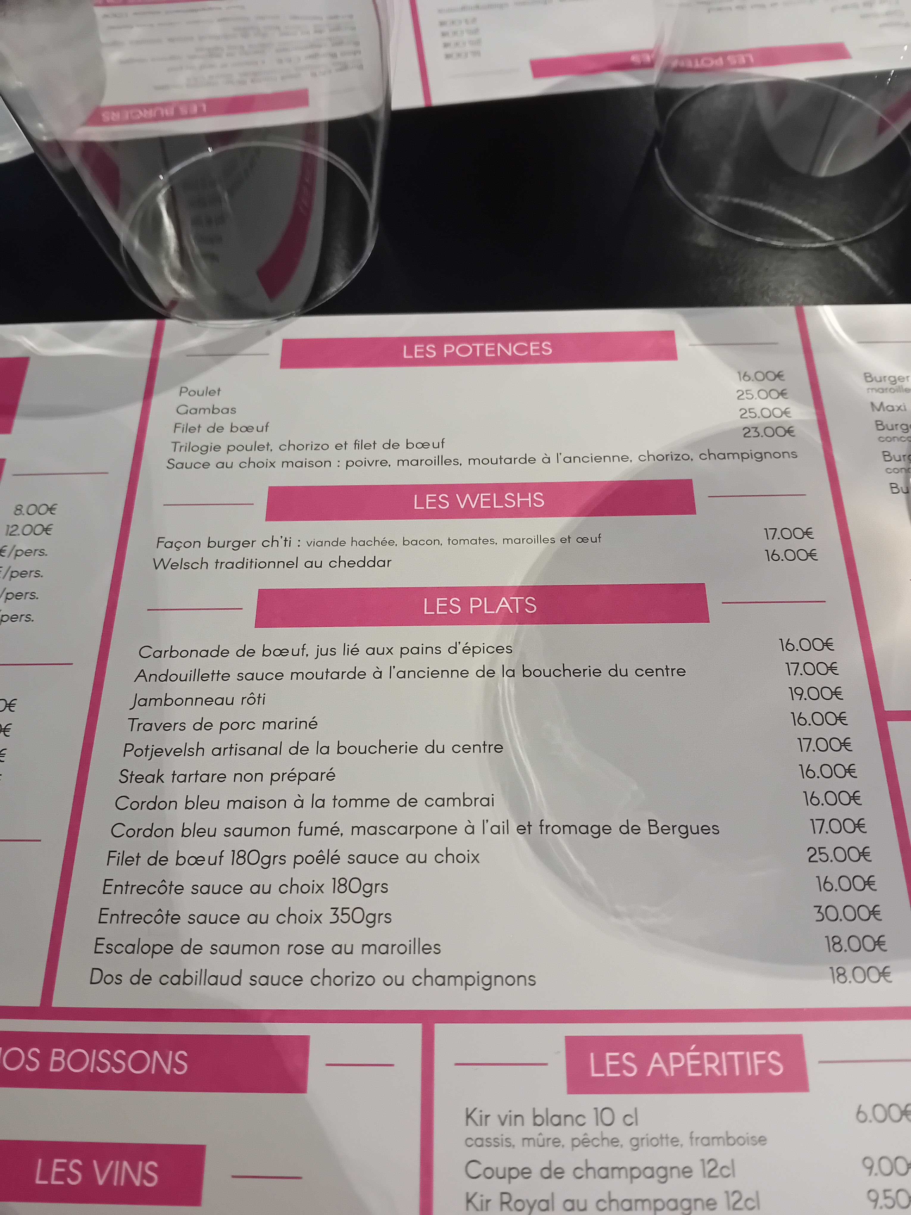 Nous sommes venus samedi 05/02 Les 2 welshs commandés façon burger étaient froids au milieu, le maroilles n'était même pas fondu, on m'a dit On ne peut pas voir l'intérieur du welsh => retour en cuisine, mon garçon et moi n'avons pas mangé en même temps que les autres. Ma femme a fait remarquer en fin de service à la serveuse la quantité très importante de chorizo fort dans son welsh poulet maroilles chorizo poireaux et l'amertume du fromage très marquée, la serveuse lui a juste dit bah d'habitude personne ne se plaint, que voulez vous répondre à cela ? Les frites sont assez molles, pas croustillantes, et le service un peu long. Nous ne reviendrons pas.