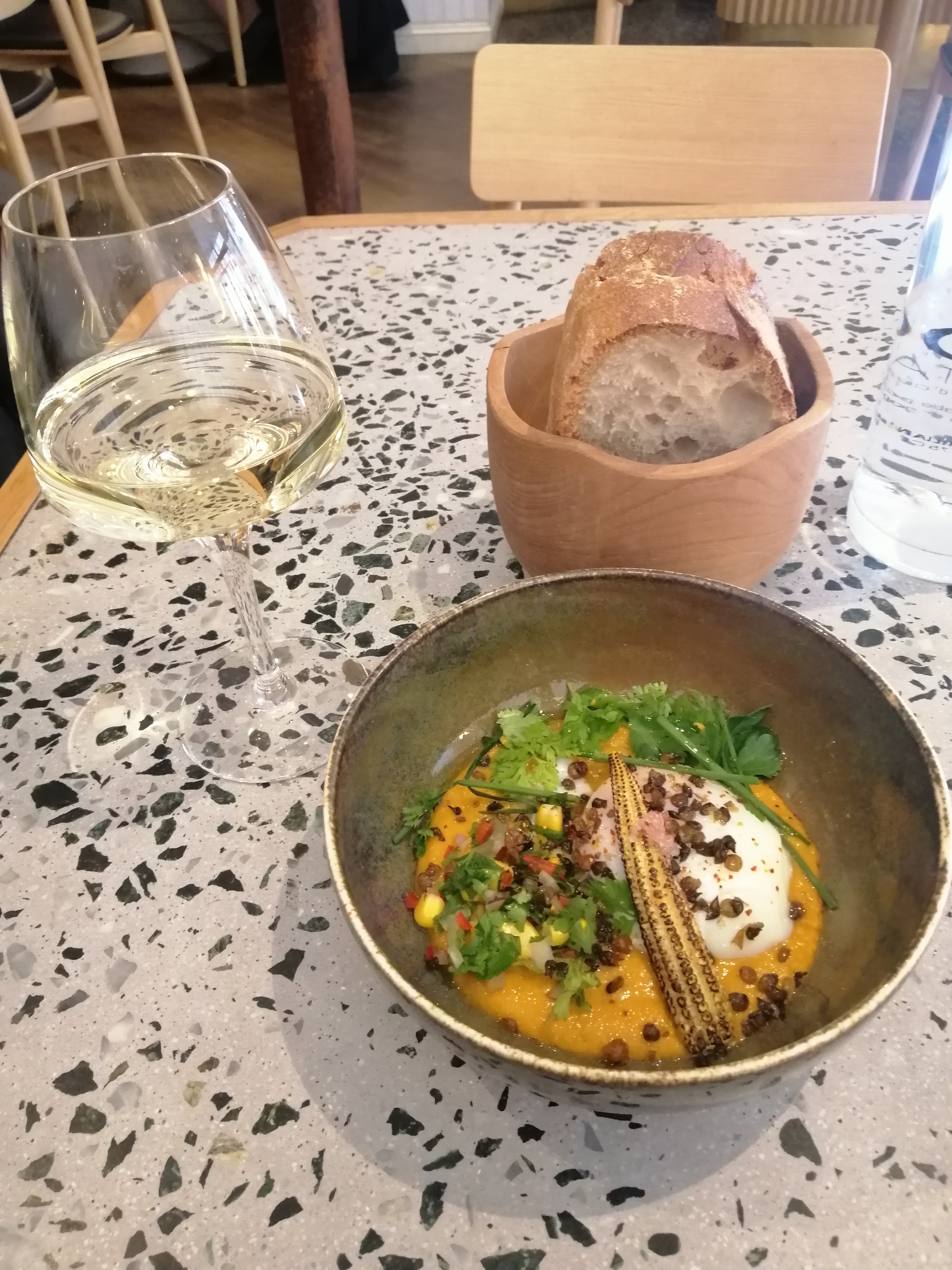 Excellente cuisine créative et moderne avec des produits de saison, super service, des jeunes dynamiques et très à l'écoute. Nous avions des végétariens dans le groupe et ils ont su s'adapter et nous proposer des plats colorés et savoureux. Les plats étaient tous délicieux, le vin qui nous a été conseillé était très bon, la salle agréable, cosy et bien décorée, le service impeccable, les desserts sont à tomber. Bref, que du bonheur !