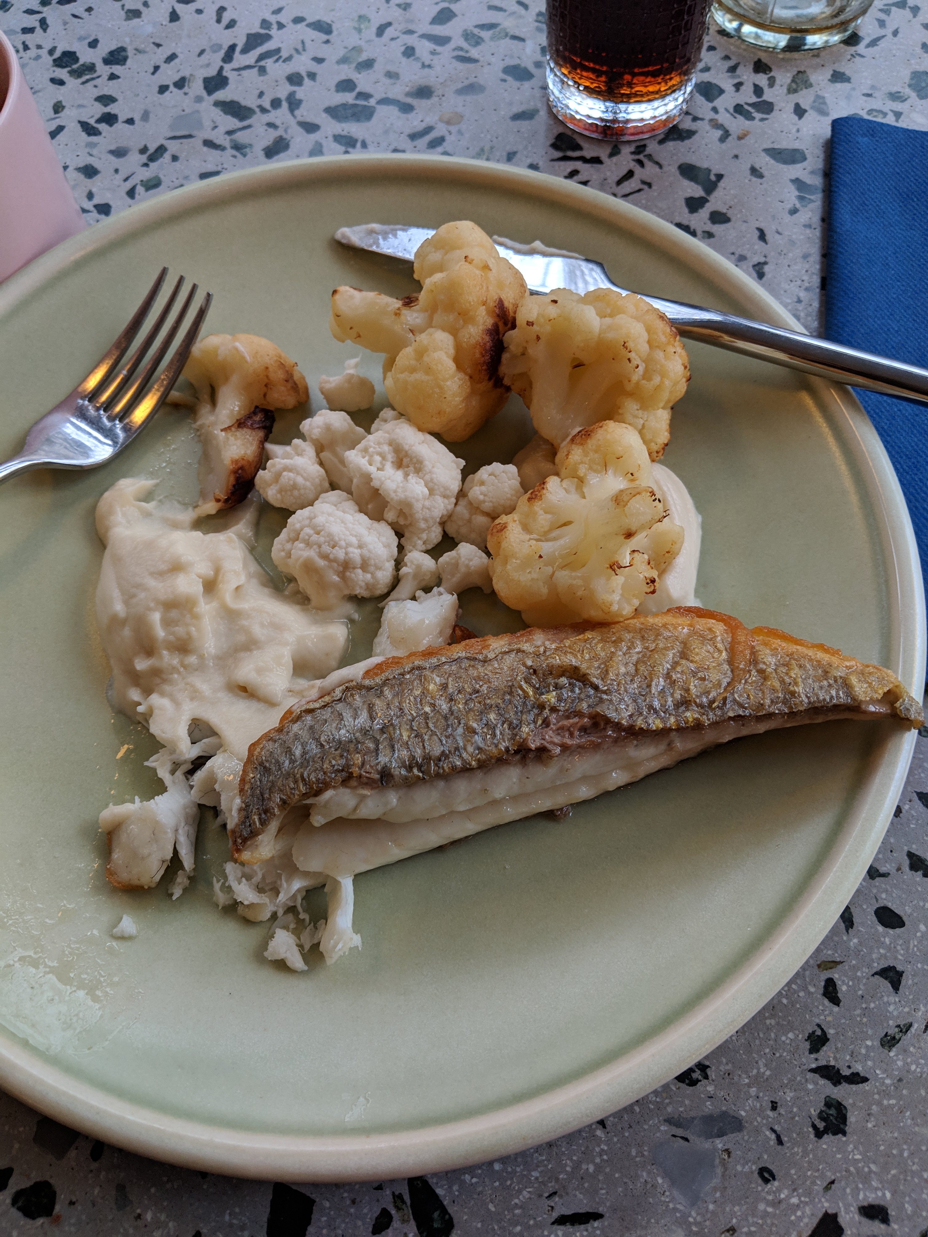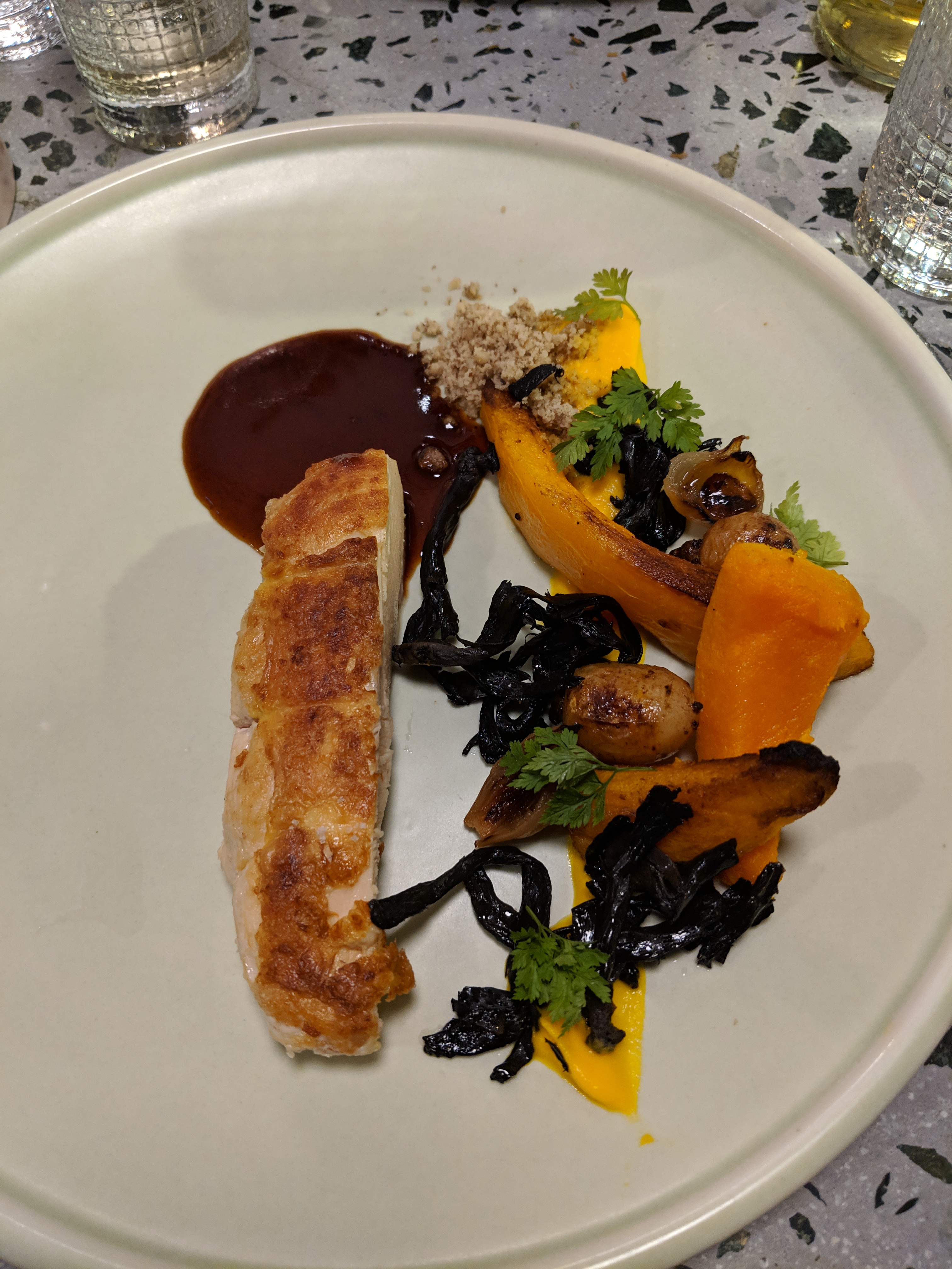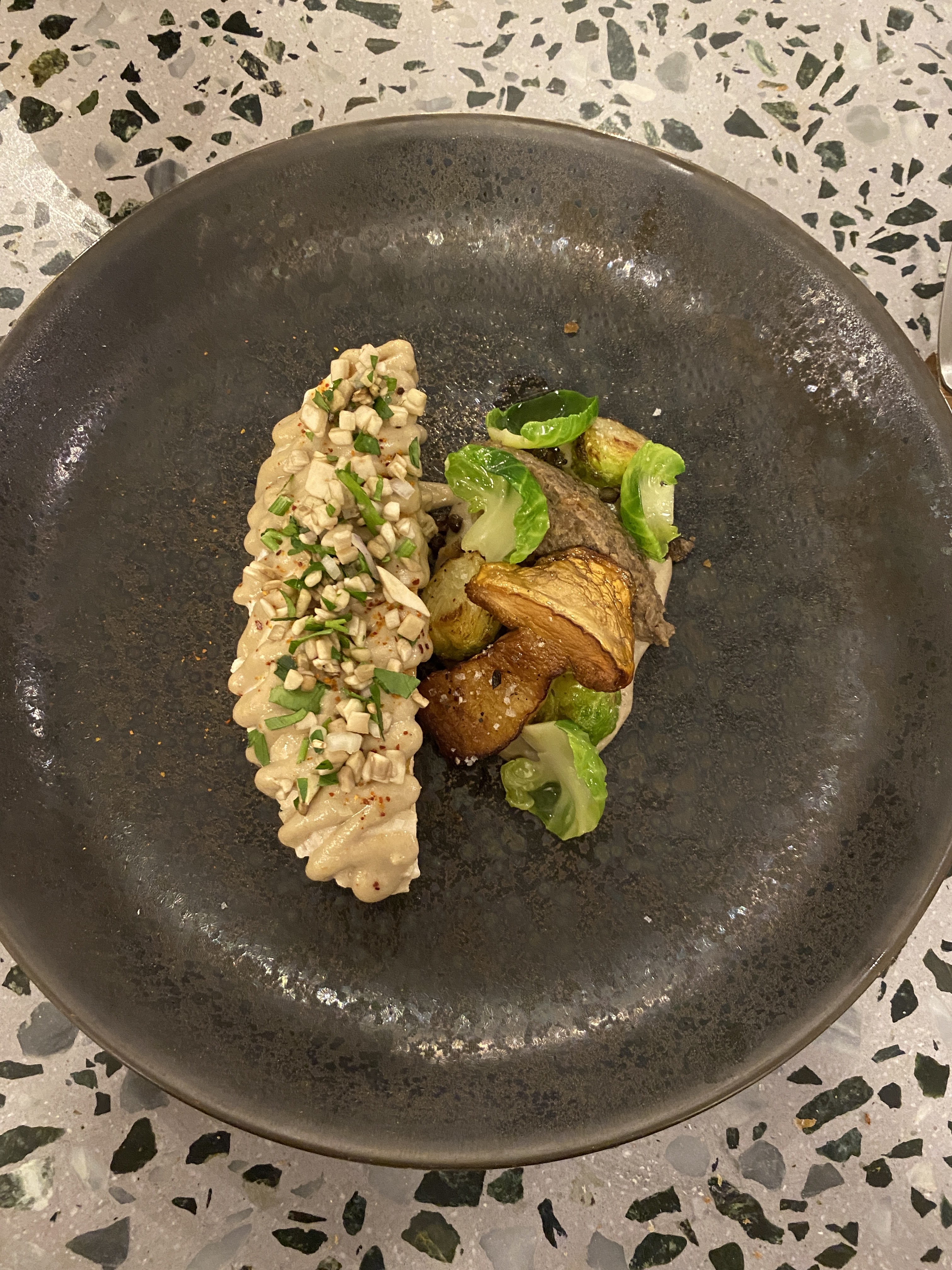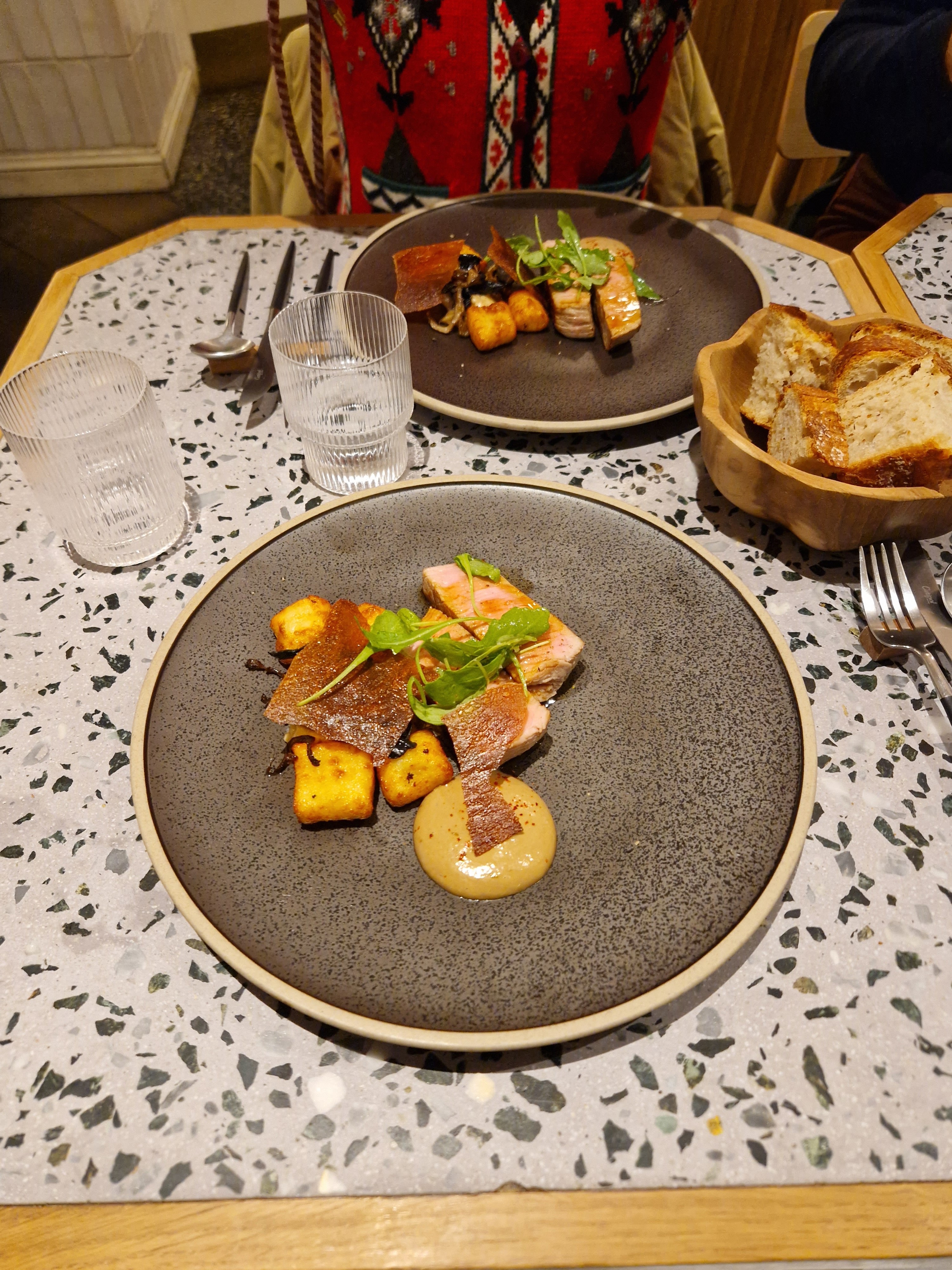Ça vaut vraiment le détour. Nous avons eu le menu dégustation de 6 plats. Toute la nourriture était intéressante, fraîche et savoureuse. Un équilibre entre les fruits de mer et les plats de viande. Deux entrées, 2 plats principaux, 2 desserts, tous dimensionnés convenablement pour ne pas repartir rassasié. Prix très raisonnable aussi. Ma seule critique serait le manque presque total de légumes en quantité raisonnable, même si au moins cela signifiait que nous n'avions pas de plateau de haricots verts omniprésents (peut-être qu'un côté de brocoli irait bien ?). La décoration est une sorte d'ambiance moderne/scandinave du milieu du siècle. L'emplacement est un peu hors des sentiers battus pour un restaurant de ce genre, mais cela veut dire qu'ils peuvent se permettre de vous laisser de l'espace (physiquement). Ici, vous pouvez vous entendre réfléchir - et surtout, vous pouvez entendre vos compagnons parler, sans vous sentir assourdi.