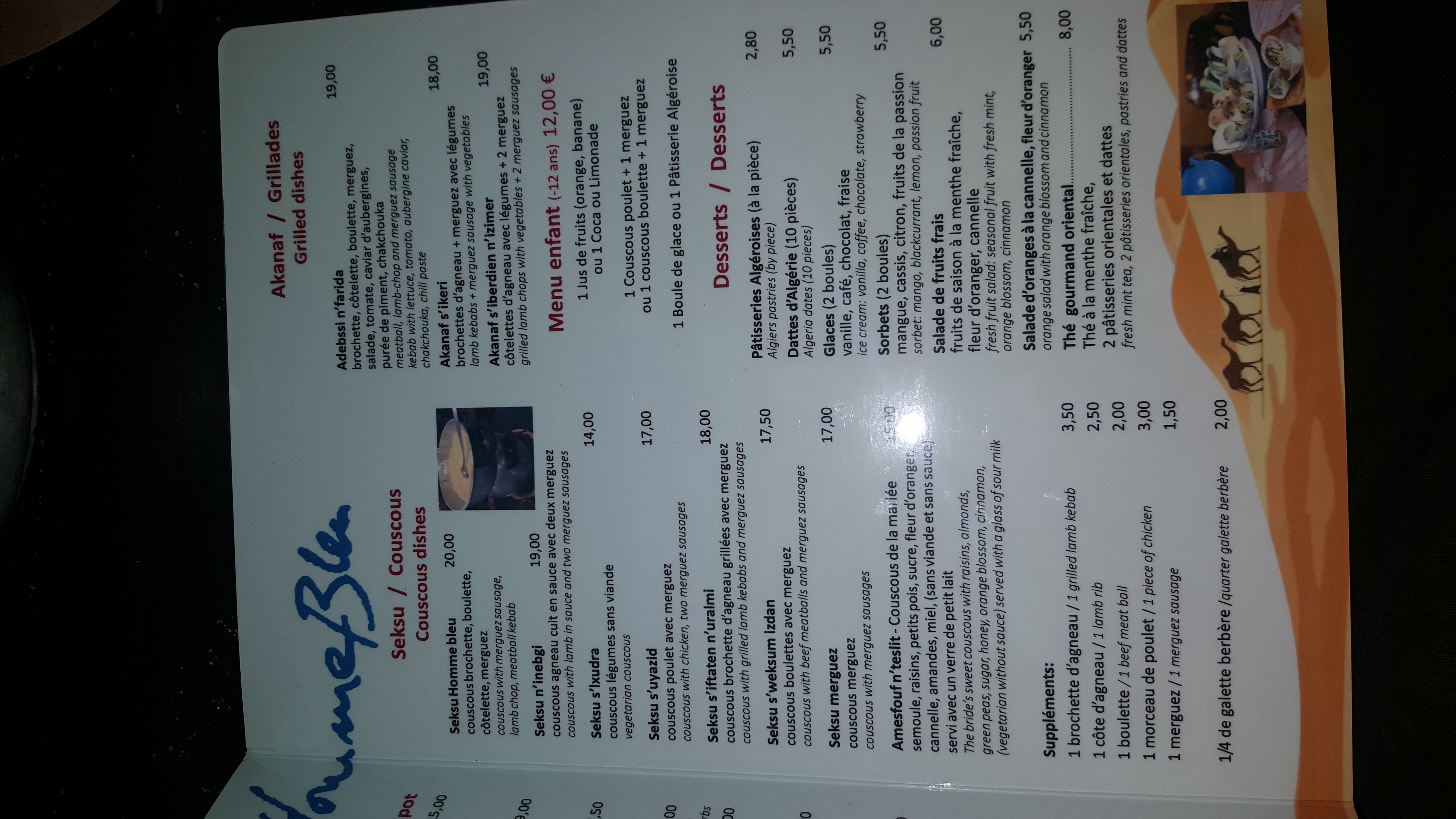 C’était pas mauvais mais c’était pas très bon non plus. Le bouillon du couscous manquait de saveur. Les prix sont cher par rapport aux quantité de viande… et ce n’est pas un restaurant marocain mais kabyle. Et je suis marocaine, je peux vous dire que je ne retrouvais pas le goût marocain dans le couscous. En revanche l’accueil était chaleureux.