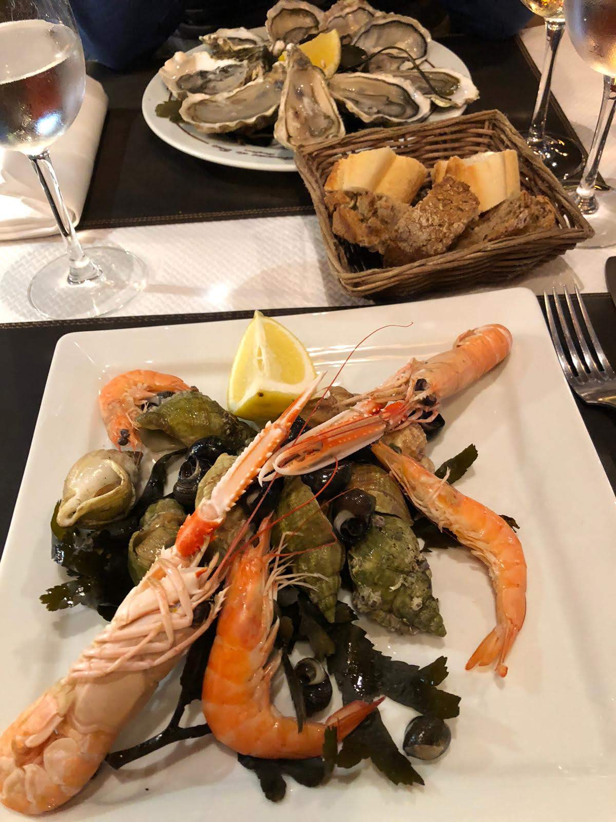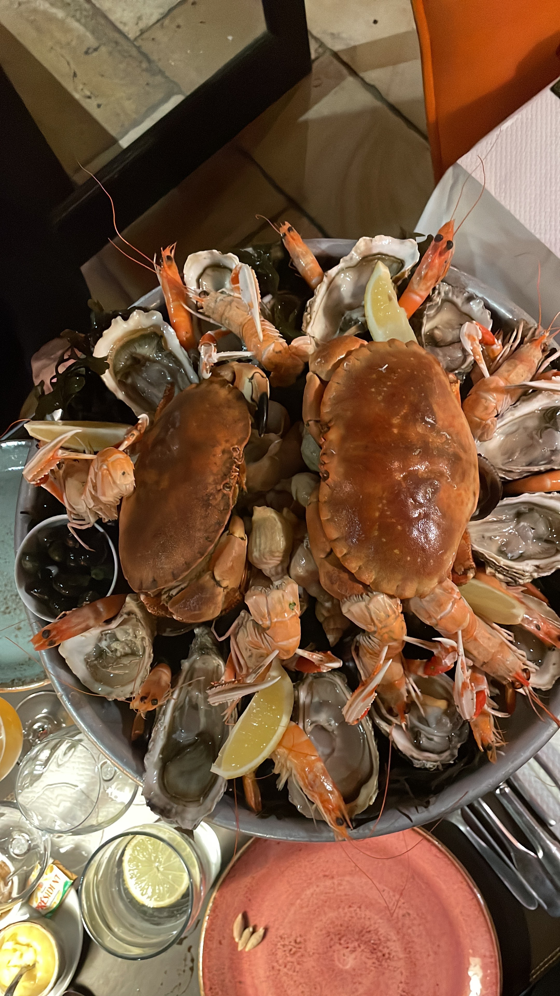 Un dîner pour deux. Nous avons tous deux pris le menu à 42 €. En entrée nous avons eu l'assiette de fruits de mer et d'huîtres (x9). Tout est très savoureux et frais. Grande variété aussi. Et de grandes portions aussi. Les plats principaux étaient un bar et un gigot d'agneau. Les deux étaient vraiment bons. En dessert une crème brûlée et un crumble. Je m'attendais à un peu mieux vu la qualité des deux plats précédents mais dans l'ensemble ils étaient corrects. Nous avons bu une bouteille de rosé. Nous avons passé une très bonne expérience et une belle soirée. Le service était excellent. Les plats principaux sont sortis entre 5 et 10 minutes après les entrées, ce qui nous a laissé suffisamment de temps pour « digérer » les portions massives d’entrées.