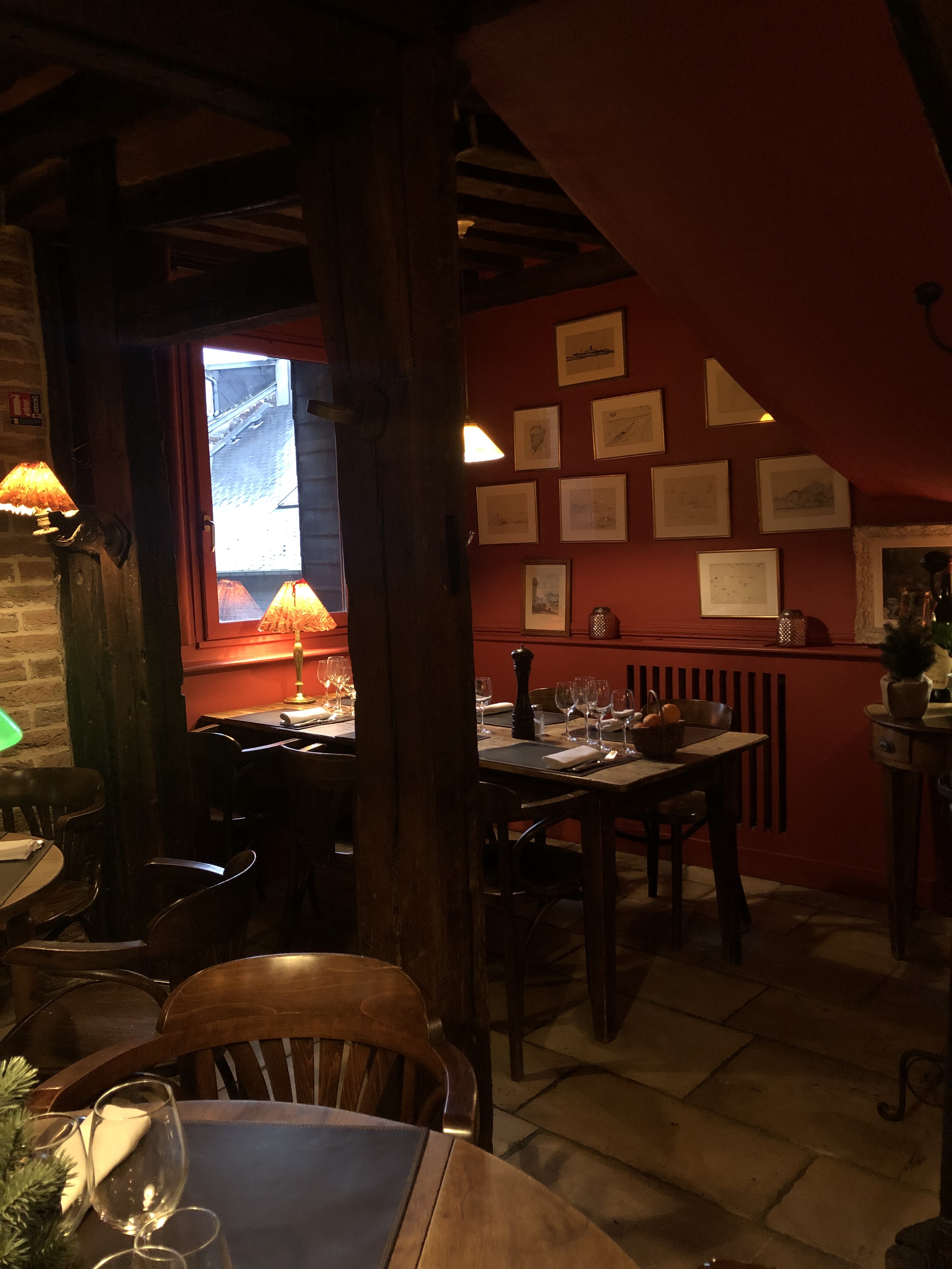 Attention, absolument réserver. Très cosi, carte de fruits de mer (homard, scampis, gambas, ...), Mais aussi de poisson et viande. Le personnel est charmant. On a pris les gambas et un Quincy blanc (super). Ne vous étonnez pas du nombre de restaurants et de bars à Honfleur, avec plus de 3.500.000 visiteurs annuels il faut bien les nourrir. Clientèle internationale (si vous vous retrouvez à une table un peu collée à une autre, profitez en pour faire connaissance, nous c'était des pensionnés Australiens).