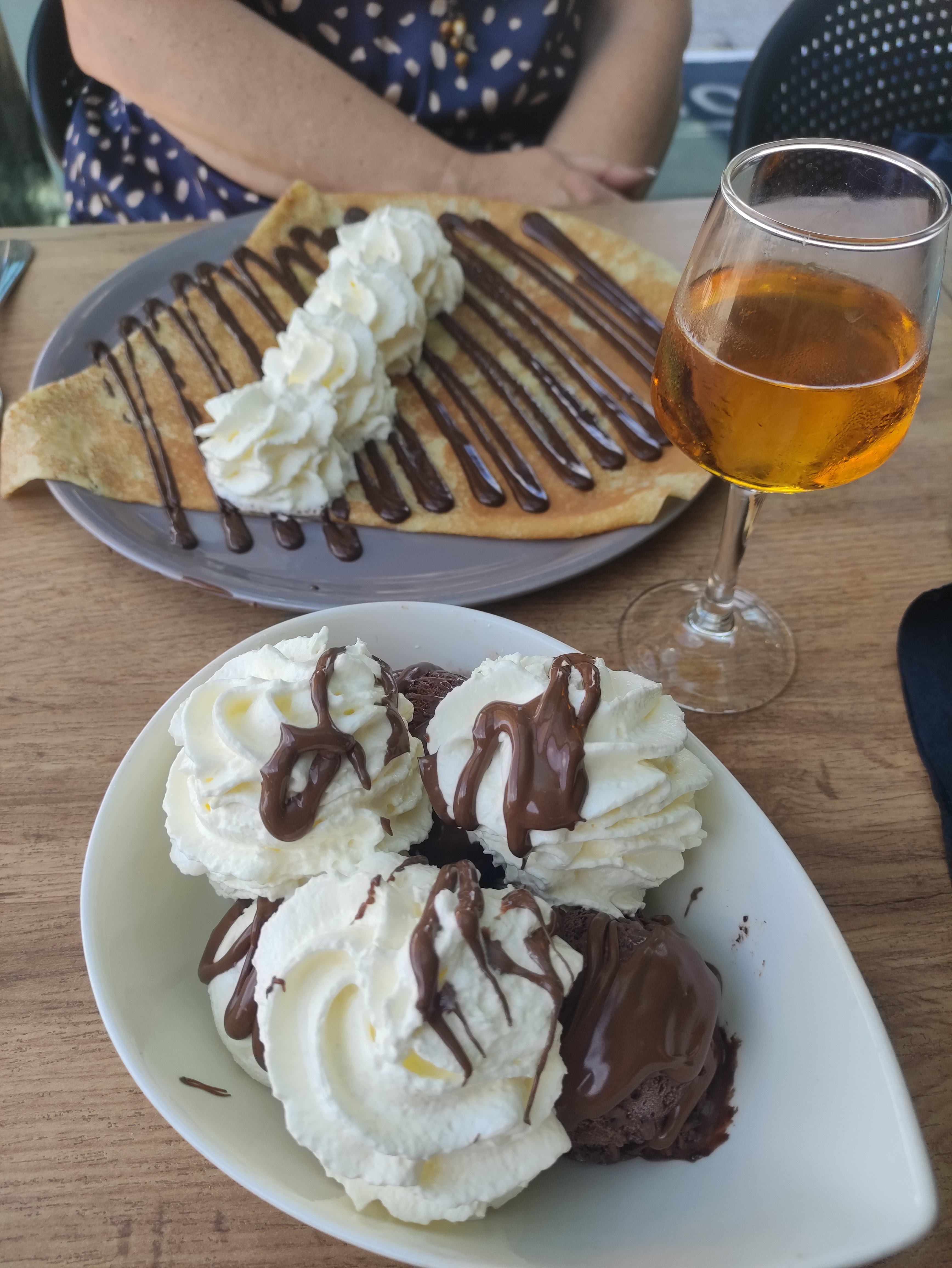 Nous nous sommes régalées avec 2 galettes salées à partager, bien copieuses et 2 crêpes sucrées également bien garnies, généreuses en chantilly. L'équipe de 2 serveurs qui se sont occupés de nous était également sympathique