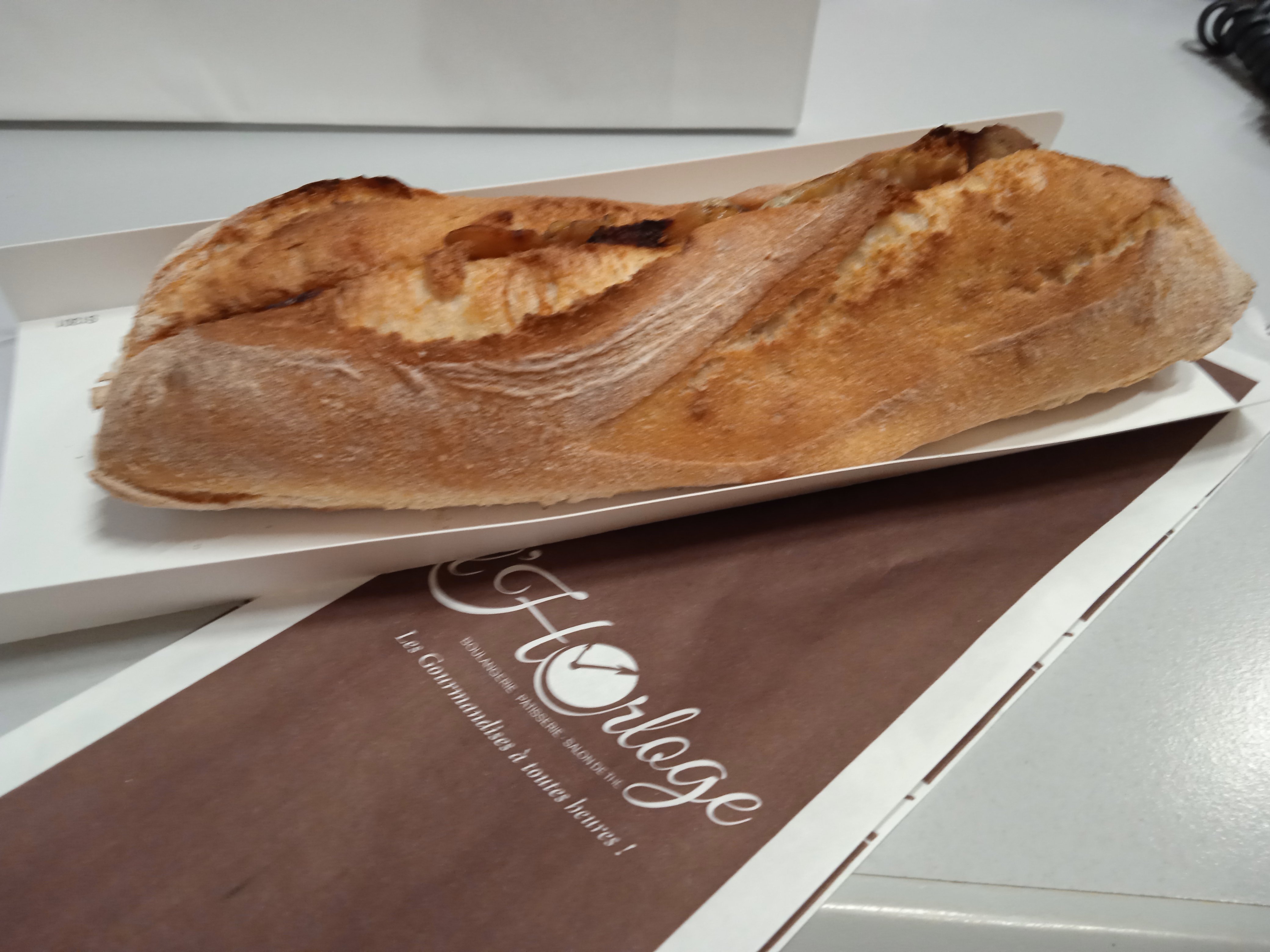 Il n’est vraiment pas rare que nous achetions nos baguettes à l’Horloge en ville. Que ce soit Pacello ou Horloge nous n’avons jamais été déçu: alors qu’elle est notre déception aujourd’hui quand pour comparer des poids nous constatons 207g !!! Lorsque (même s’il n’y a aucune réglementation) celle-ci devrait peser environ 250g!!! Je préfère penser que ce n’est qu’une erreur de ce dimanche!!!