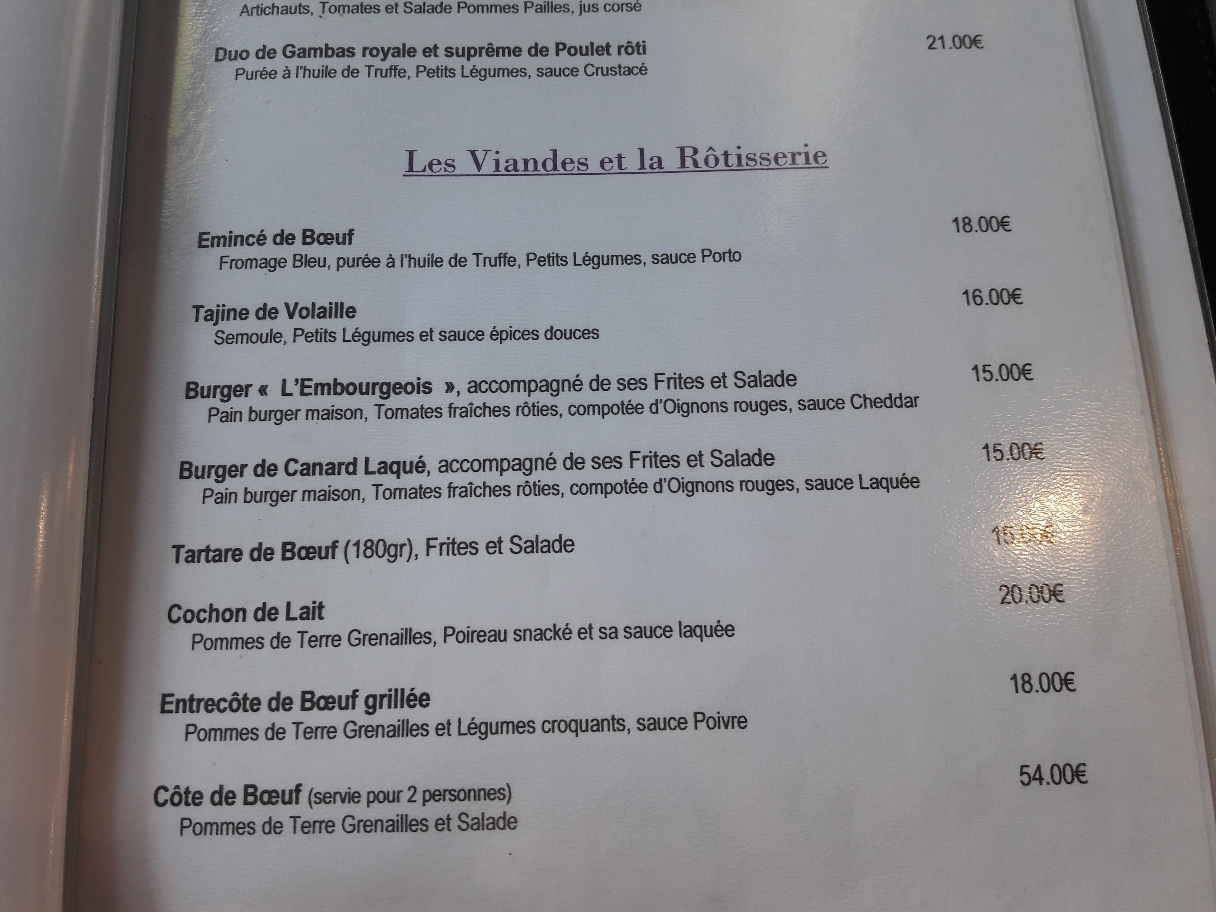 Nous y sommes allés sous recommandation mais nous avons été déçu… Entrées très bonnes (camembert rôti et fritures) mais le reste était très moyen pour le prix ! Entrecôte remplie de nerf et très dure (impossible à couper), poisson fade… pour les desserts c’est pareil pas vraiment de goût et fait depuis un moment Service lent même pour avoir la carte il faut attendre 10min Nous avons eu néanmoins un geste après réclamation Bref tarifs bien trop élevés par rapport à la qualité