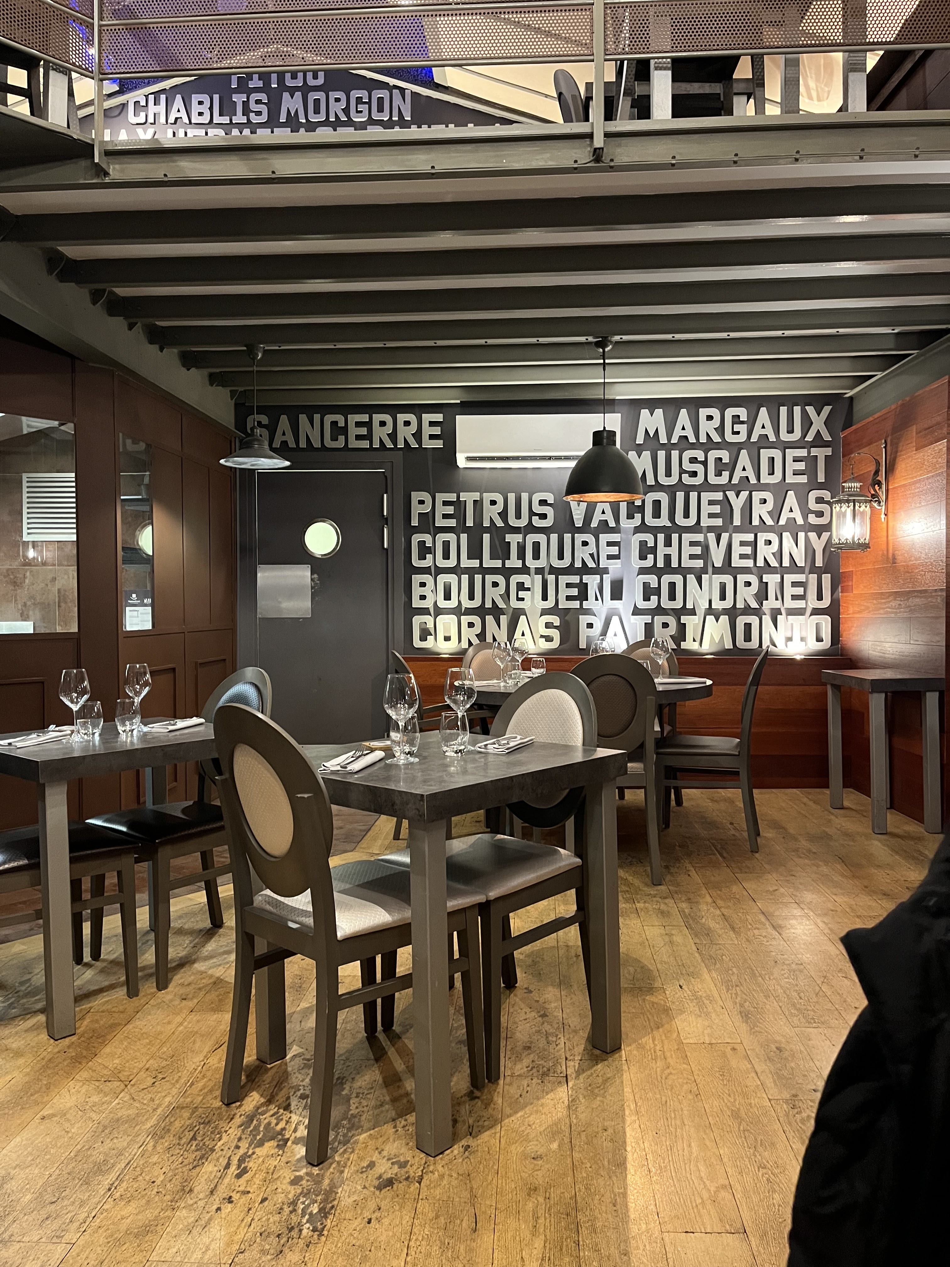 Decors du restaurant sympa. Tres jolie cave. Service satisfaisant. Cependant les Plats et entrées sont quelconques : tartare langoustine et st jacques sans gout. Salade caesar mauvaise et chere !!!! Une montagne de salade et peu de garniture. Poulet sec. Meme pas de frites maison a ce tarif là. Tarifs elevées par rapport a la qualité des plats. Une note de 80 euros pour 2 pour 2 entrées 1 plat et 1 salade.. Dommage.
