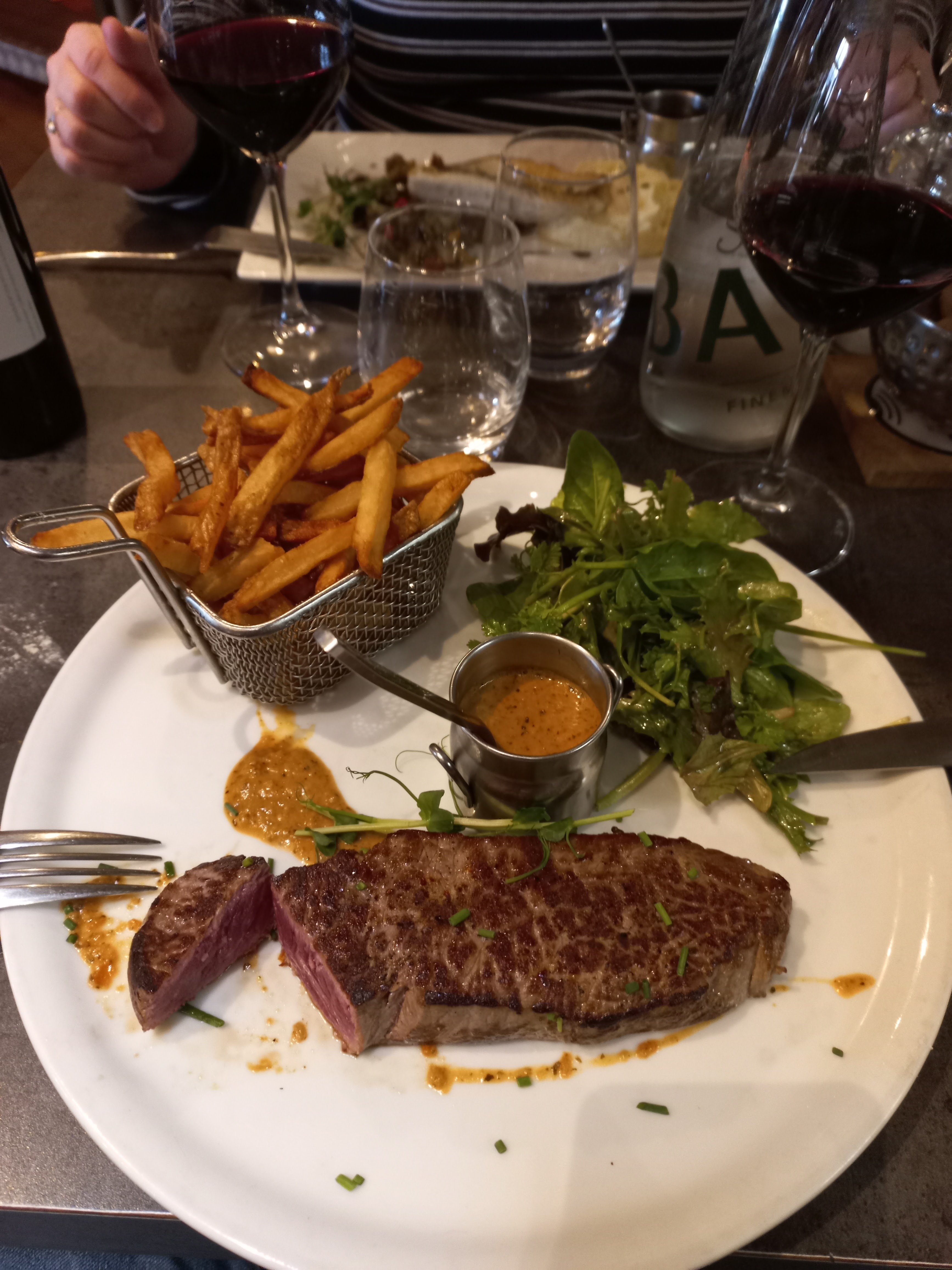 Accueil sympa, avons pris entrecôte frites salade sauce poivre, avec verre de cheverny rouge. Décor atypique.