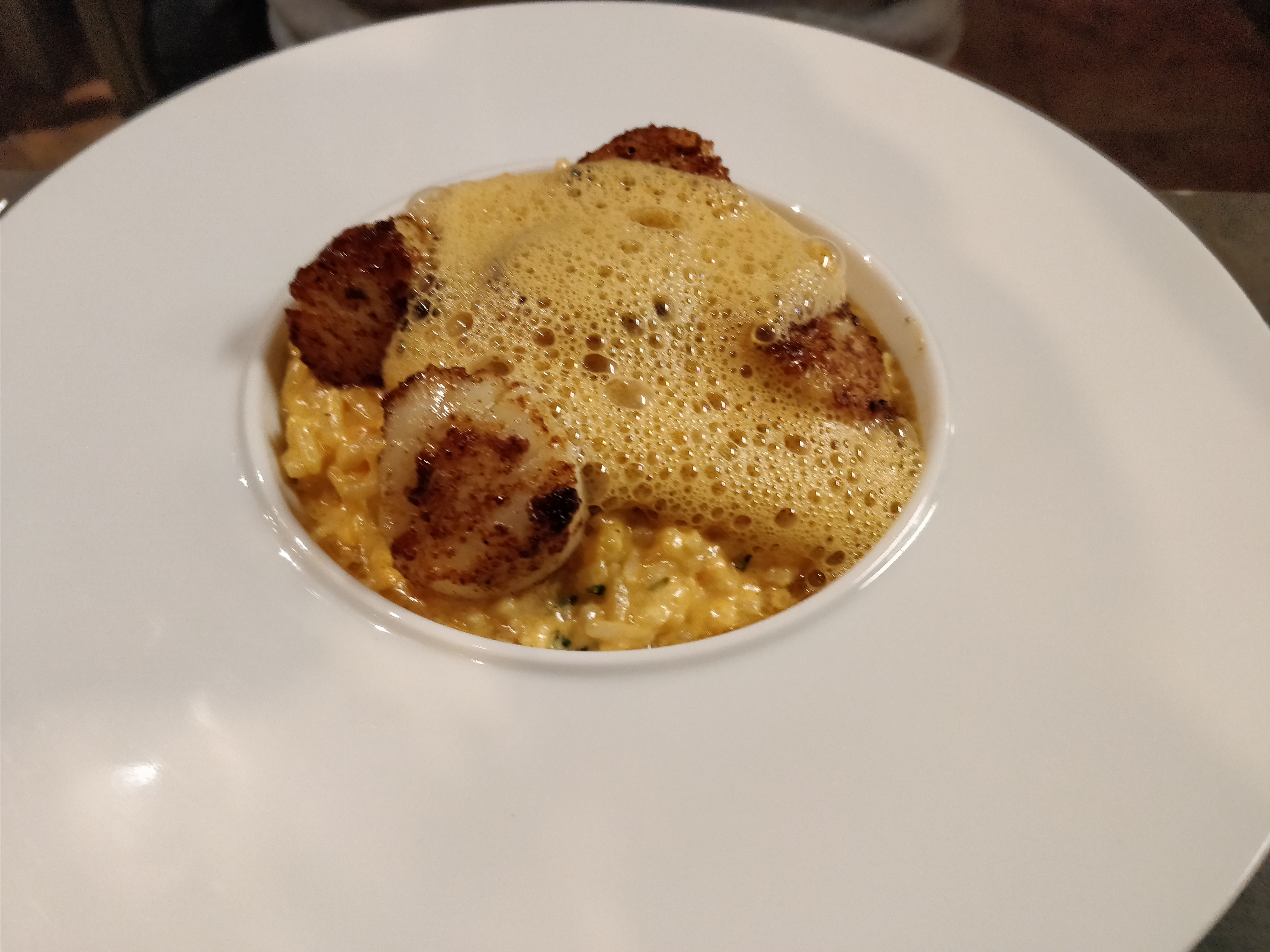 Service impeccable, qualité des plats au top ! Belle carte des vins et surtout des spiritueux. L'équipe est très sympathique et disponible. (Plats en photos : Entrée : Magret de canard foie gras en salade, Plat : Fricassée de St Jacques et Lotte avec risotto, Dessert : Choco-nougat avec du praliné et du caramel)