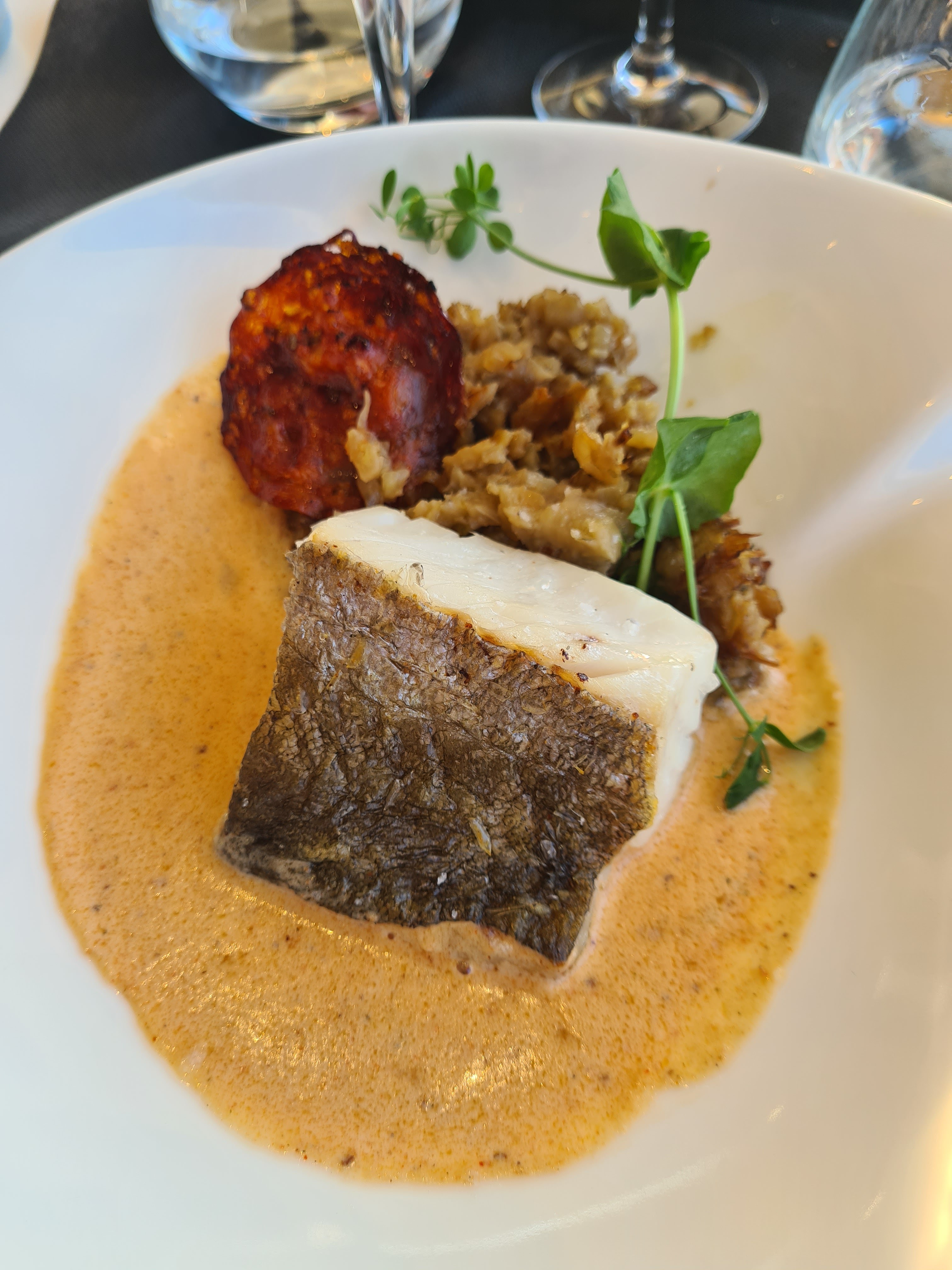 C'est censé être un bon restaurant haut de gamme et nous a été recommandé par notre hébergement, mais nous avons été déçus. C'est dommage qu'on ne puisse même pas parler anglais avec le personnel, on n'est même pas accueilli chaleureusement si on n'a pas de réservation, ce qui est apparemment normal en France. L'accueil de la cuisine était plutôt bon, l'entrée que nous avions était un carpaccio de morue avec une vinaigrette aux agrumes à partager (ça avait plus le goût d'agrumes que de poisson, plutôt aucun goût du tout), ma copine avait le suprême de poulet pour le plat principal, qui avait un goût correct, mais un peu trop de sel marin et les patates douces étaient brûlées, j'avais un filet de turbot, qui était bon mais simplement froid, la sauce était feuilletée. Nous n’aurions pas pu en discuter car personne ne comprend l’anglais ou ne veut le comprendre. C'est juste dommage, trop cher pour ça.