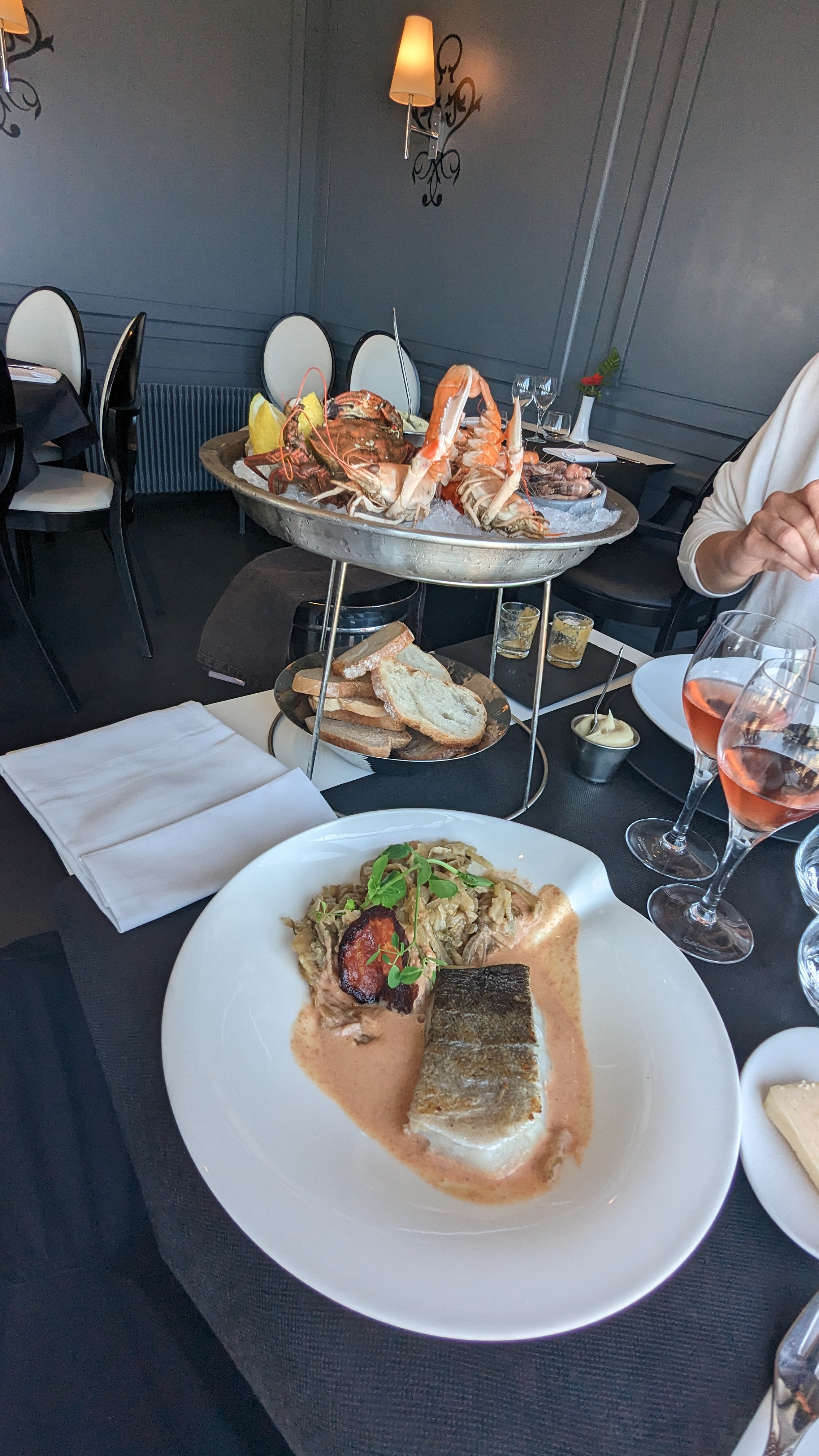Un plateau de fruits de mer délicieux. Le menu de ma compagne très bien présenté et très raffiné. Malgrés une erreur ( cocktail servis à nos voisins) la responsable est venue présenter ses excuses et en plus de ça a fait un geste très commercial. L’erreur est humaine, mais le geste commercial pas obligatoire! Bravo pour tout et merci !