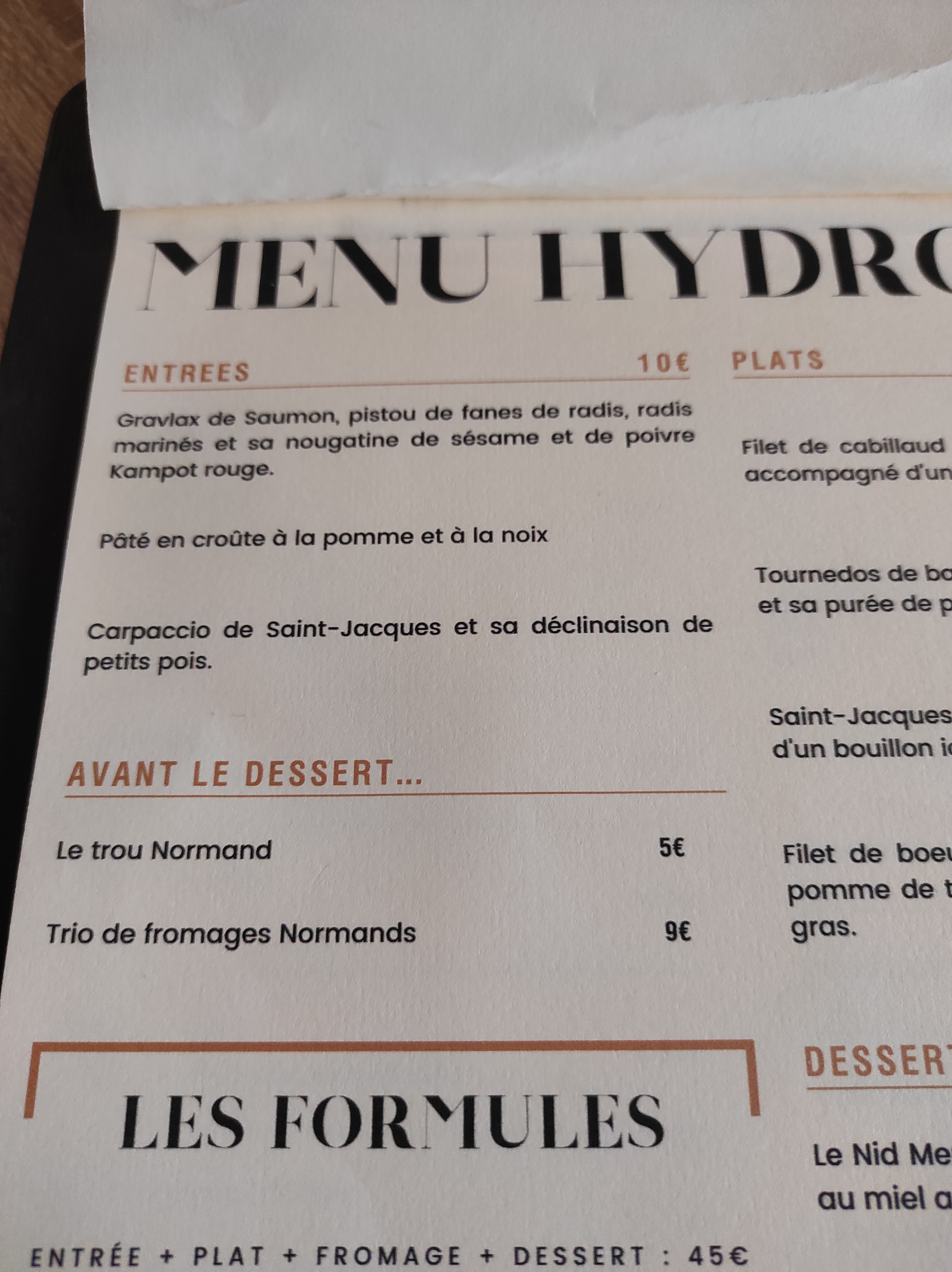 Excellente surprise, L'hydromel est un bel établissement dirigé par une jeune équipe dynamique et accueillante. Cuisine raffinée et inventive sur des classiques revisités Sortez de Cabourg et sa restauration balnéaire, Dives sur Mer est à deux pas. Formule midi attractive et copieuse Parking à proximité Bravo a cette équipe, qu'elle perdure dans cet esprit .