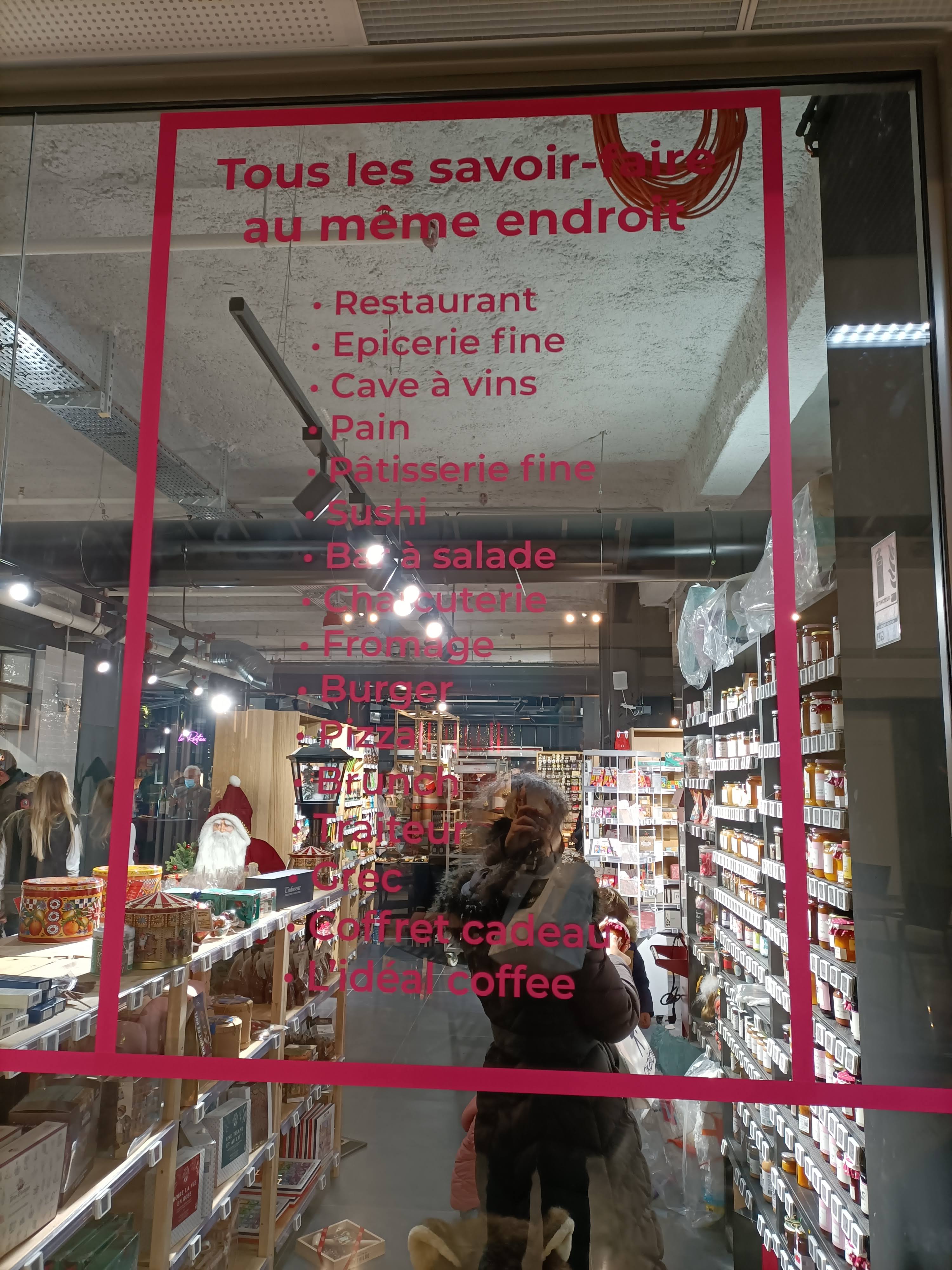 Accueil au top!! Plusieurs cuisines différentes ( Italie, Asie et française ) Que l'on soit pressé ( en mode snacking sous la verrière )ou pour manger en mode cosy au restaurant ambiance feutré, il y en a pour tous les gouts !! Carte presque 100% faite maison. Très large choix d'épicerie fine et donuts de dingue oO!