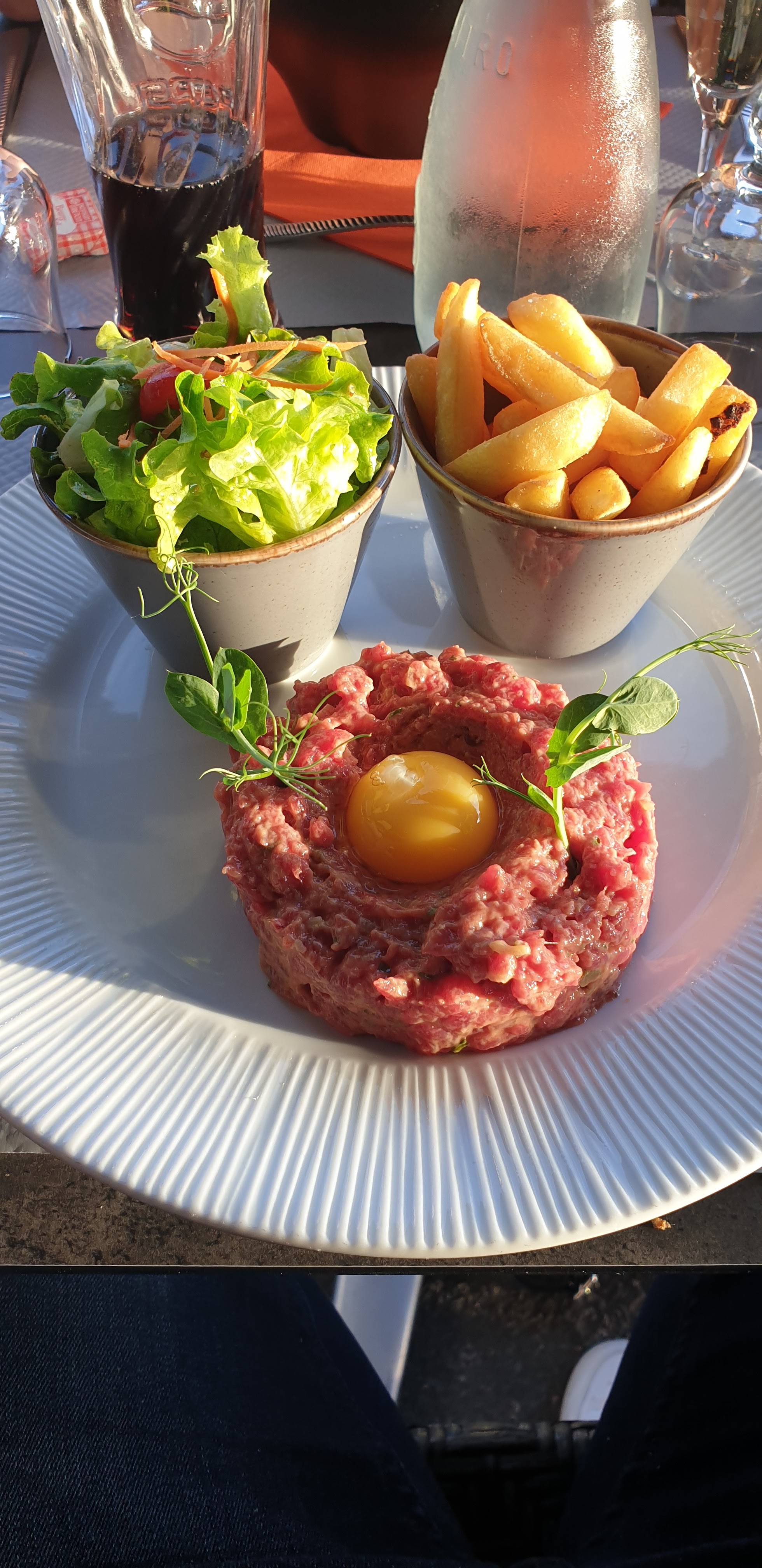 J'ai déjeuné vers 12h. L'entrée était satisfaisante. Par contre comme, j'adore le Tartare au boeuf, j'en commande un. Et là, je suis très déçu. Il est 16h30 et je ressens toujours dans l'estomac un poids lourd non digéré, une sensation désagréable de Gras. Ce n'était pas appétissant. Un tas de viande toute pâle en bouillie avec de nombreux filaments de gras. Si vous adorez le Tartare, comme moi, je vous déconseille ce Tartare au boeuf.