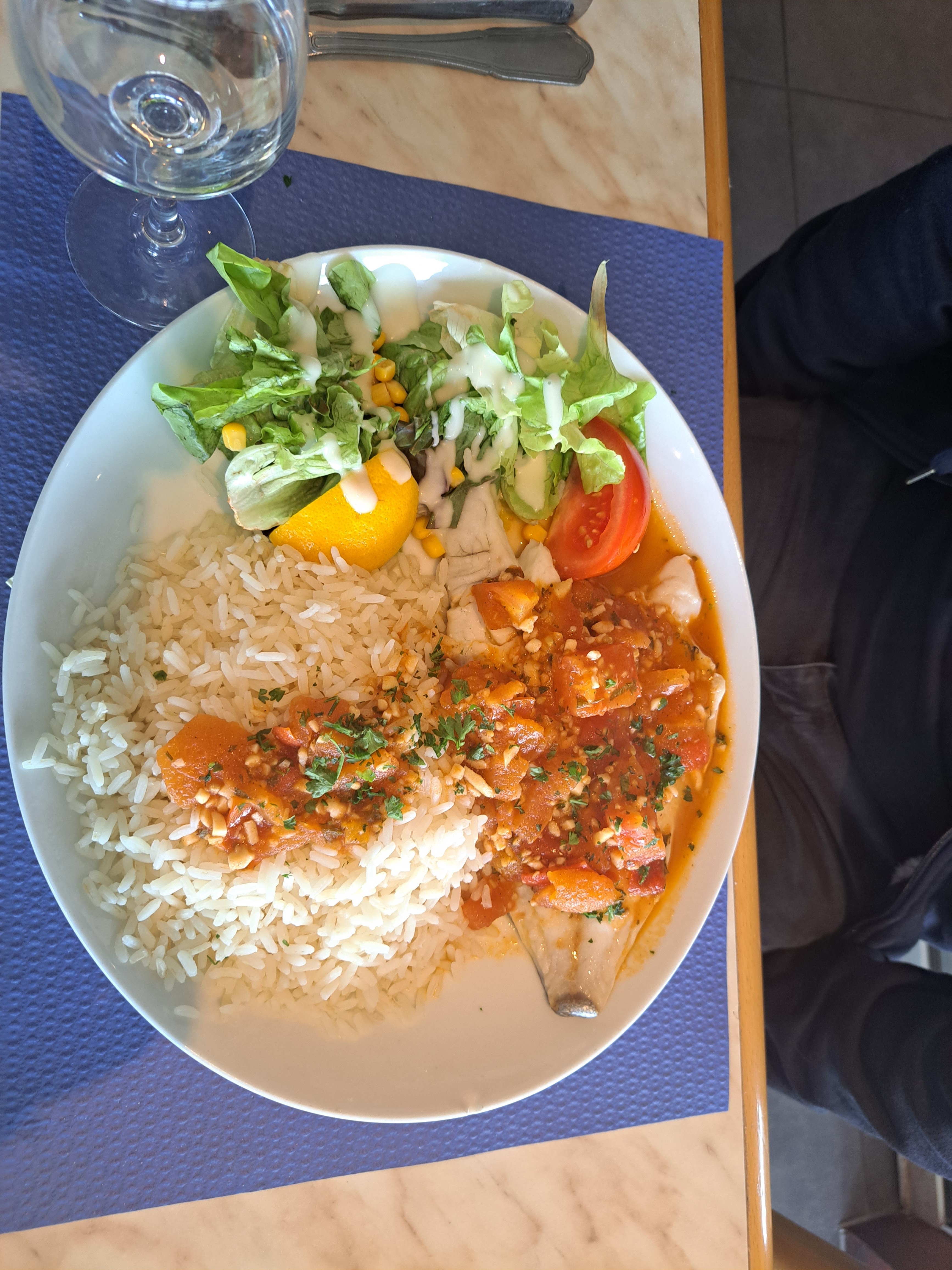 Service tip top, très très aimable et ... du savoir-faire car devant nos assiettes rendues à moitié pleines, le serveur ne nous a pas demandé si tout s était bien passé 😉 ! Effectivement le plat du jour, un filet de lieu /riz et petits légumes, était vraiment peu appétissant. Le poisson caché sous une sauce orange était fade, trop cuit et plein d arrêtes. Quand au riz, blanc sans sel, sans beurre et parsemé de petits pois il était digne d un plat tout droit sorti d un service hospitalier ... Désolée mais nous n'avons pas aussi mal mangé depuis longtemps ! Peut être que les plats cartes sont meilleurs....