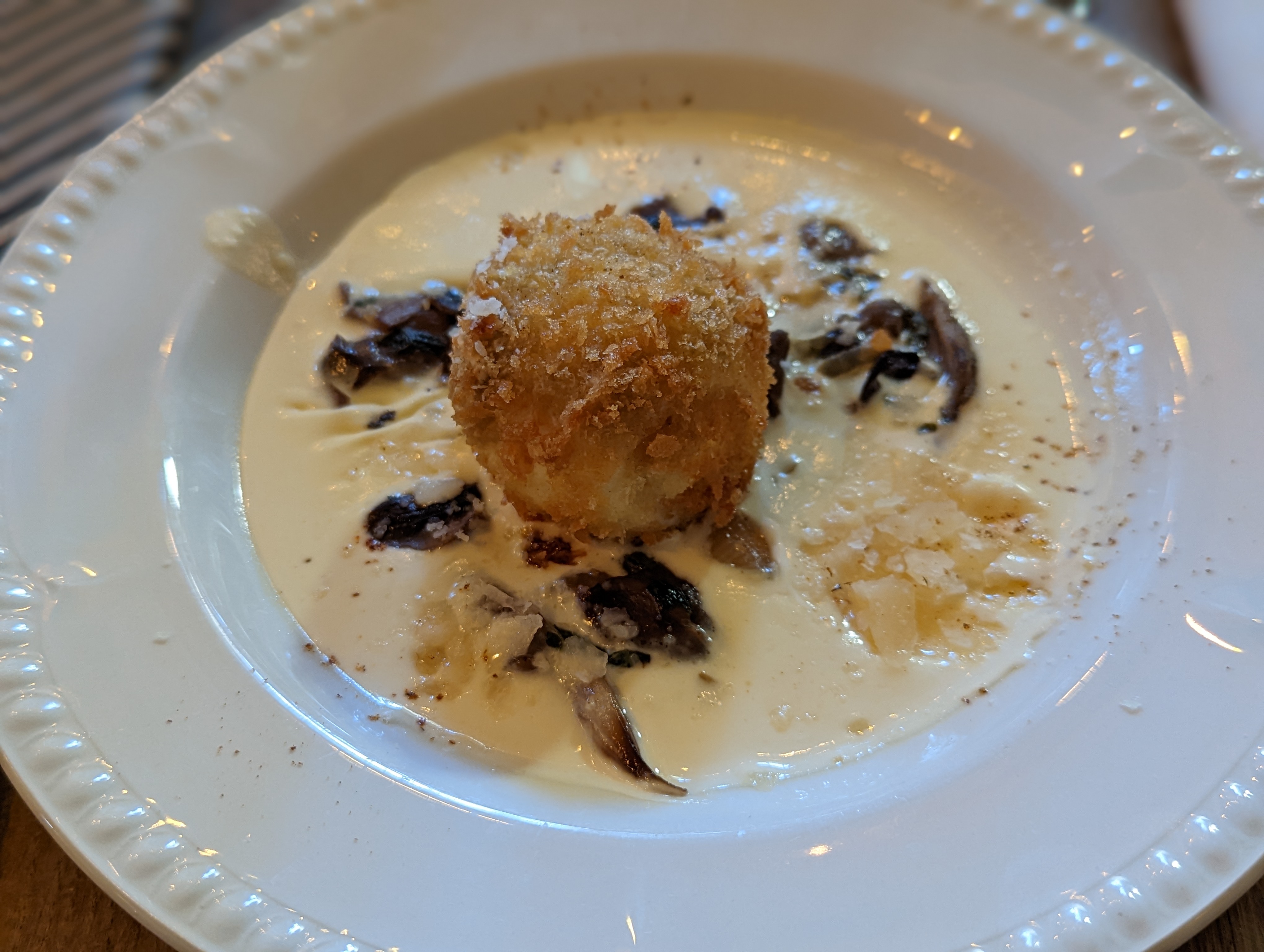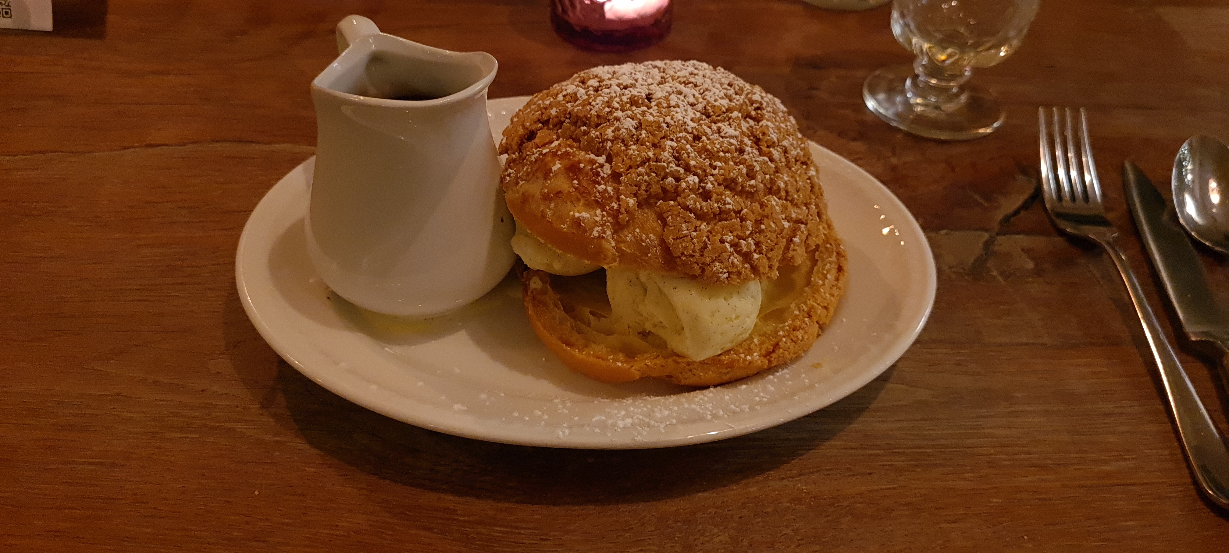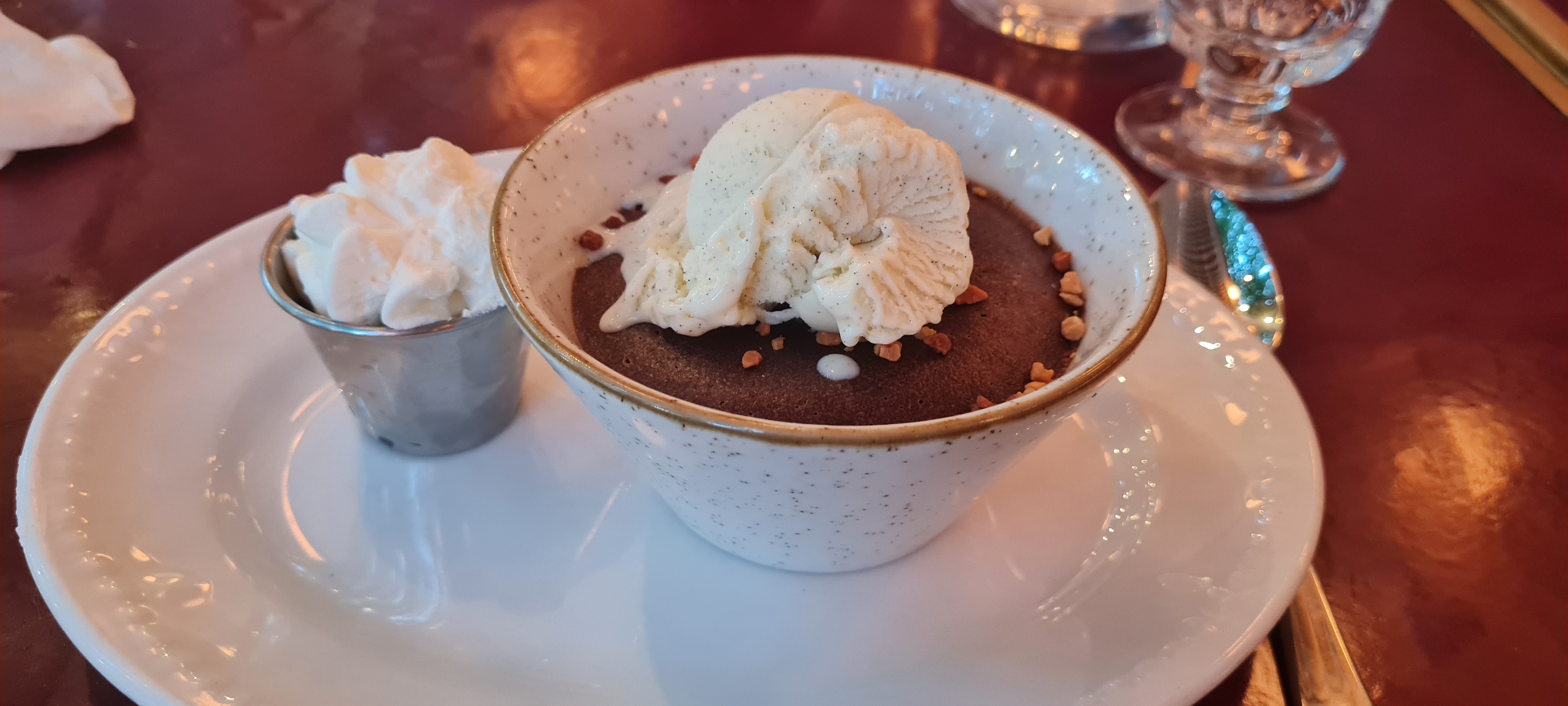 Bon restaurant. La salade césar ; assez bien. Bonne portion: bon morceaux de vrai poulet, très bon parmesan La salade de chèvre croustillante est un peu décevante. Juste salade et chèvre pané. Pas d’autres crudités. Tarte au chocolat. Bonne mais un peu petite. Profiterole : excellente! Le choux recouvert de craquelin est délicieux, la glace vanille est bonne. Le chocolat est assez bon, pas le meilleur que j’ai gouté, mais il se marie très bien avec la profiterole. Pain : correct Cadre magnifique. Service rapide et efficace.