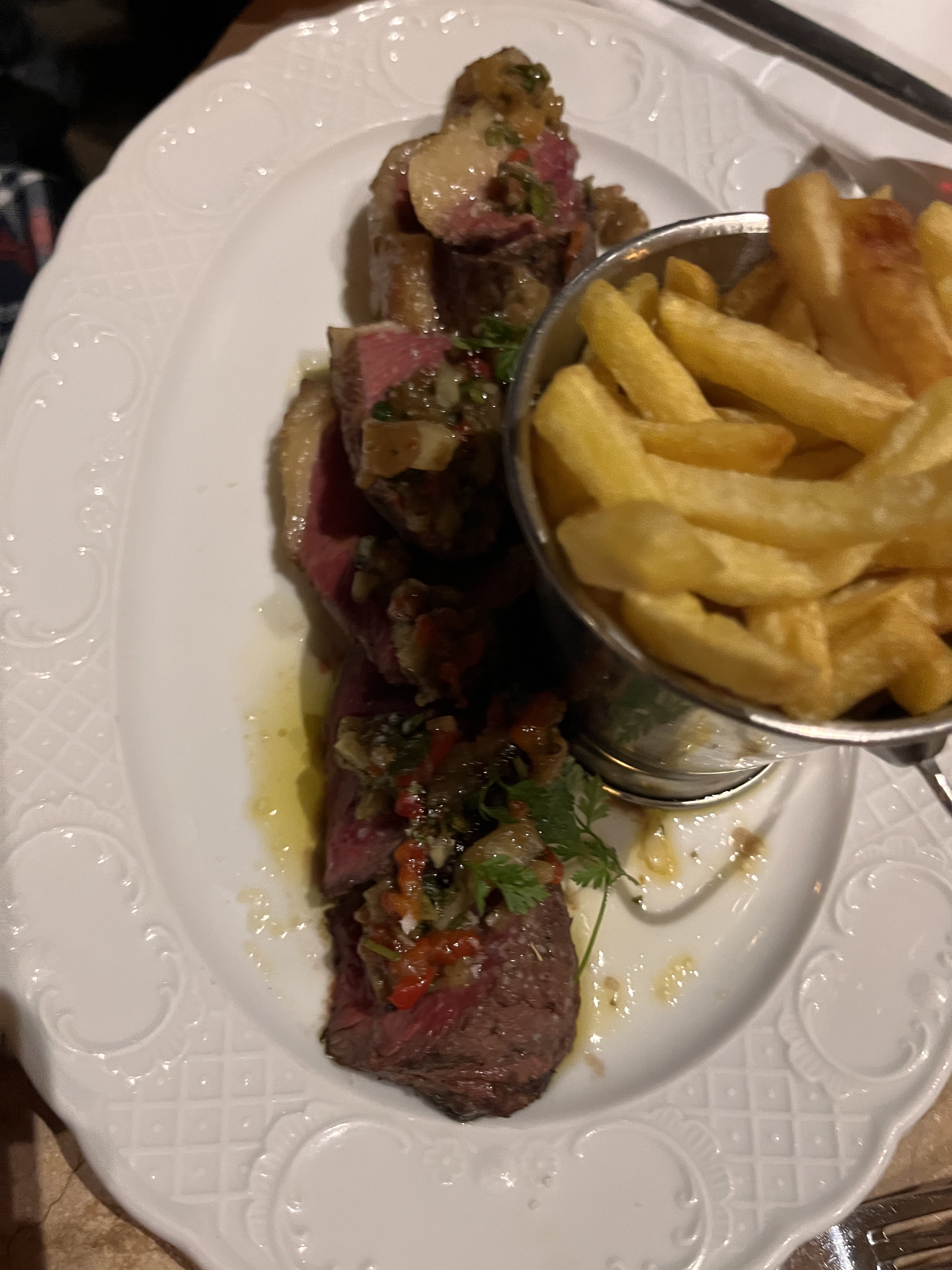Nous avons passé un bon moment (pour un anniversaire). Les plats sont TRÈS copieux et bien cuisiné. La viande était vraiment bonne. Les cocktails sont énormes. Petit bémol : j’avais demandé un changement de garniture avec mon plat et cela a été oublié. Mais cela n’enlève en rien la qualité.