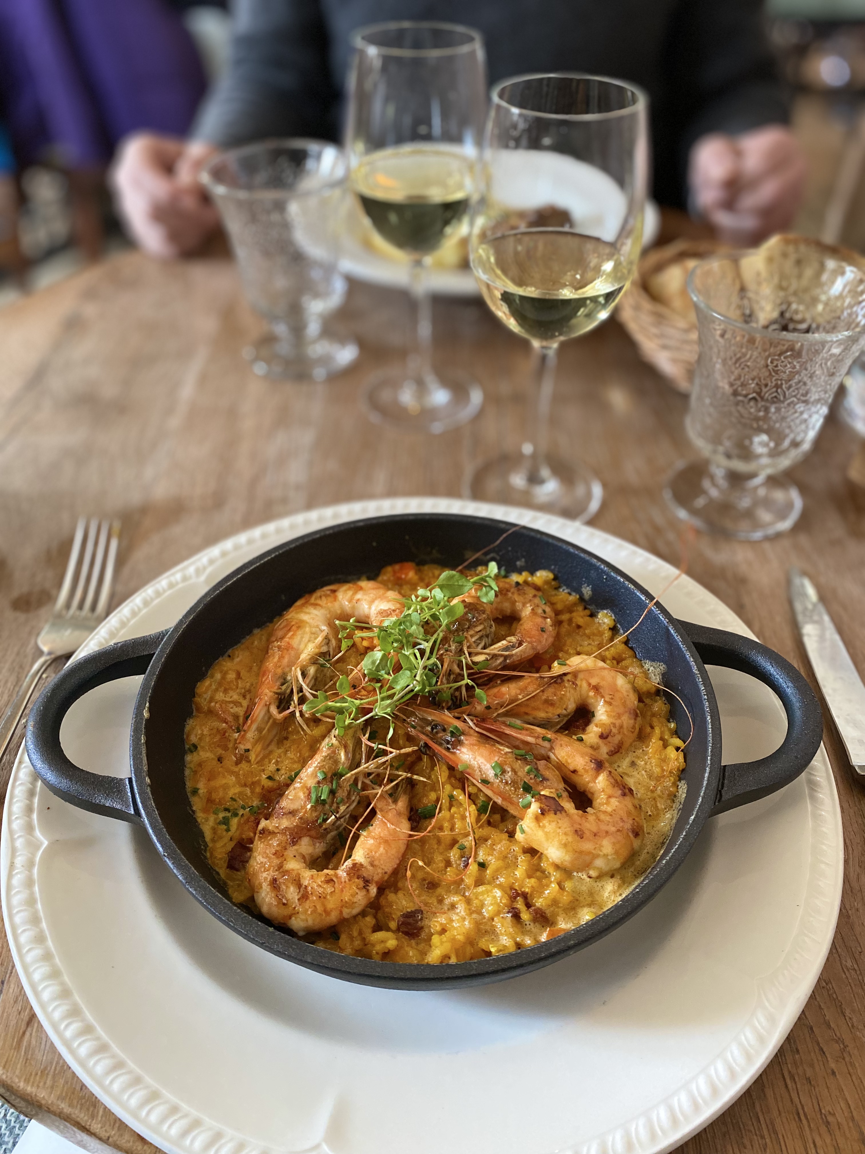 Bonjour arrives à 13h15 dans un cadre très agréable nous avons du attendre longtemps pour que notre commande soit prise.. A noter que les chaises ne sont pas très confortables La description des plats avec des produits de qualité mais peu connus font que l on ne sait pas ce que l on va manger. Petit bémol le prix de 2 gambas Grillèes en entrée pour 14.50 euros est abusif.. Enfin à 14h45 nous n avions toujours nos plats.. Pour conclure une addition chere . Venir prendre un cocktail après une balade OK mais pas. Plus.