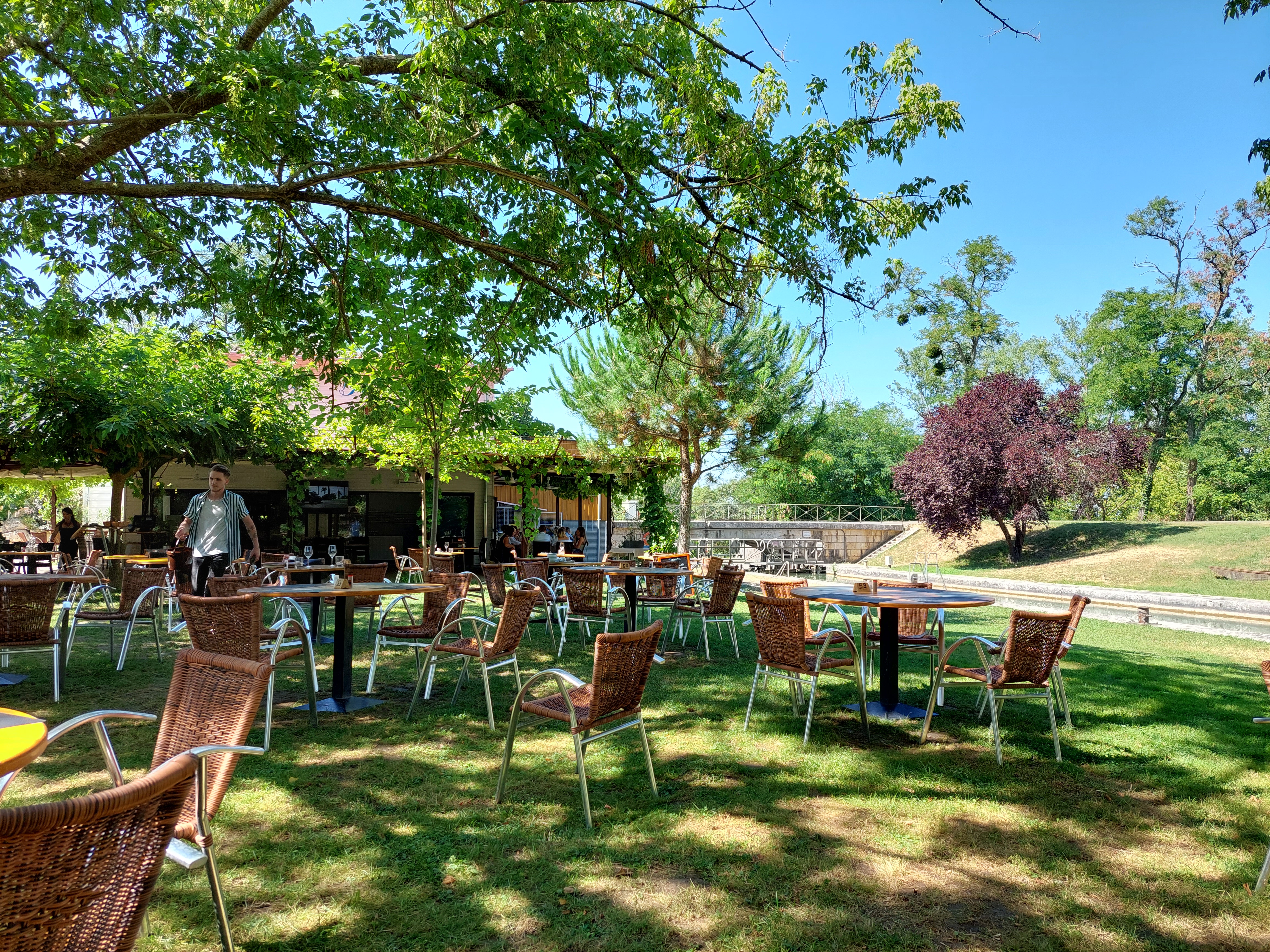 Nouveauté pour l'été 2018 ! Un café-terrasse aéré et moderne au bord du Canal du Garonne Midi et de la Baïse. Repas et service complets, vin, crêpes et glaces.
