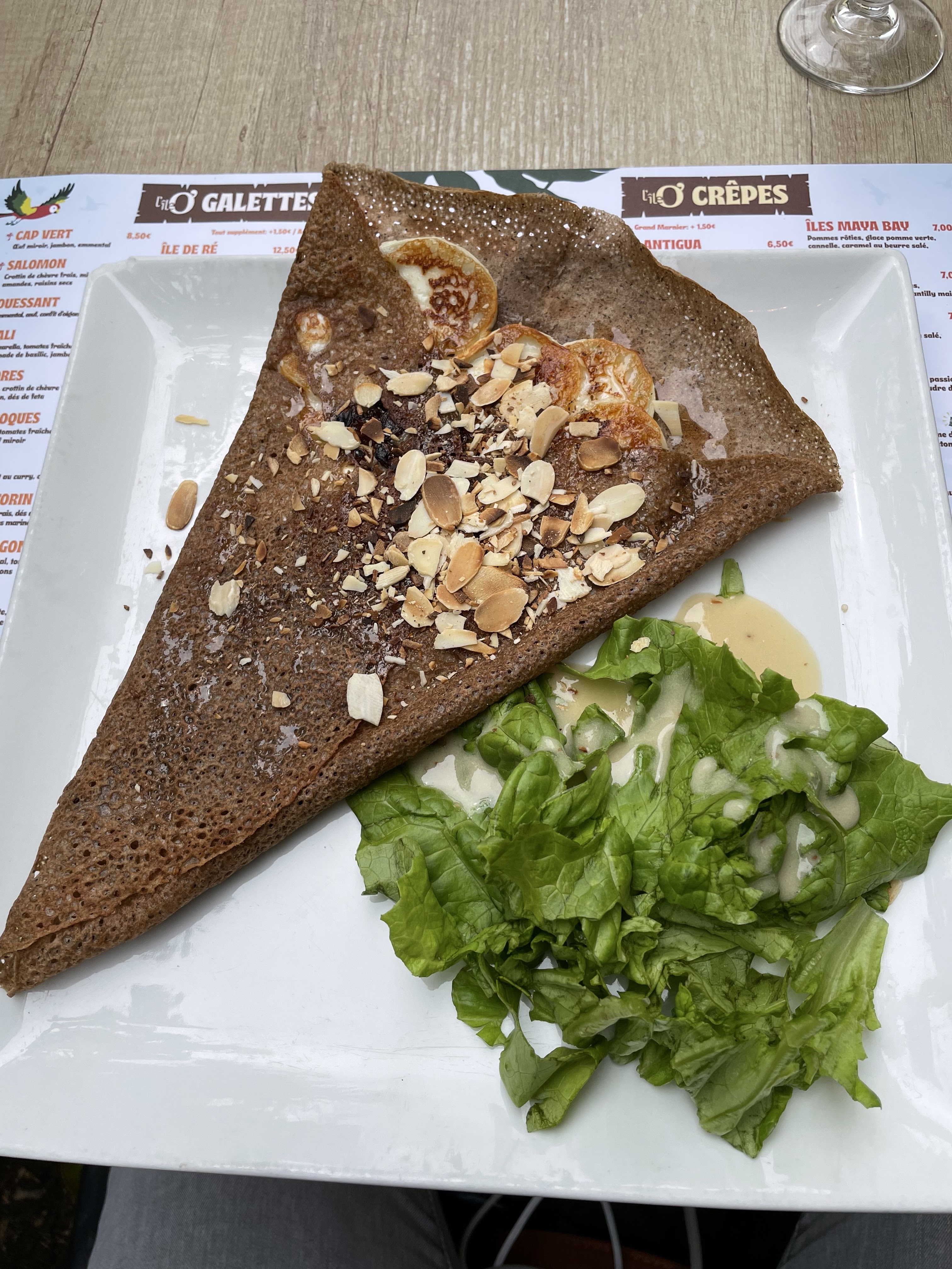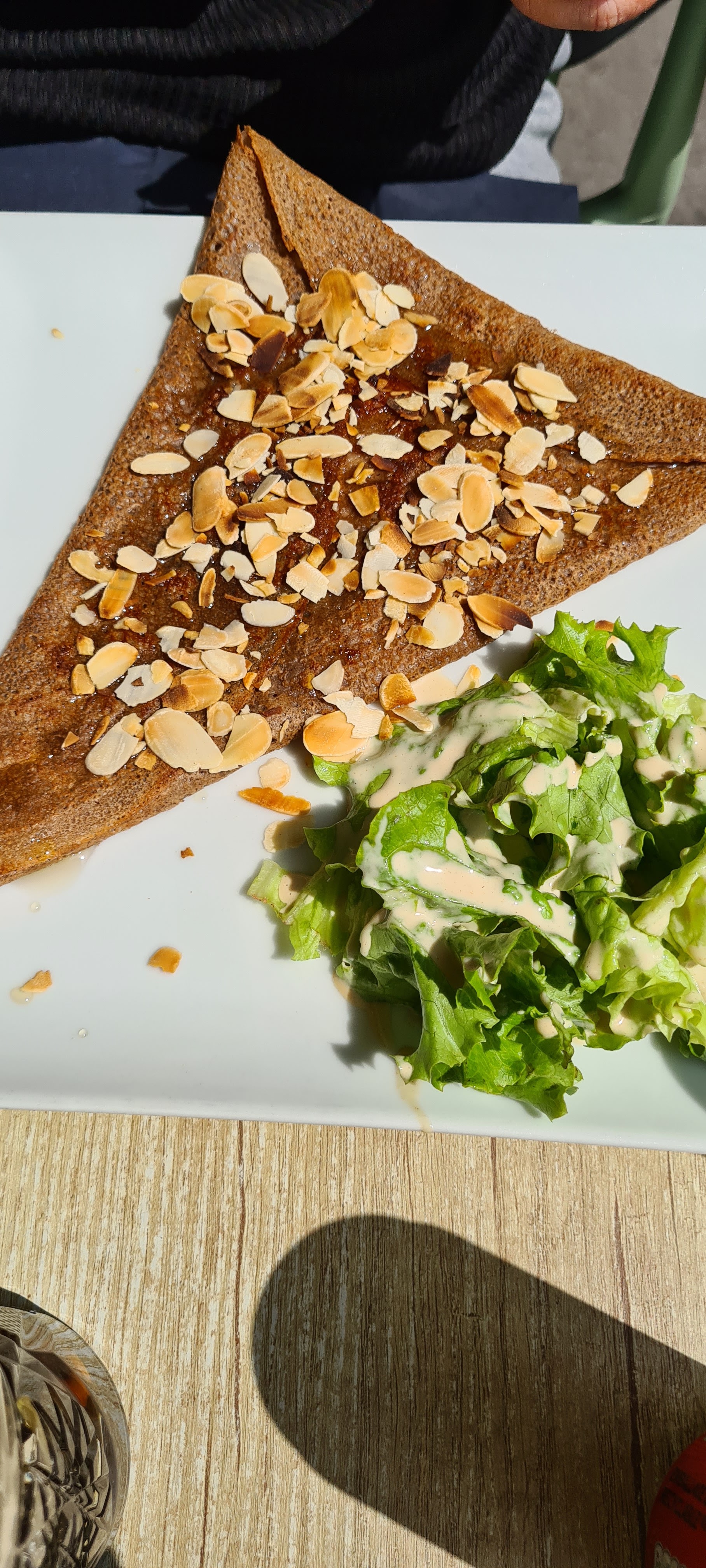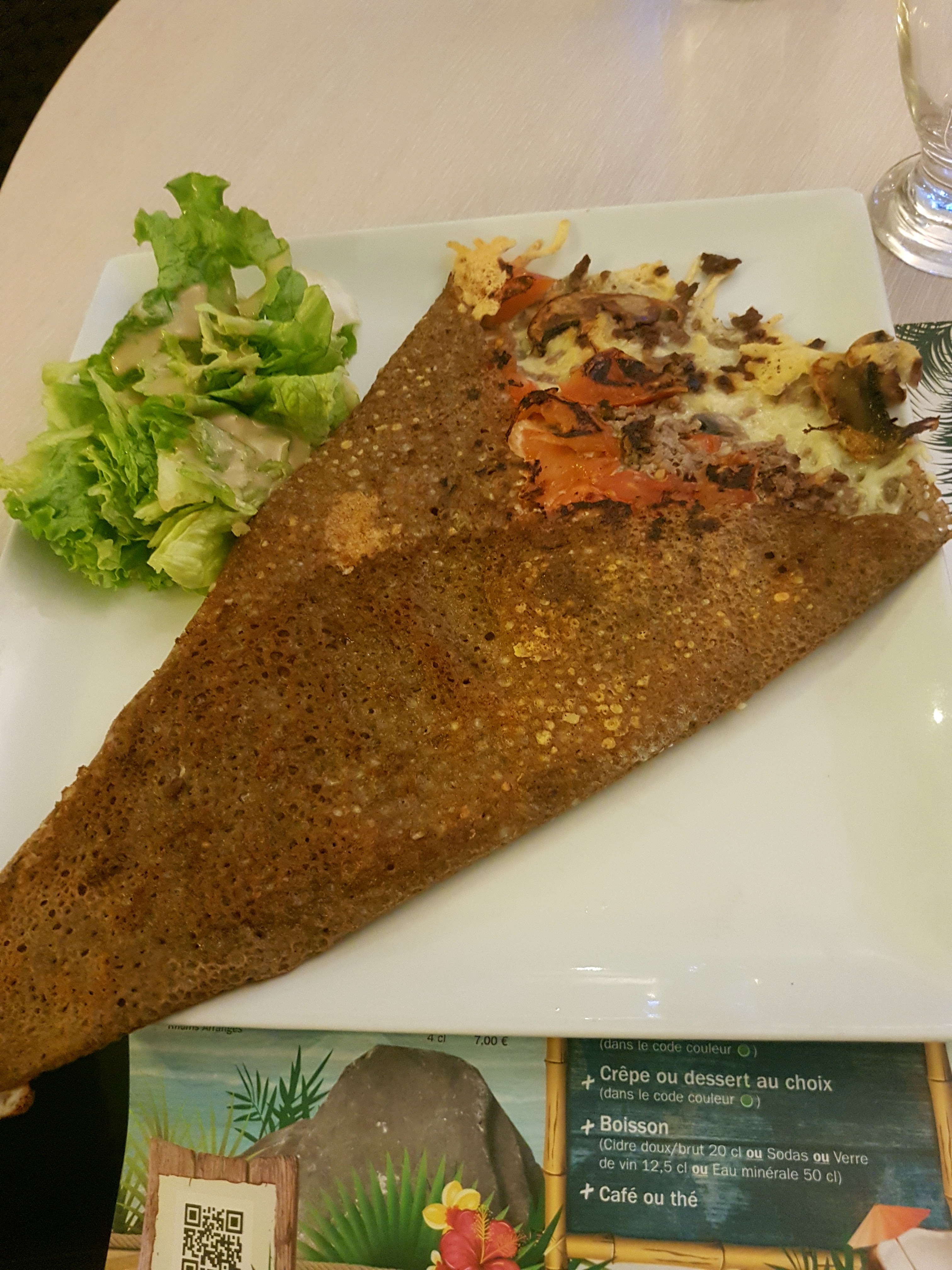 J’avais réservé une table de 15 personnes pour y déjeuner après la visite du musée et du jardin d’Albert Kahn juste en face. On a déjeuné au 1ier étage. Les crêpes portent toutes le nom d’une île ce qui est original mais en plus elles étaient garnies avec des ingrédients inhabituels comme des courgettes par exemple. En tout cas elles étaient délicieuses.
